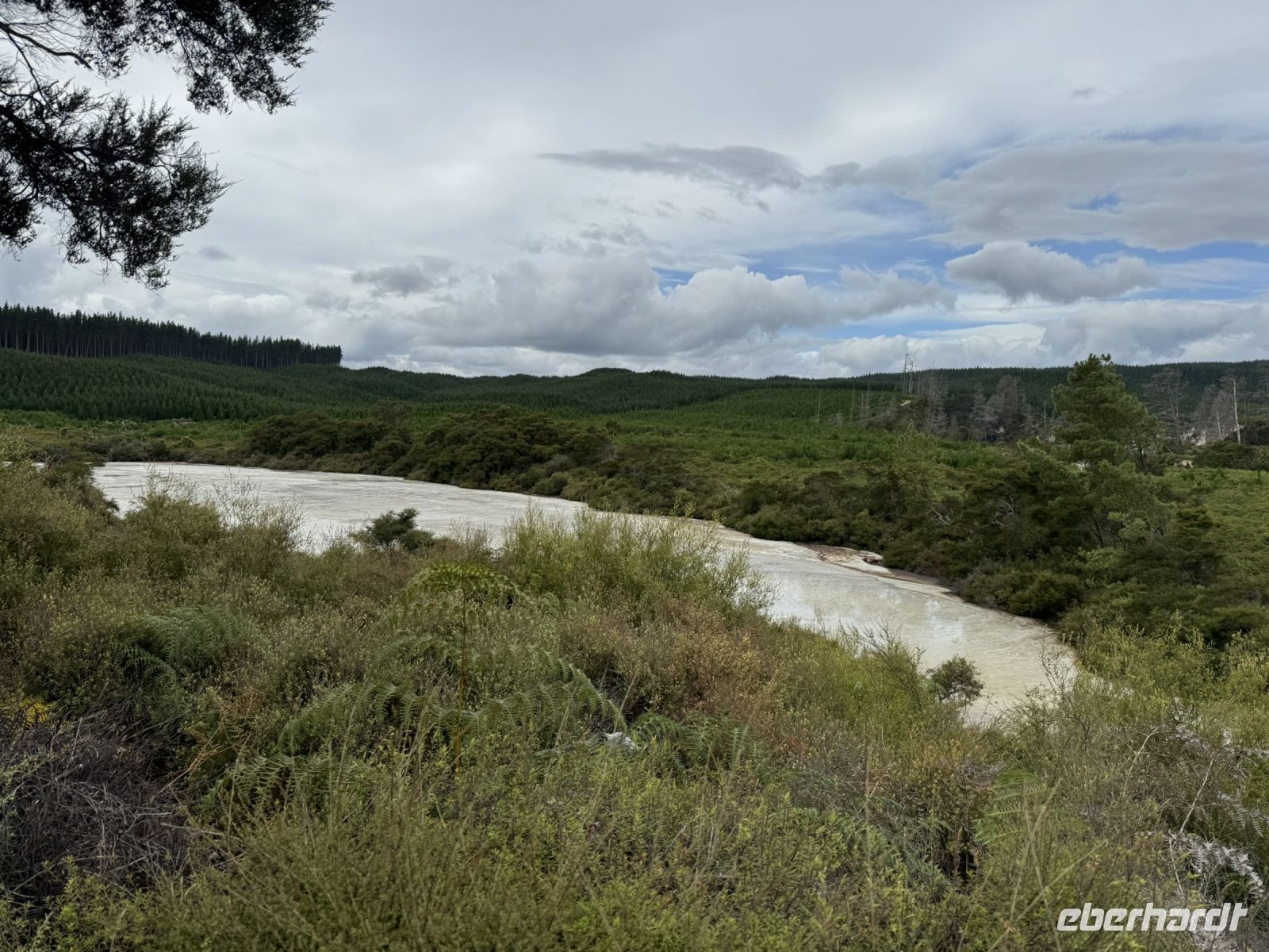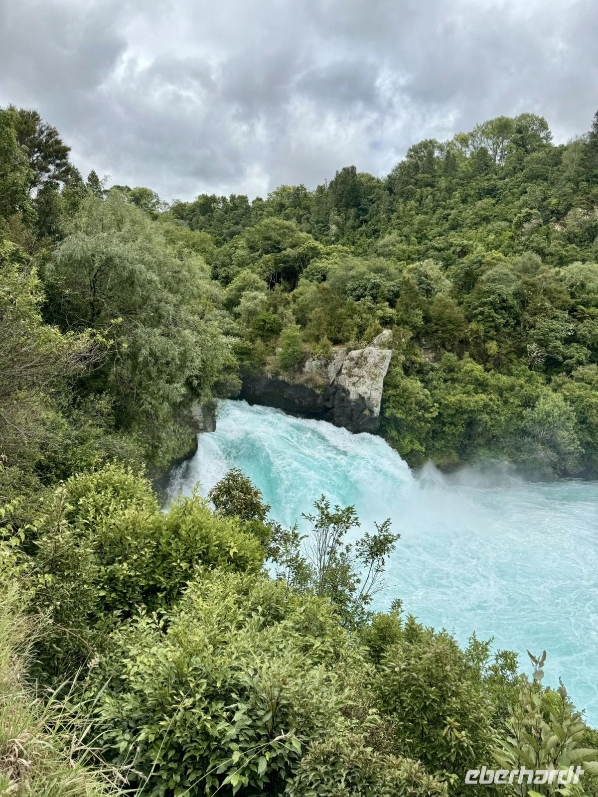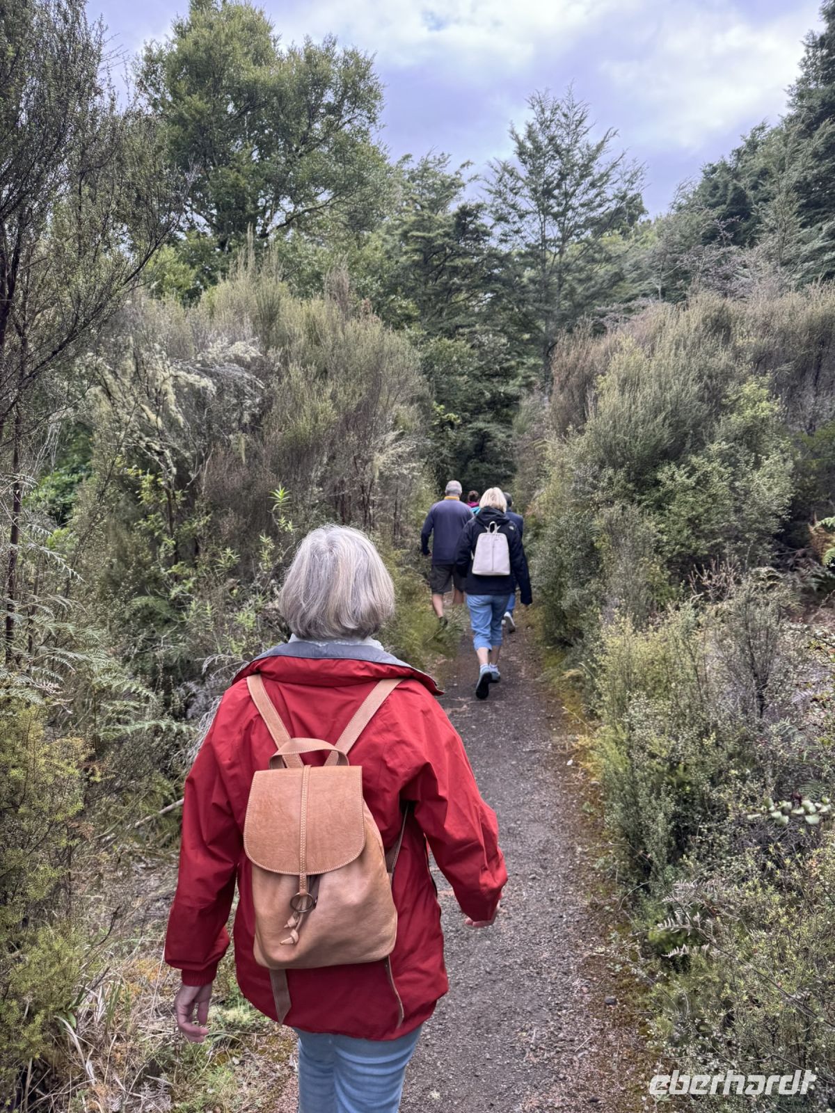 Nach dem Frühstück machten wir eine Stadtrundfahrt durch den Badeort direkt am See Rotorua und hatten unsere Shopping-Momente. Anschließend fuhren wir in Richtung Süden nach Wairakei, um die beeindruckenden Huka Wasserfälle zu sehen. Über 200.000 Liter Wasser stürzen dort pro Minute hinunter! Wir fuhren weiter am Taupo-See vorbei, der sich in einem alten Krater befindet. Dank des Sonnenscheins waren die Ausblicke fantastisch und wir konnten die Fahrt richtig genießen. In Motuoapa machten wir unsere Mittagspause und hielten für einen letzten Fotostopp am Taupo-See an. Danach wanderten wir im Tongariro Nationalpark zum Rotopounamu See. Zunächst mussten wir einen steilen Anstieg von über 130 Metern Höhenunterschied bis zum Ufer des Sees bewältigen. Auf einer Höhe von 700 Metern erreichten wir den See und spazierten entlang des Waldes am Ufer, wo wir auch kleine Strände entdeckten. Anschließend setzten wir unsere Fahrt fort nach Ohakune.