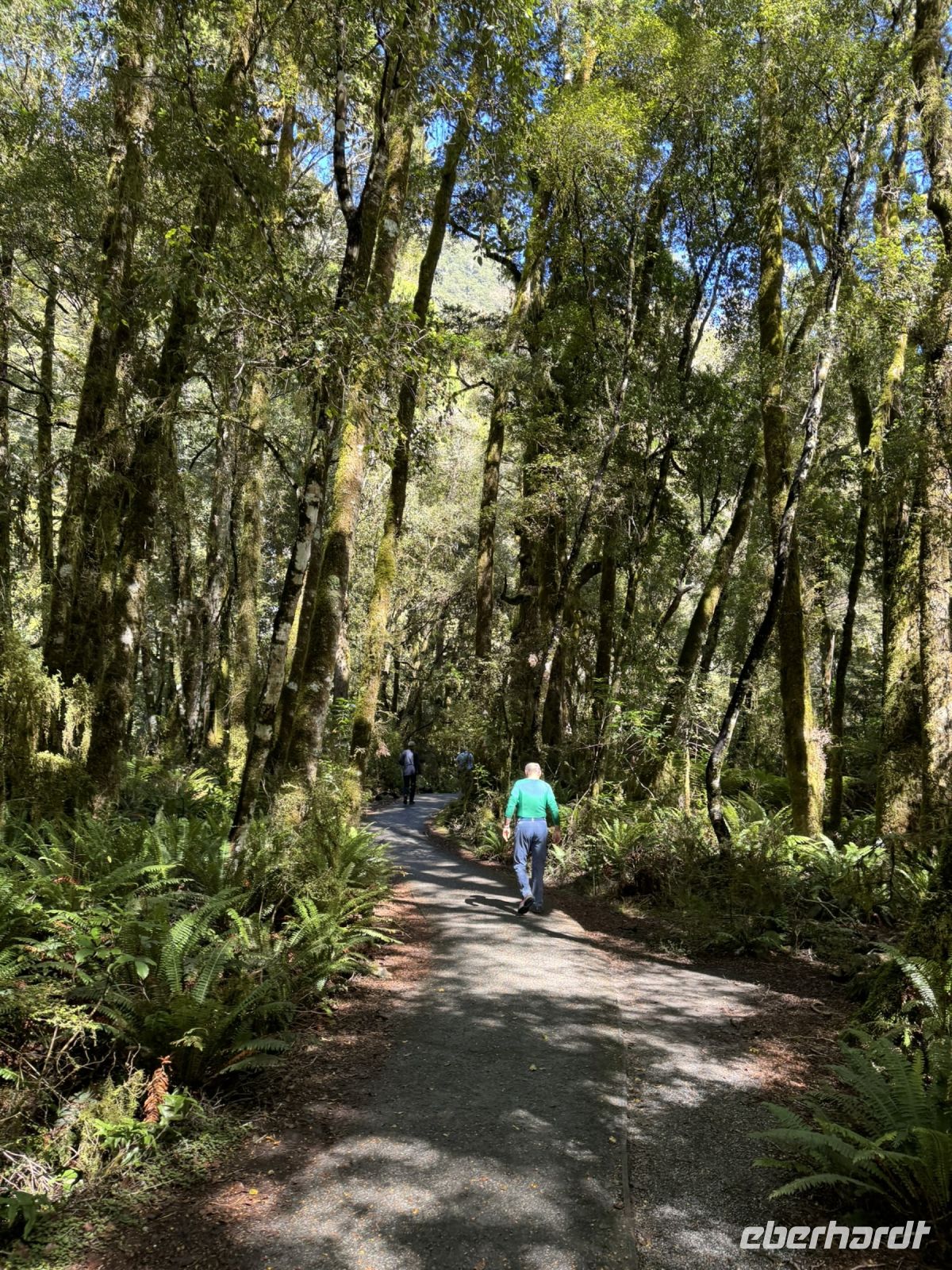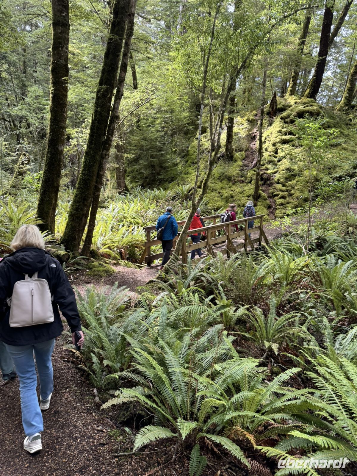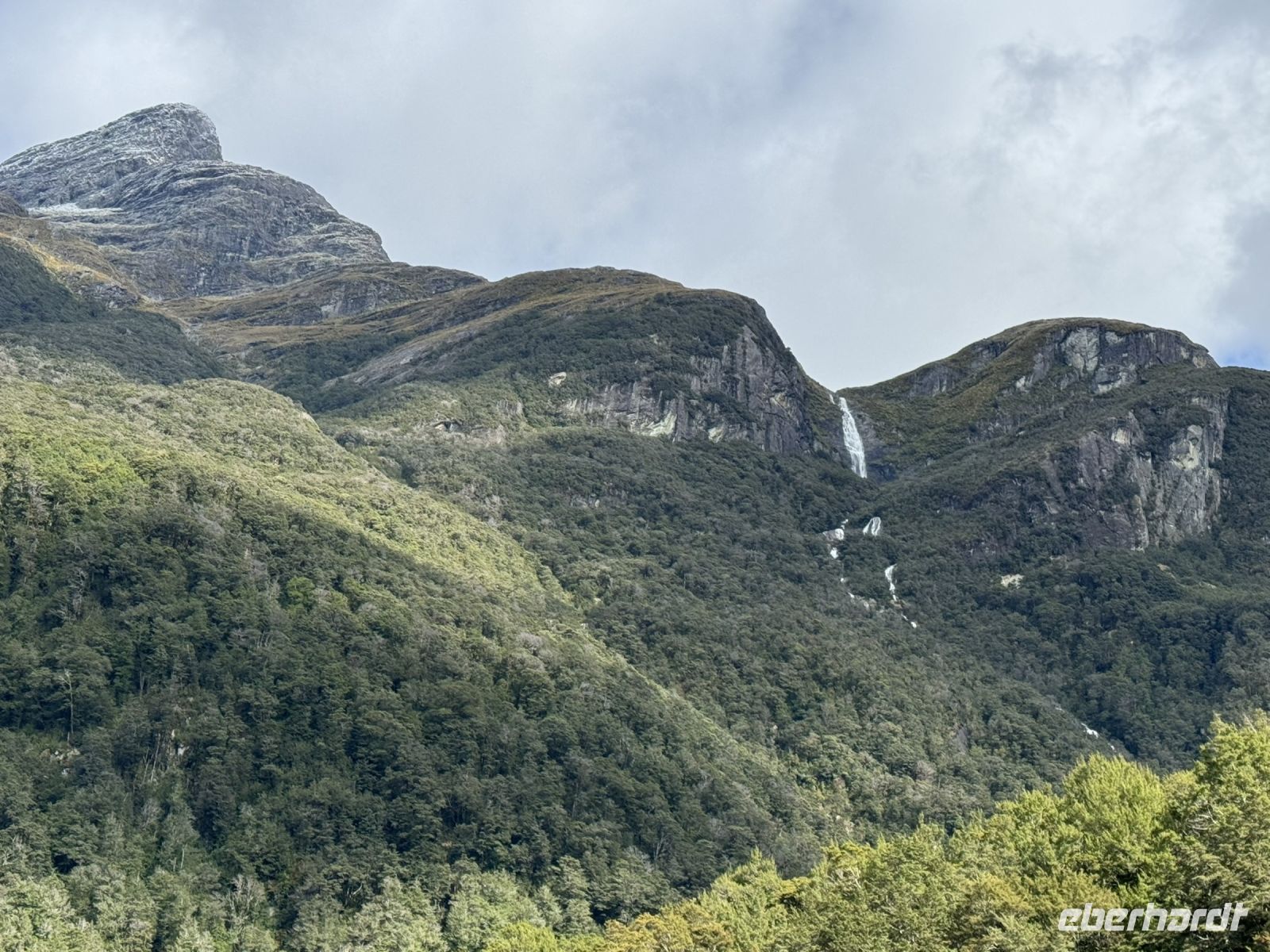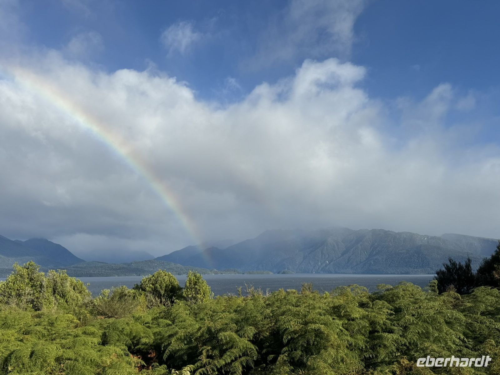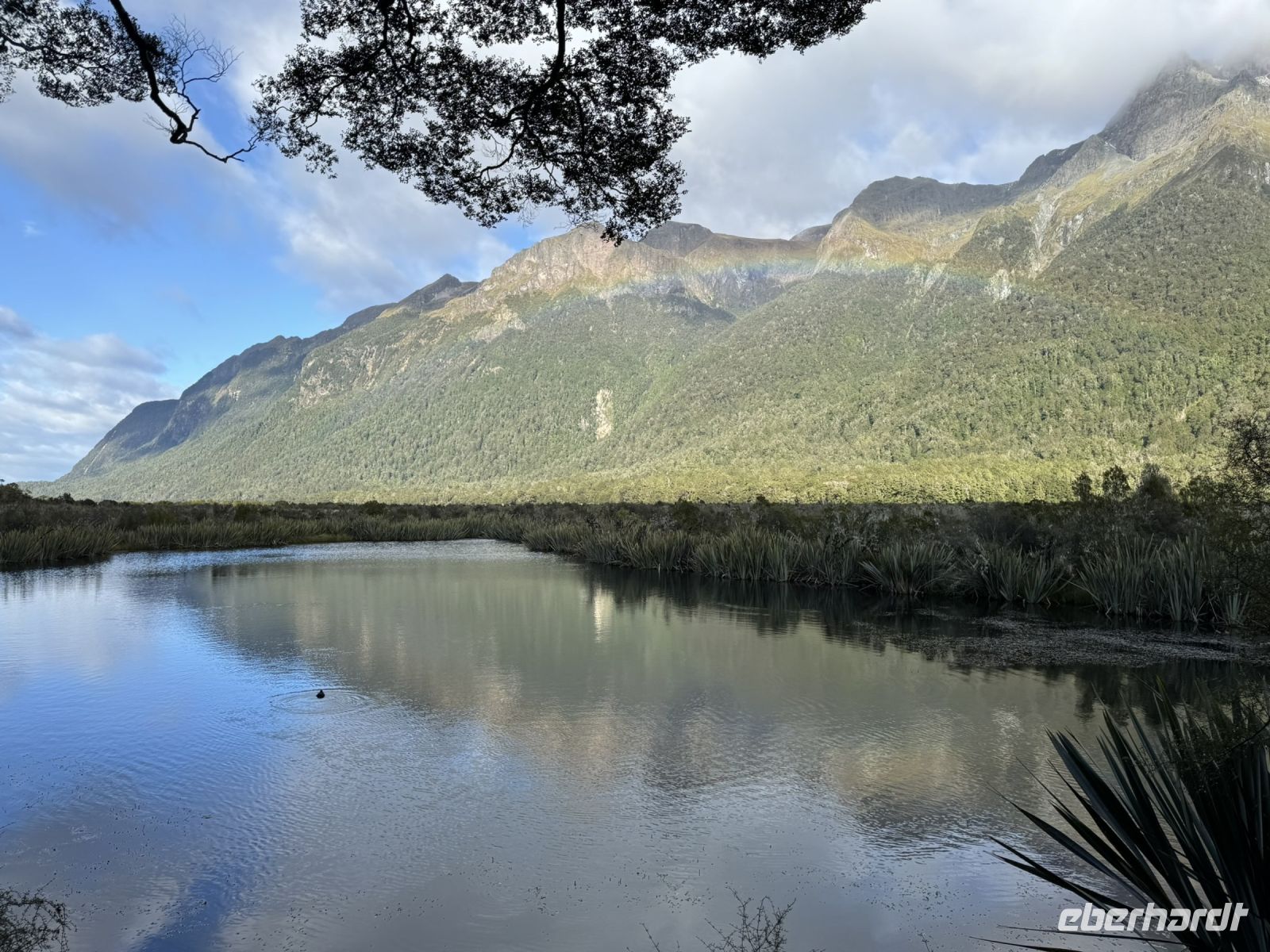 Am Morgen begrüßte uns ein wunderschöner Regenbogen am Himmel, während wir gemächlich und entspannt auf Panoramastraßen Richtung Milford Sound fuhren. Unterwegs machten wir einige Fotostopps, darunter im Eglinton Valley mit seinem imposanten Bergpanorama im Hintergrund. Dort besuchten wir auch den Spiegel-See. Obwohl es im Hollyford Valley regnete, konnten wir dennoch wunderschöne Wasserfälle sehen. Am Monkey Creek riefen wir nach den Keas, aber sie schienen noch beim Frühstück zu sein. Im The Chasm machten wir einen Spaziergang durch den Wald.