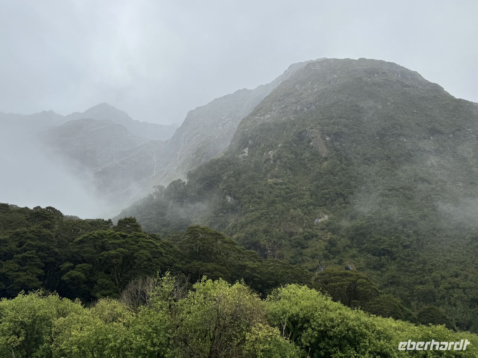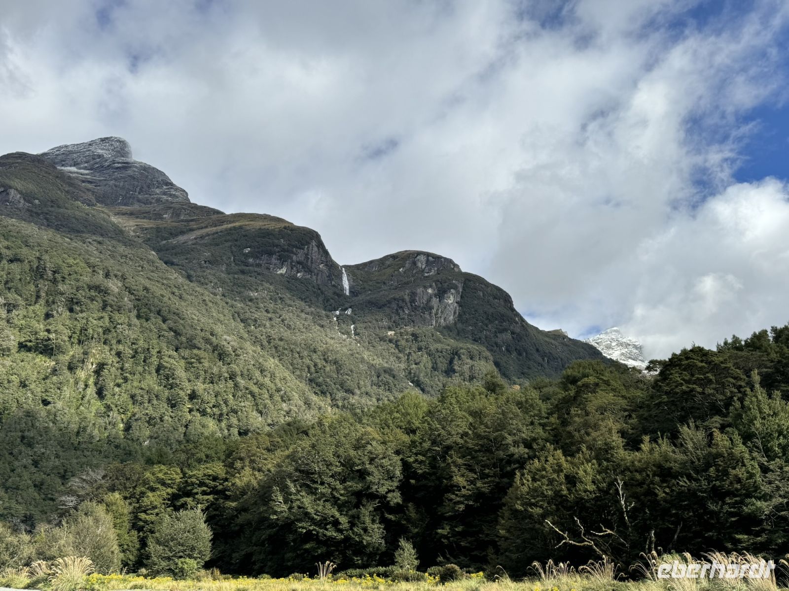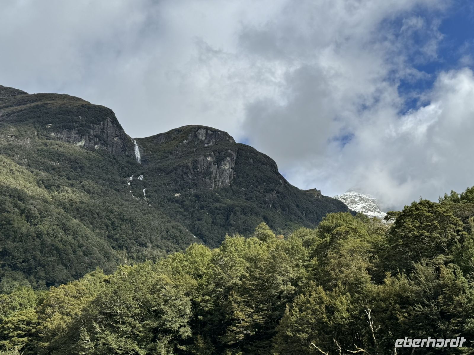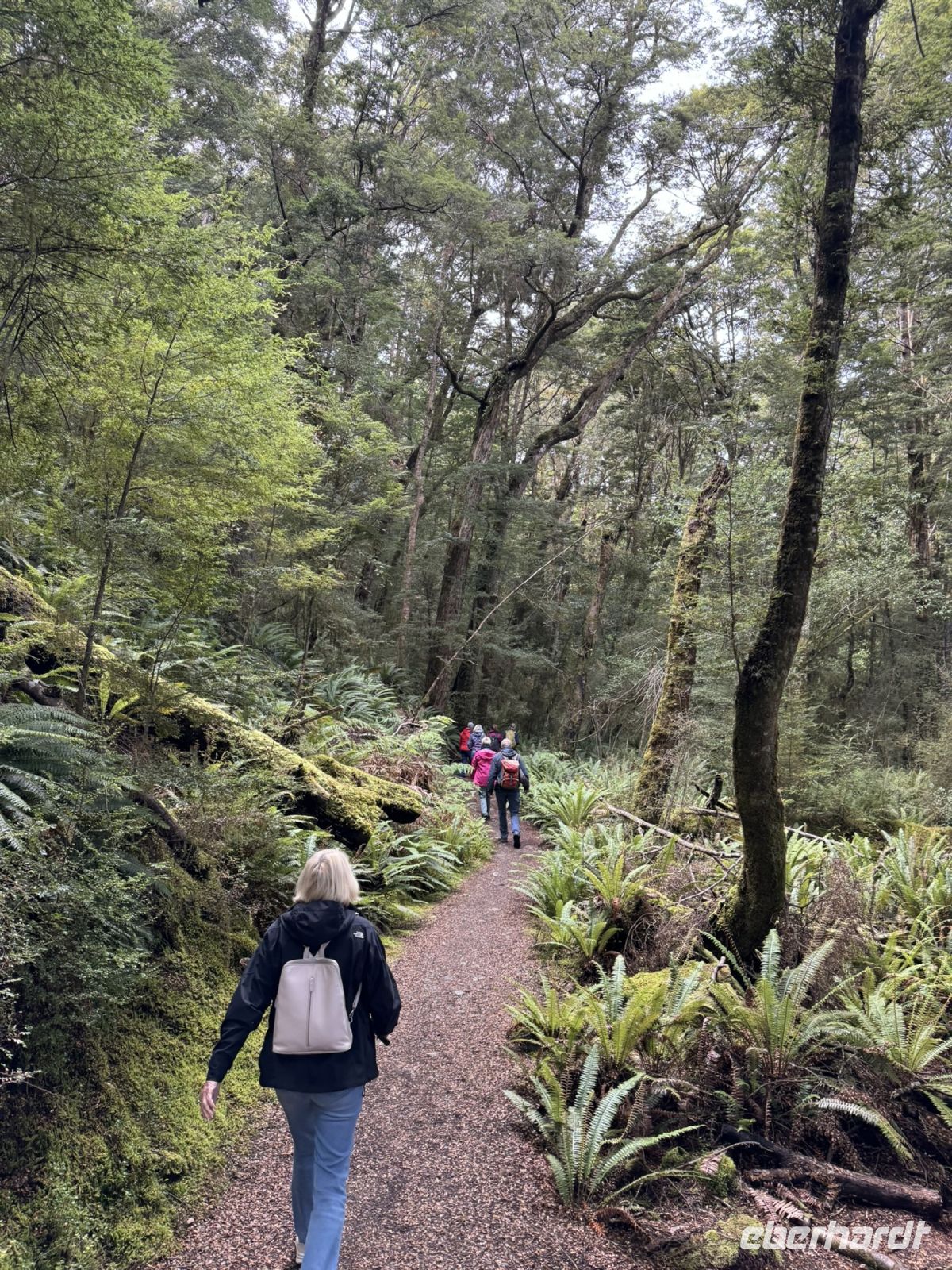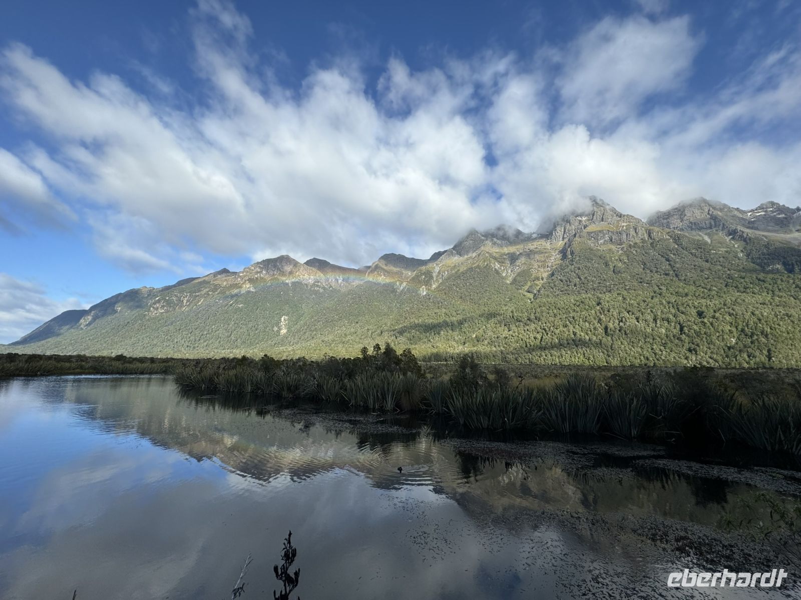 Am Morgen begrüßte uns ein wunderschöner Regenbogen am Himmel, während wir gemächlich und entspannt auf Panoramastraßen Richtung Milford Sound fuhren. Unterwegs machten wir einige Fotostopps, darunter im Eglinton Valley mit seinem imposanten Bergpanorama im Hintergrund. Dort besuchten wir auch den Spiegel-See. Obwohl es im Hollyford Valley regnete, konnten wir dennoch wunderschöne Wasserfälle sehen. Am Monkey Creek riefen wir nach den Keas, aber sie schienen noch beim Frühstück zu sein. Im The Chasm machten wir einen Spaziergang durch den Wald.