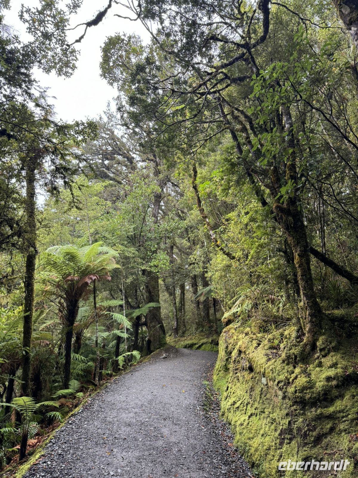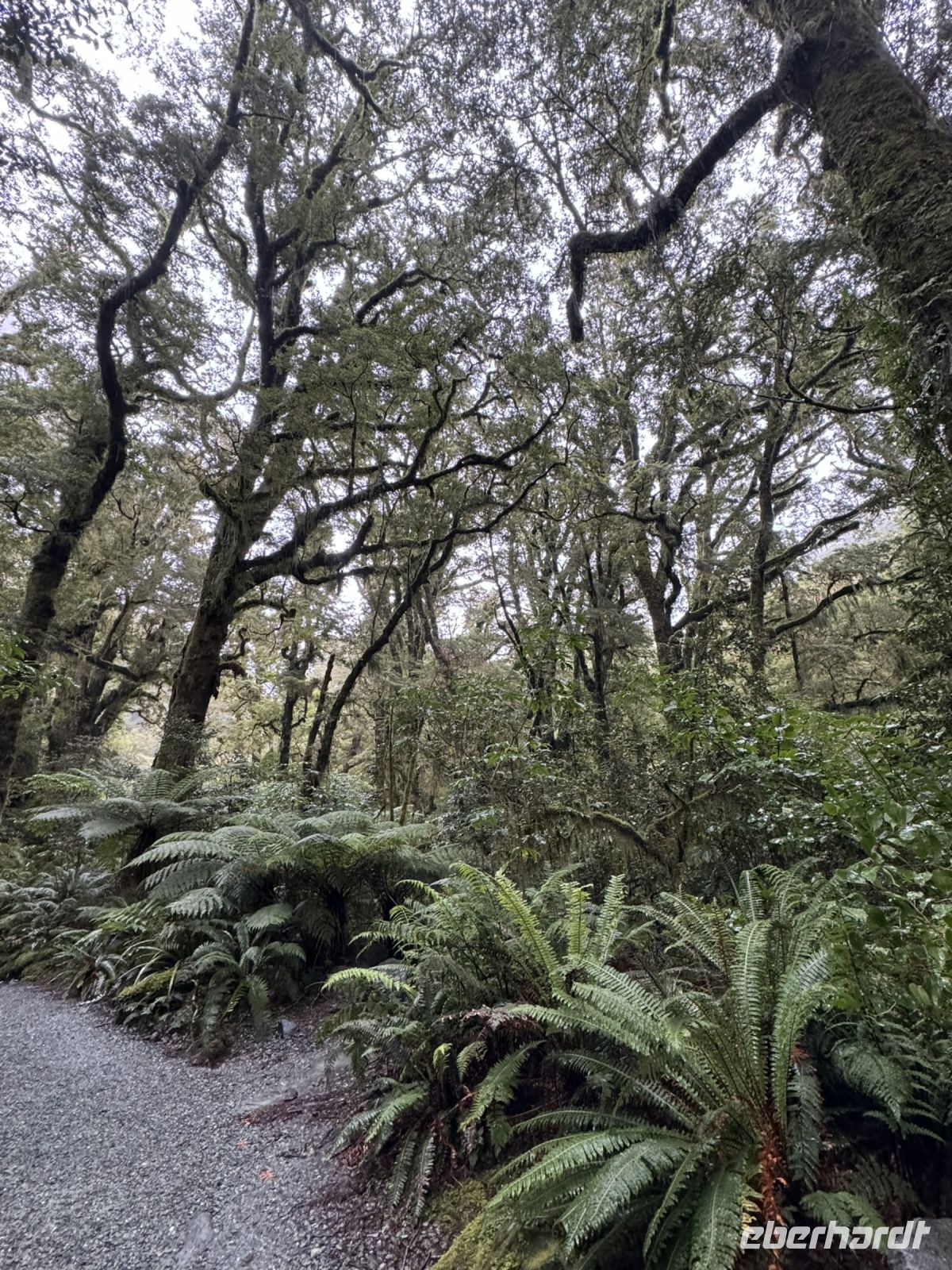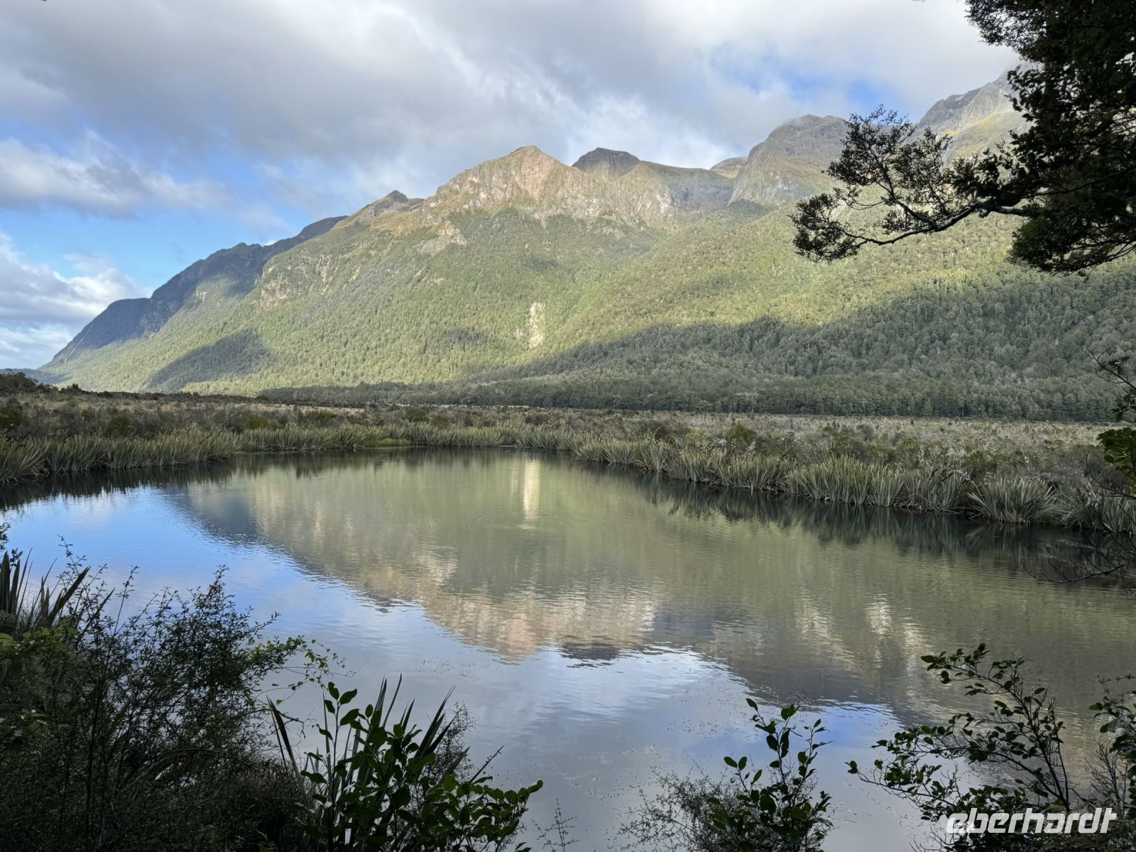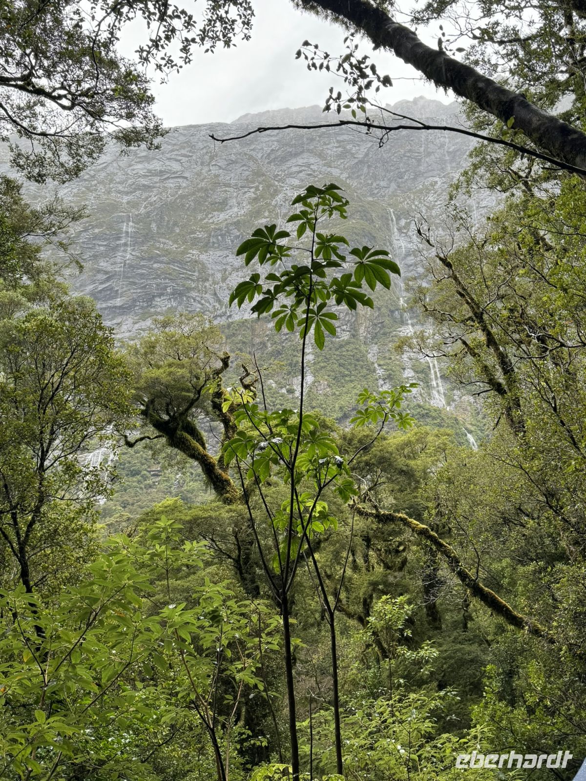 Am Morgen begrüßte uns ein wunderschöner Regenbogen am Himmel, während wir gemächlich und entspannt auf Panoramastraßen Richtung Milford Sound fuhren. Unterwegs machten wir einige Fotostopps, darunter im Eglinton Valley mit seinem imposanten Bergpanorama im Hintergrund. Dort besuchten wir auch den Spiegel-See. Obwohl es im Hollyford Valley regnete, konnten wir dennoch wunderschöne Wasserfälle sehen. Am Monkey Creek riefen wir nach den Keas, aber sie schienen noch beim Frühstück zu sein. Im The Chasm machten wir einen Spaziergang durch den Wald.