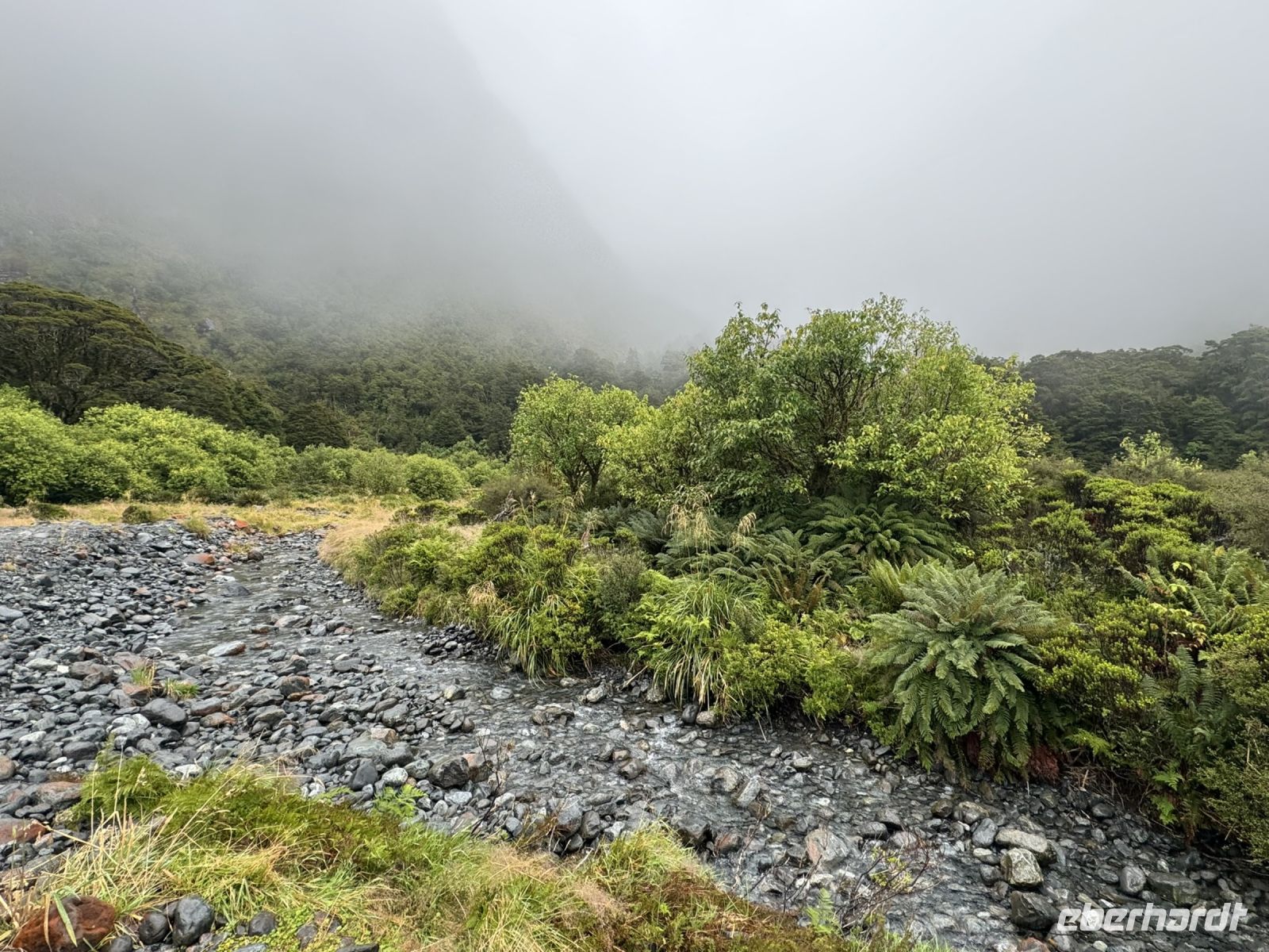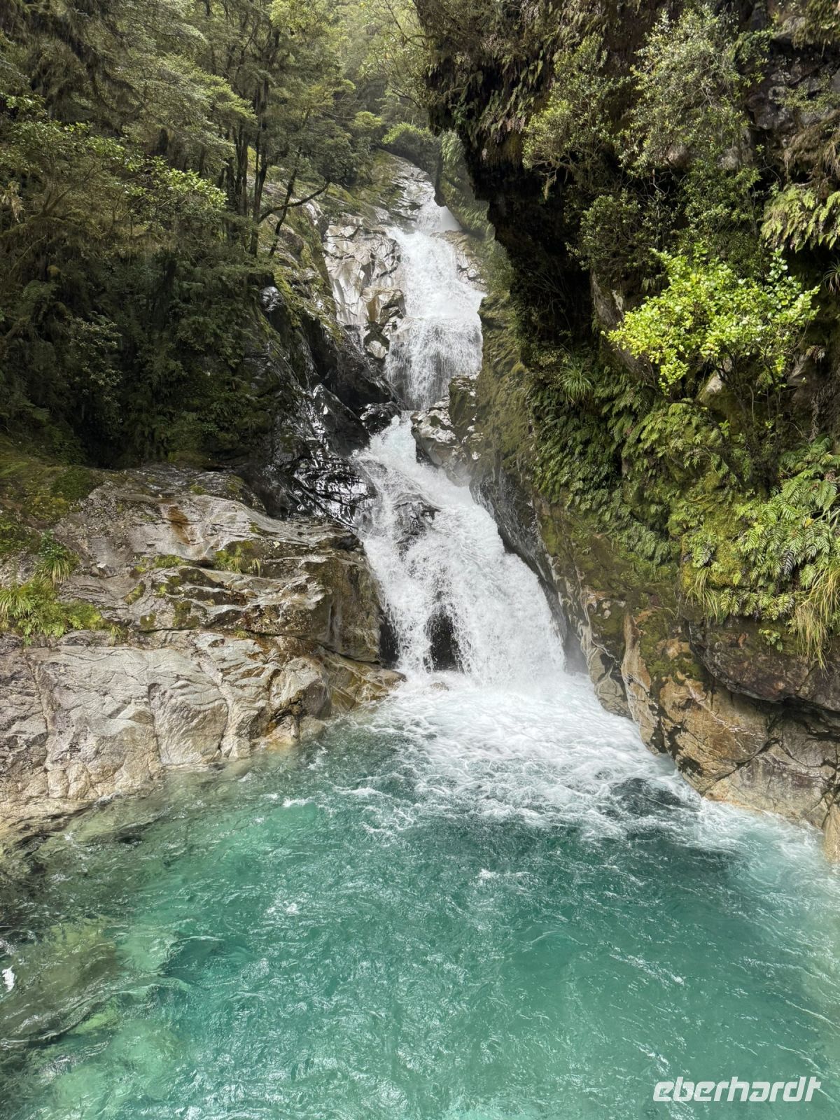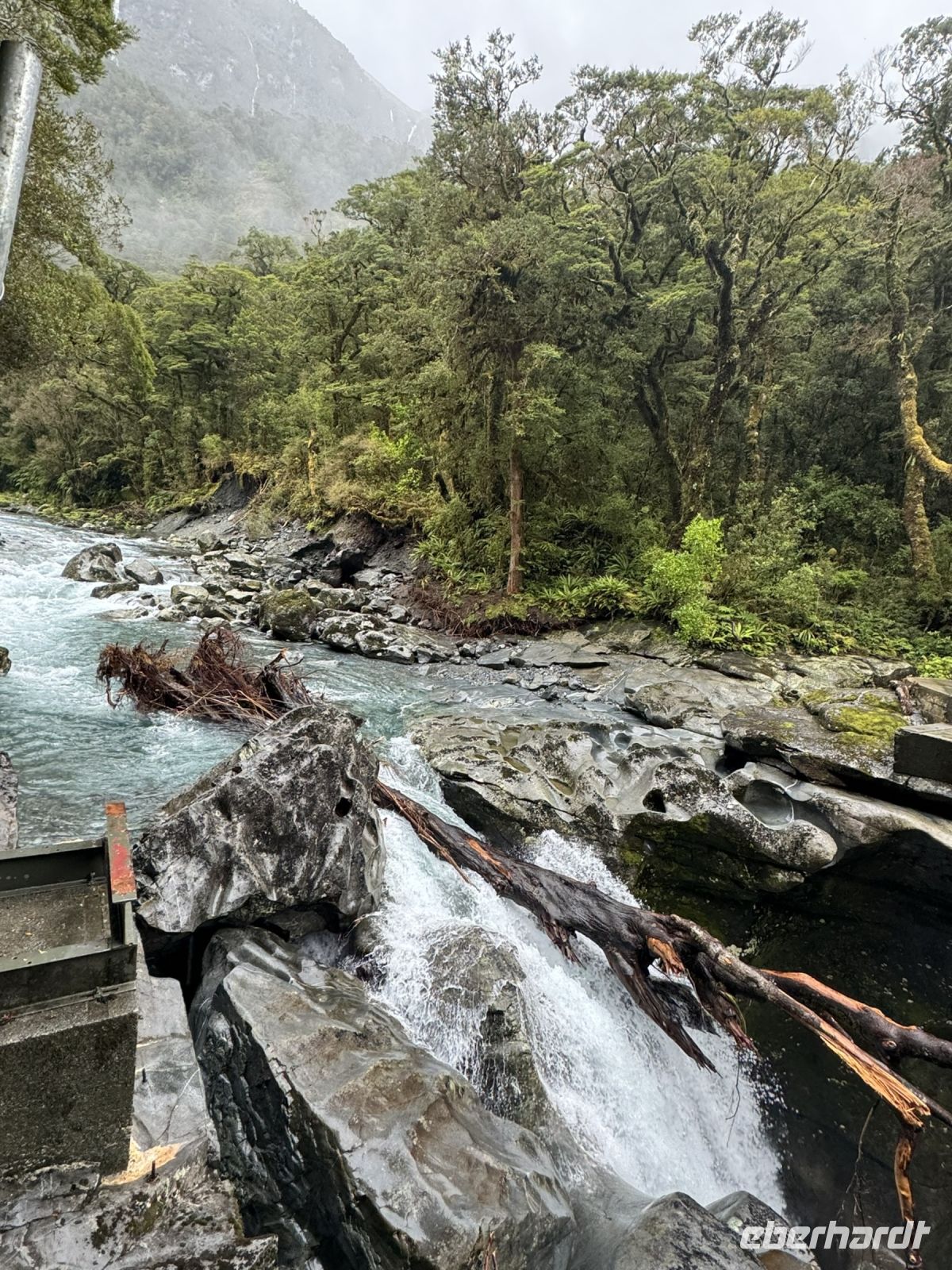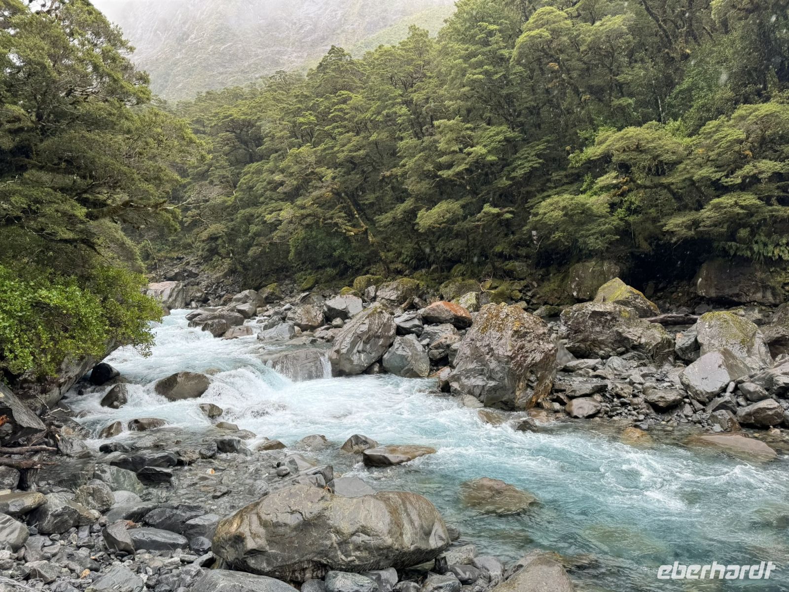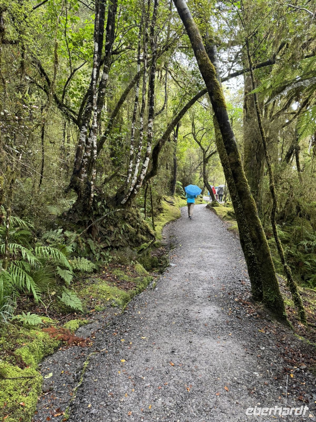 Am Morgen begrüßte uns ein wunderschöner Regenbogen am Himmel, während wir gemächlich und entspannt auf Panoramastraßen Richtung Milford Sound fuhren. Unterwegs machten wir einige Fotostopps, darunter im Eglinton Valley mit seinem imposanten Bergpanorama im Hintergrund. Dort besuchten wir auch den Spiegel-See. Obwohl es im Hollyford Valley regnete, konnten wir dennoch wunderschöne Wasserfälle sehen. Am Monkey Creek riefen wir nach den Keas, aber sie schienen noch beim Frühstück zu sein. Im The Chasm machten wir einen Spaziergang durch den Wald.