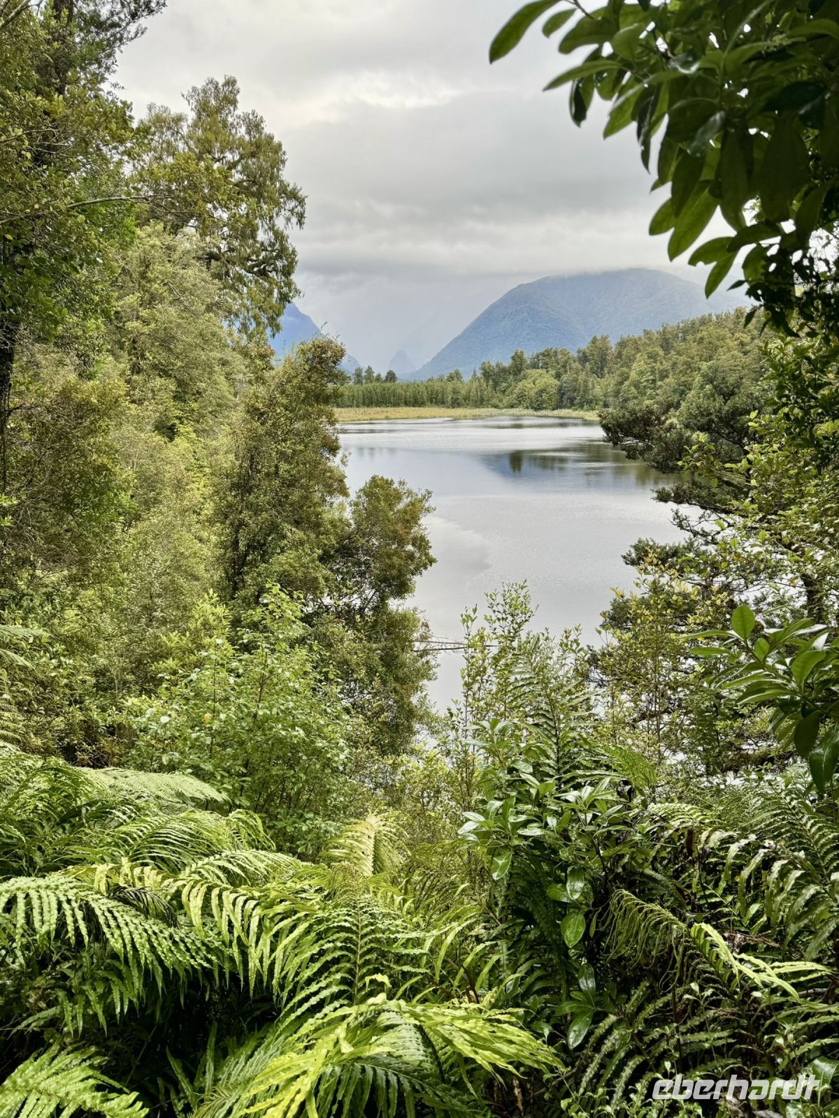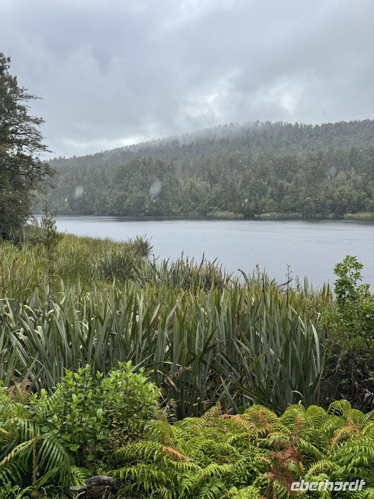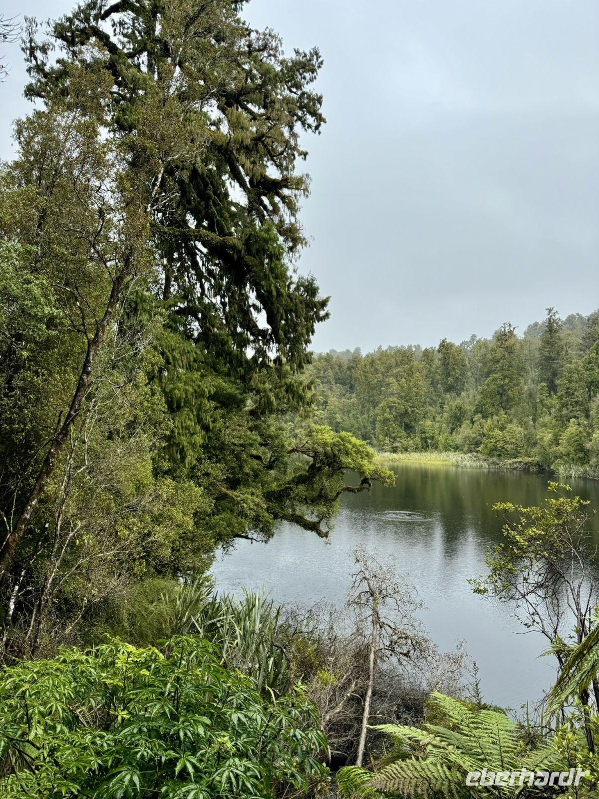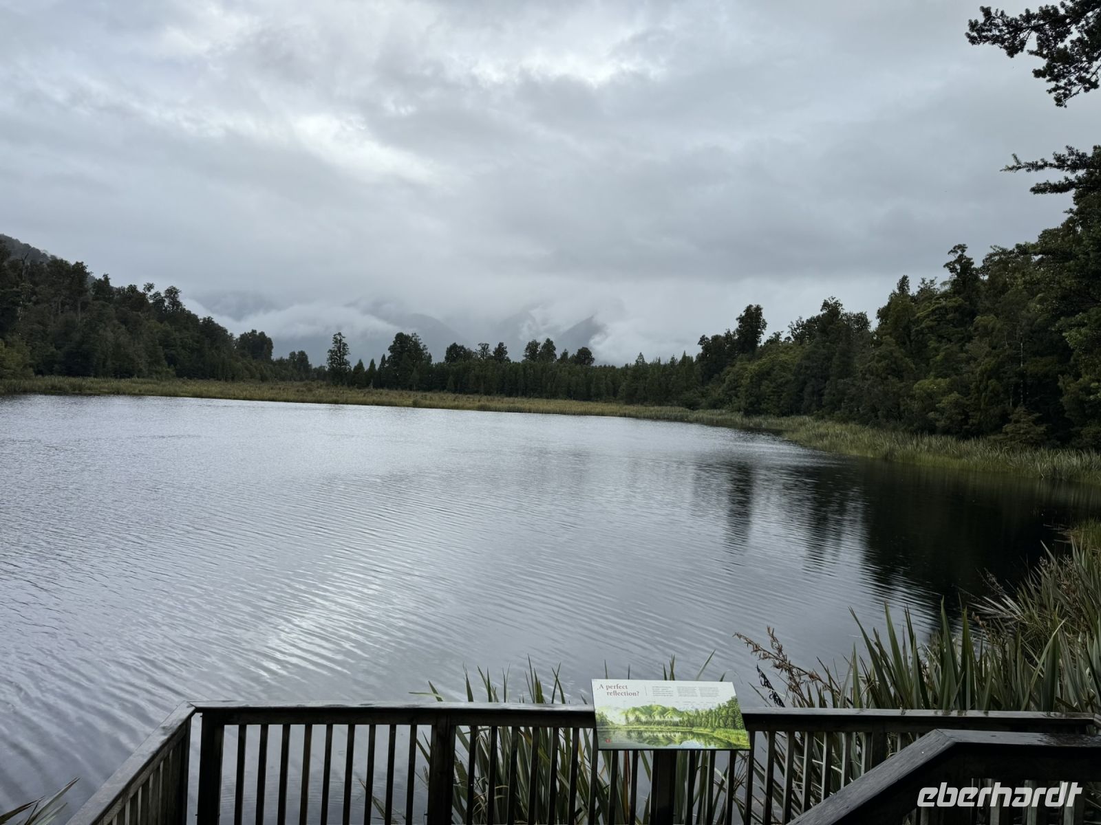 Beim Lake Lanthe machten wir einen Fotostopp bevor wir in Franz Josef ankammen. Leider hat es geregnet und wir mussten unsere Pläne ändern. Aber erstmal hatten wir unsere Mittagspause und danach sahen wir ein tolles Video über den Westland Nationalpark. So erkannten wir besser, alles was vor unsere Augen kam.