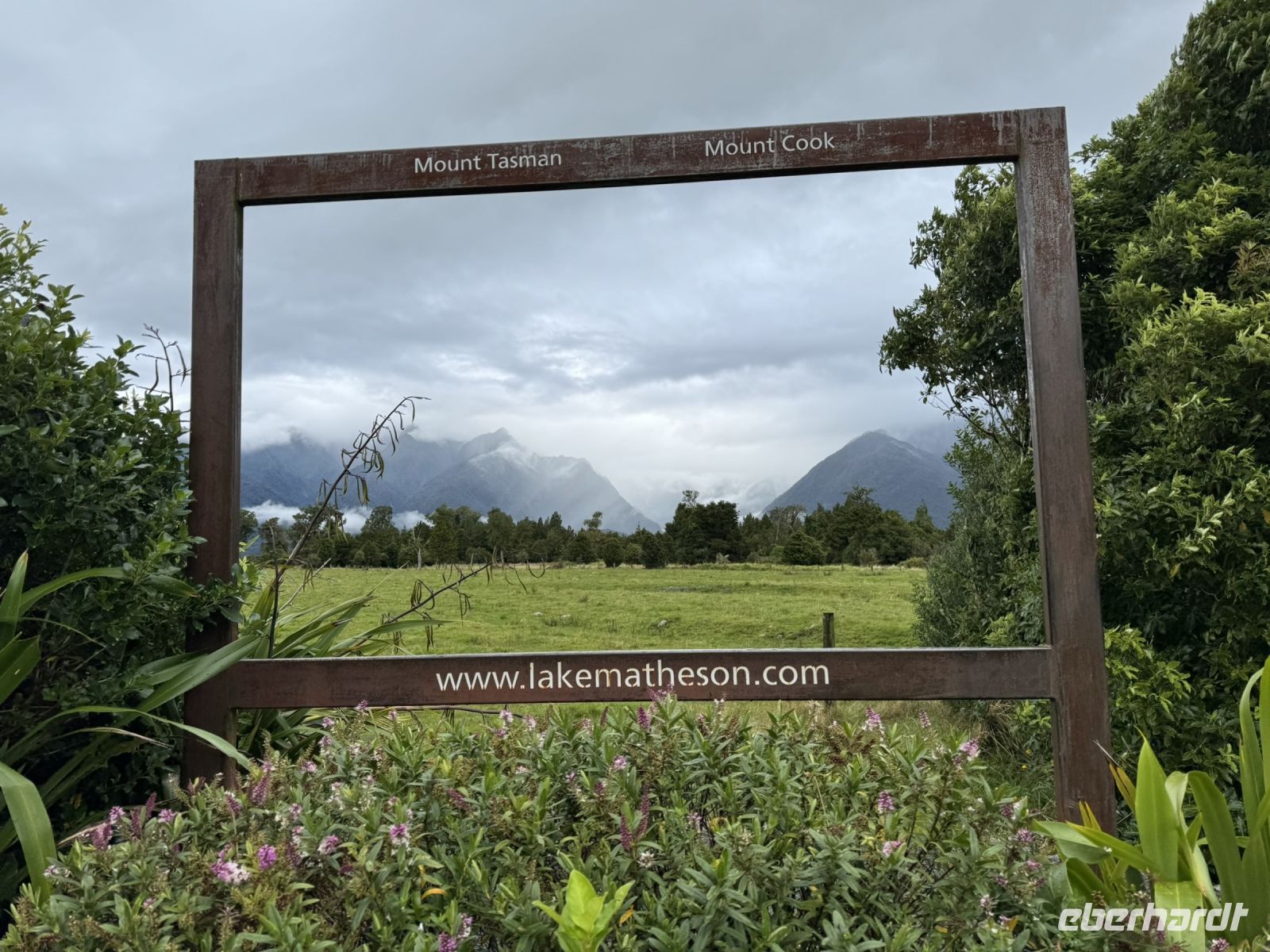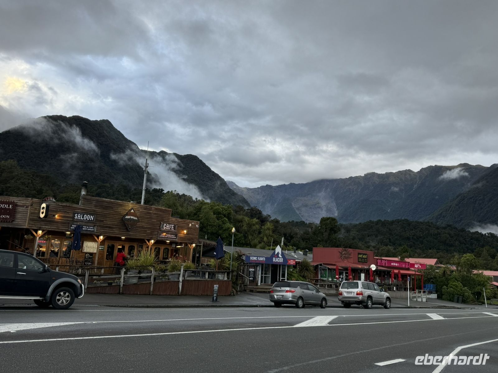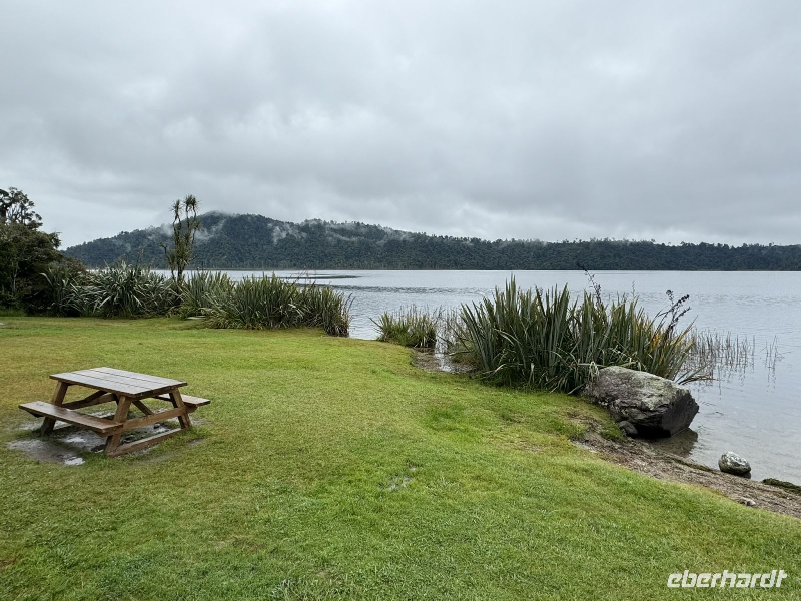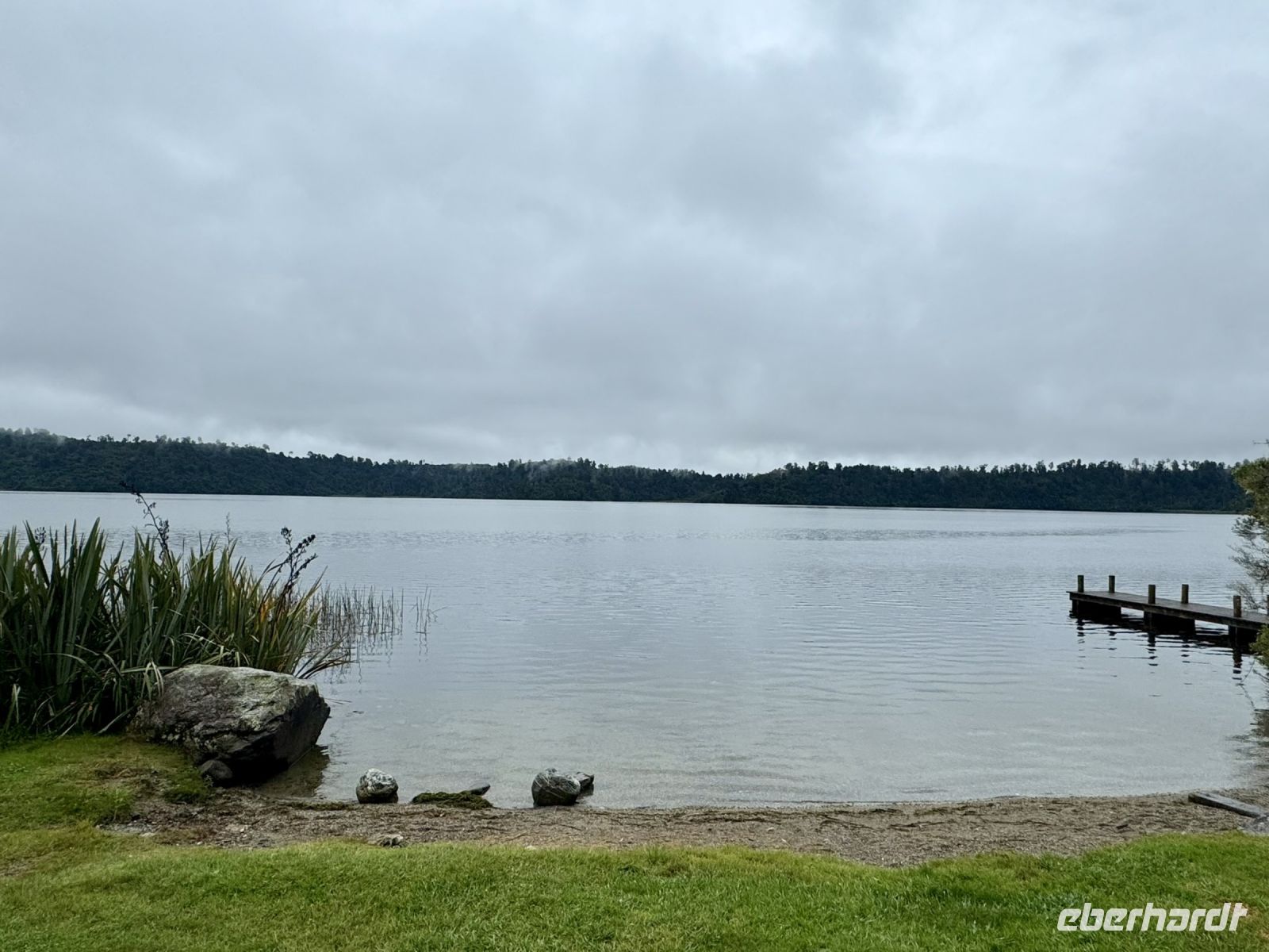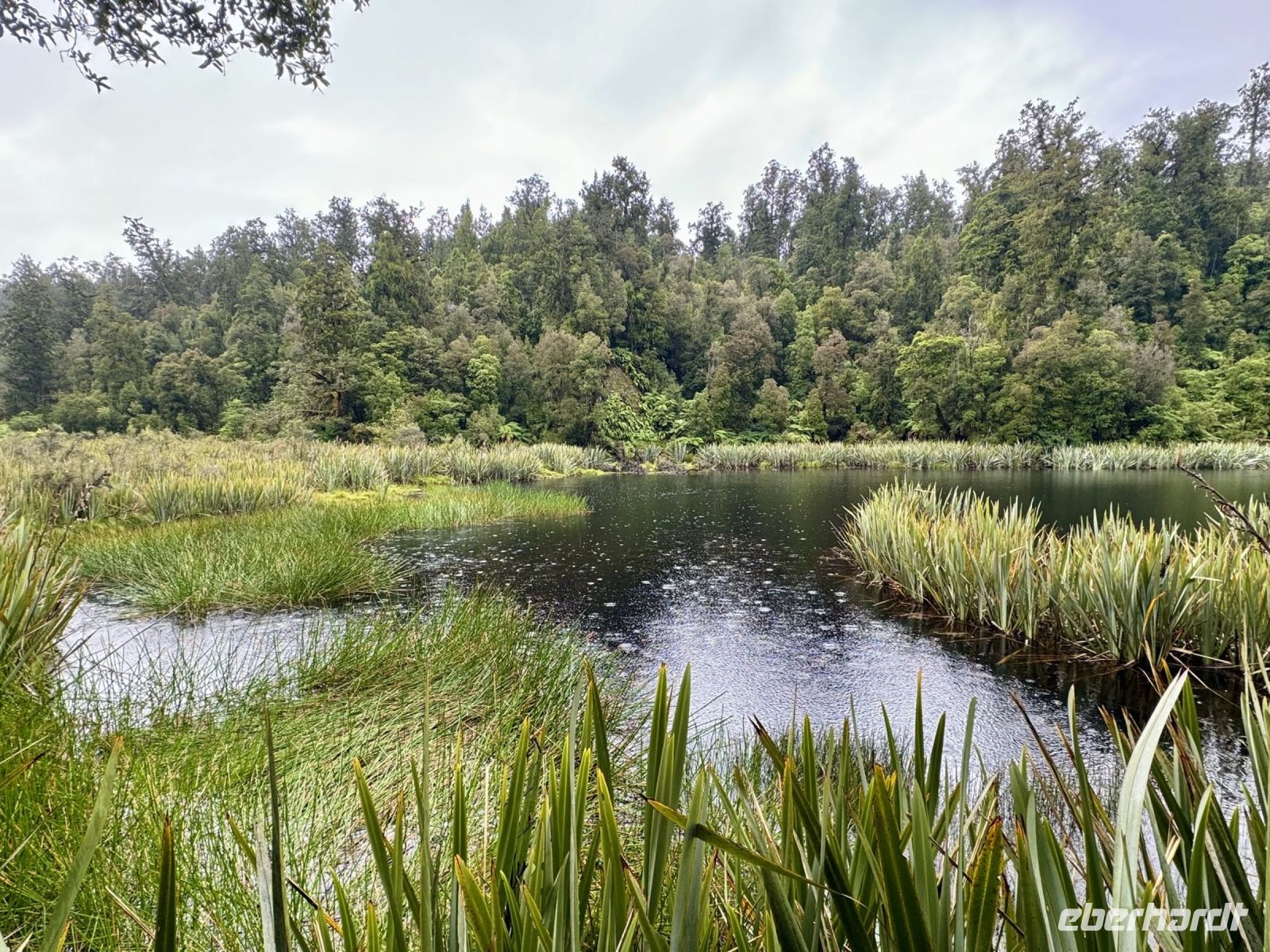 Beim Lake Lanthe machten wir einen Fotostopp bevor wir in Franz Josef ankammen. Leider hat es geregnet und wir mussten unsere Pläne ändern. Aber erstmal hatten wir unsere Mittagspause und danach sahen wir ein tolles Video über den Westland Nationalpark. So erkannten wir besser, alles was vor unsere Augen kam.