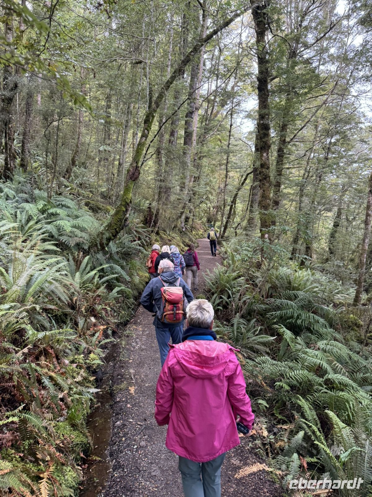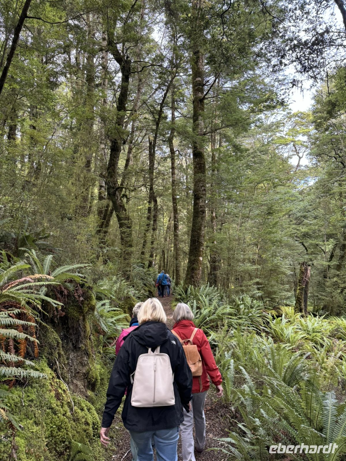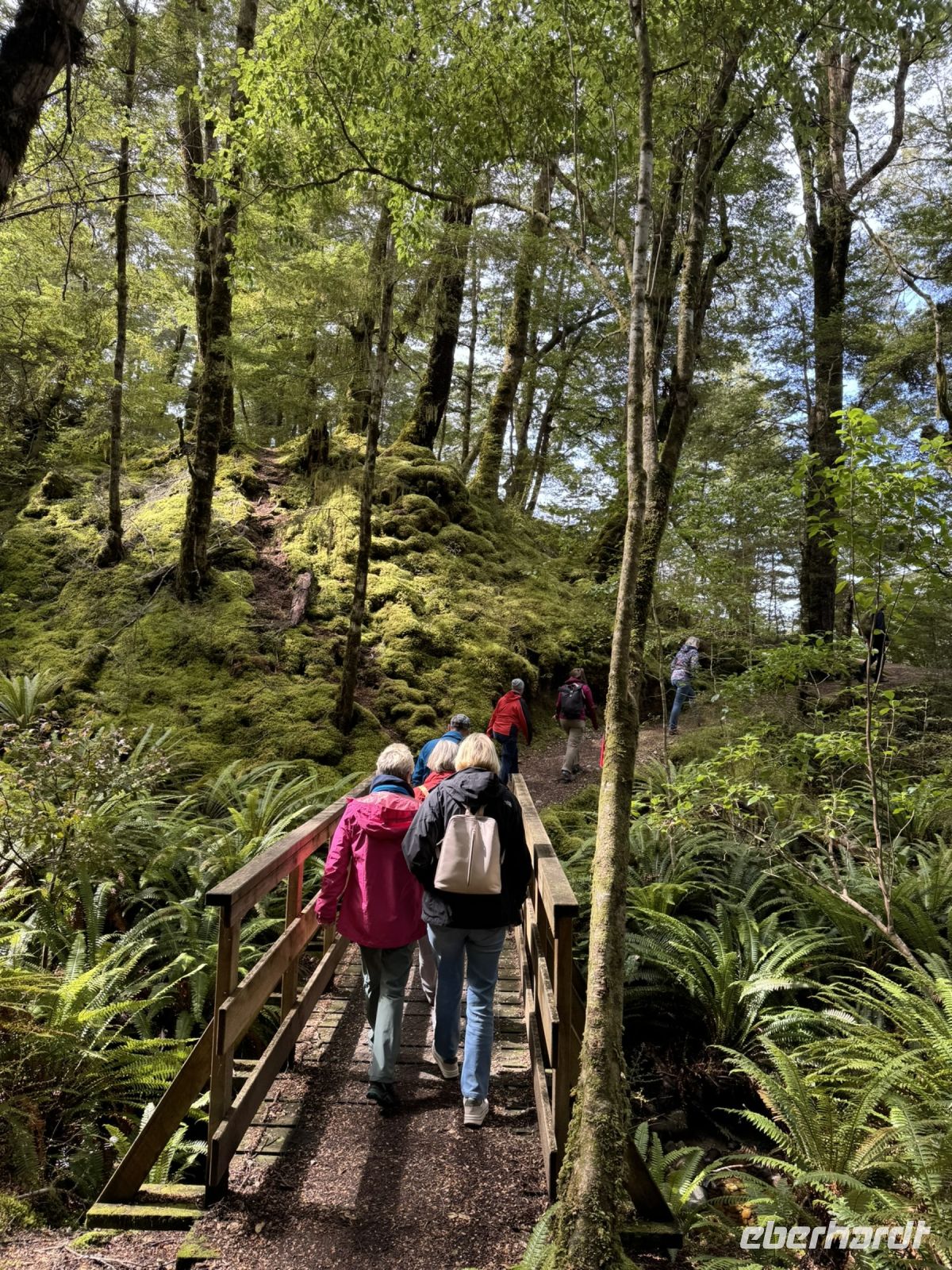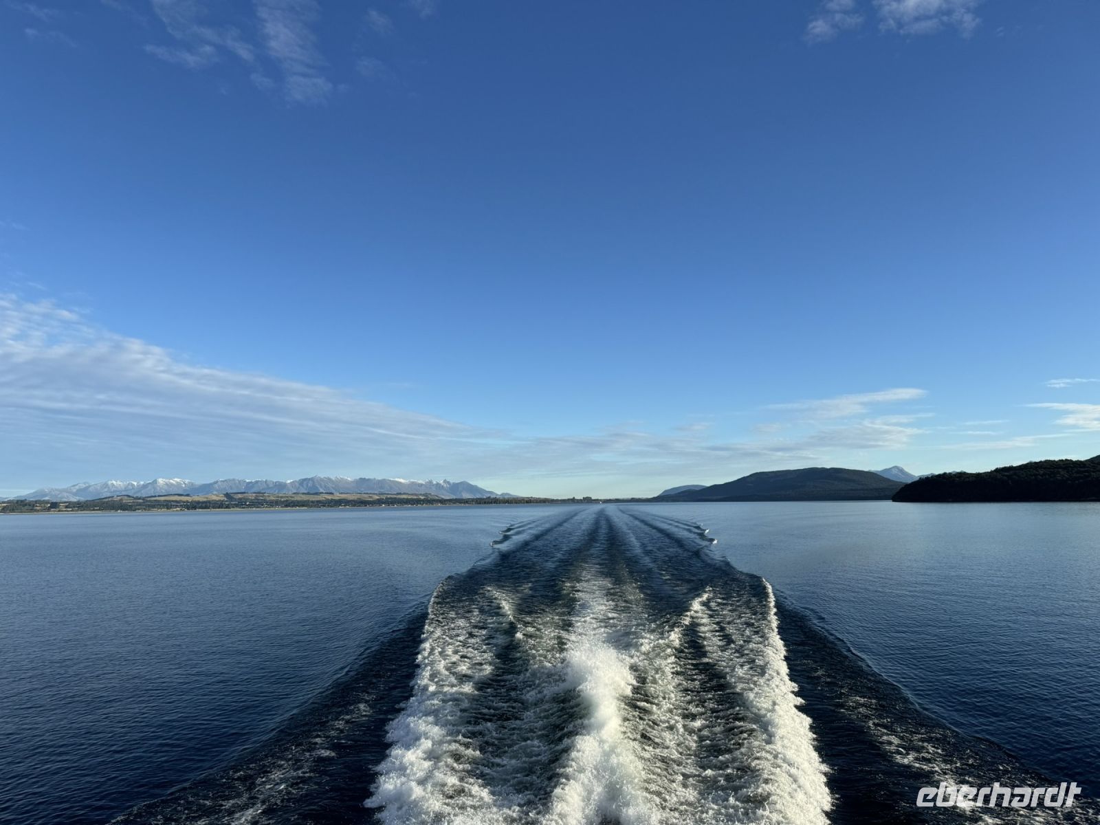 An diesem Tag verließen wir die Stadt Queenstown und überquerten den See bis zum Südteil. Dort befindet sich Kingston mit seinen schönen Aussichten zum See und den Bergen. Ein Stück weiter unten fanden wir Garston, wo wir eine Pause einlegten. Wir durchquerten ein kleines Naturschutzgebiet, in dem das Bültengras immer noch wächst. Das schöne Panorama mit dem Grün, den Schafen und den schneebedeckten Bergen faszinierte uns. Wir hielten in Manapouri direkt am See und genossen unsere Mittagspause mit schöner Aussicht und der Ruhe der Natur. Danach wanderten wir den Kepler Track entlang, überquerten eine Holzhängebrücke und gingen durch einen Wald mit Pilzen und weichem, moosbedecktem Boden. Der Weg führte uns mit kleinen Höhenunterschieden entlang des Flusses, mal war es etwas dunkel, mal feucht und singende Vögel waren zu hören. Eine Szene aus „Herr der Ringe“ wurde hier gedreht, ganz spezifisch der letzte Moment des ersten Films. In Te Anau angekommen, sind wir zuerst ins Hotel gefahren und dann in die Stadt zum Abendessen gegangen, bevor wir die Glühwürmchen beobachteten. Wir fuhren mit dem Boot über den Te Anau See zu einer Insel mit großartigen Aussichten auf die Berge. Als wir ankamen, gingen wir mit Harry in die Höhle und fanden die ersten Glühwürmchen. Die Höhle ist nur etwa 12.000 Jahre alt, das ist geologisch gesehen noch sehr jung, deshalb kann man dort keine Stalaktiten oder Stalagmiten finden. In der Höhle angekommen, haben wir die Kraft des Dart River gesehen, sowie die schönen Wasserfälle. Wir stiegen in kleine Boote um und fuhren durch die Höhle, wird fanden viele Glühwürmchen an der Höhlendecke. Anschließend sahen wir eine Video-Erklärung über das Leben der Glühwürmchen mit einer Tasse heißer Schokolade oder Tee, bevor wir zurückfuhren. Nach diesem schönen Erlebnis spazierten wir am Ufer des Sees entlang zu unserem Motel.