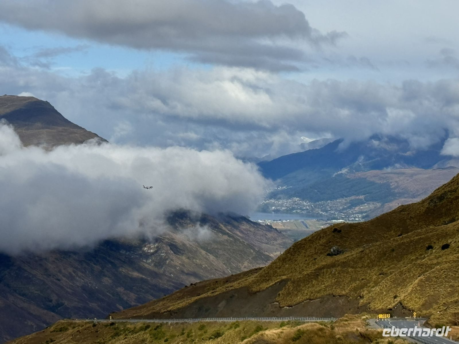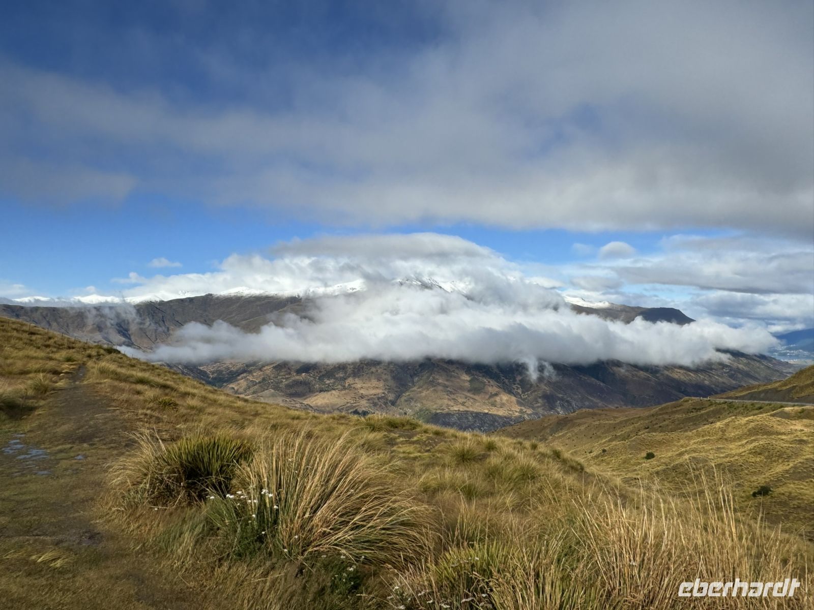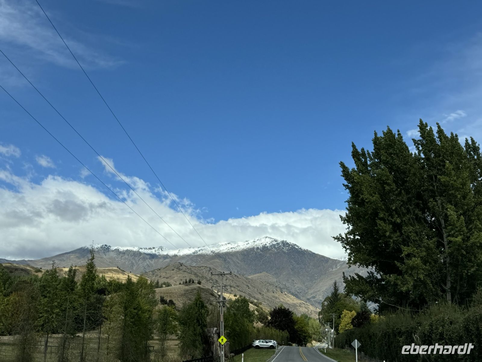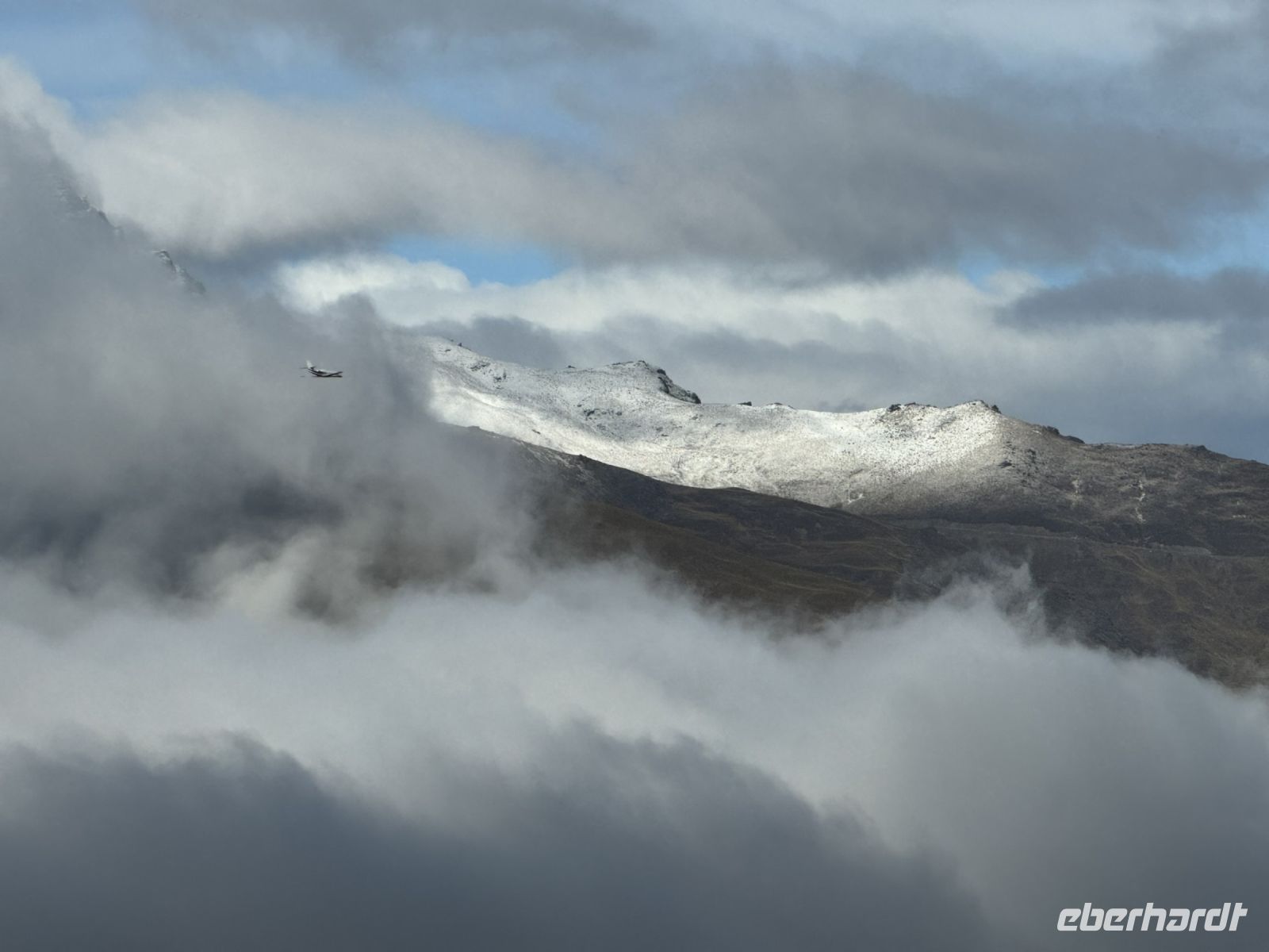 Dann sind wir bis 1.000 Meter Höhe gefahren und direkt am Crown Range Pass angekommen. Da konnte man die schneebedecken Südalpen sowie die Stadt Queenstown und den Flughafen sehen.