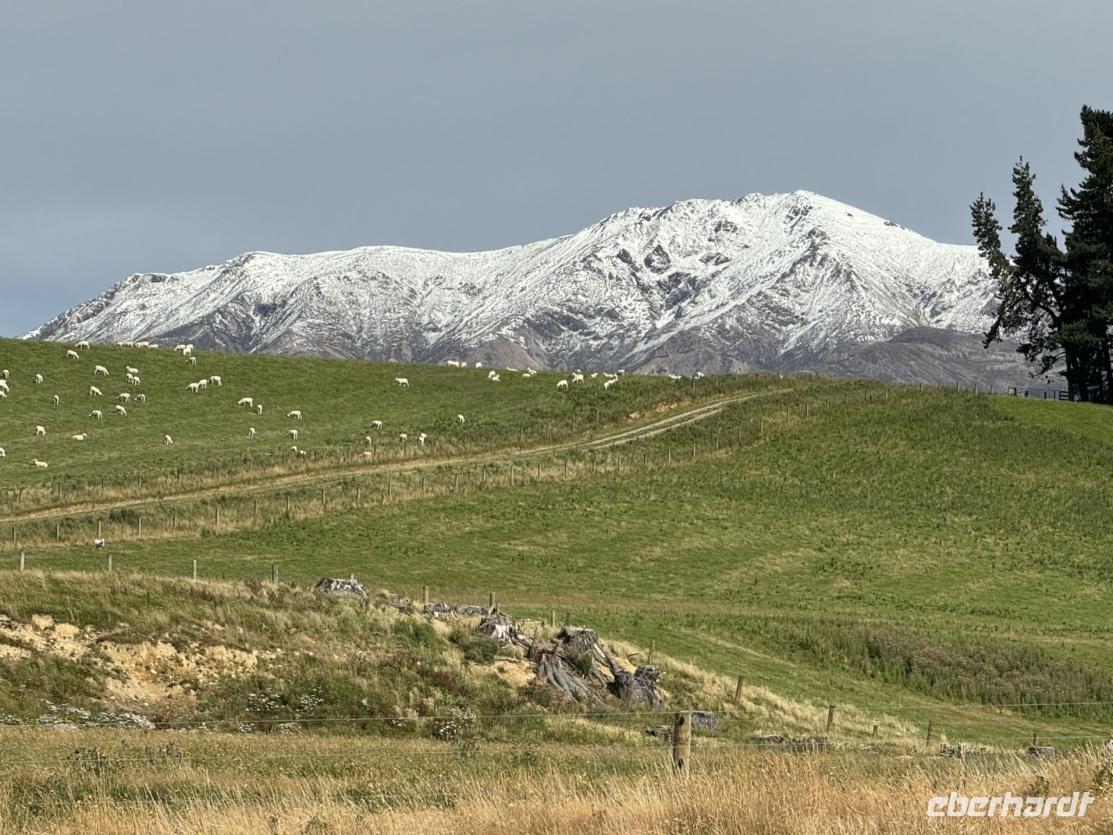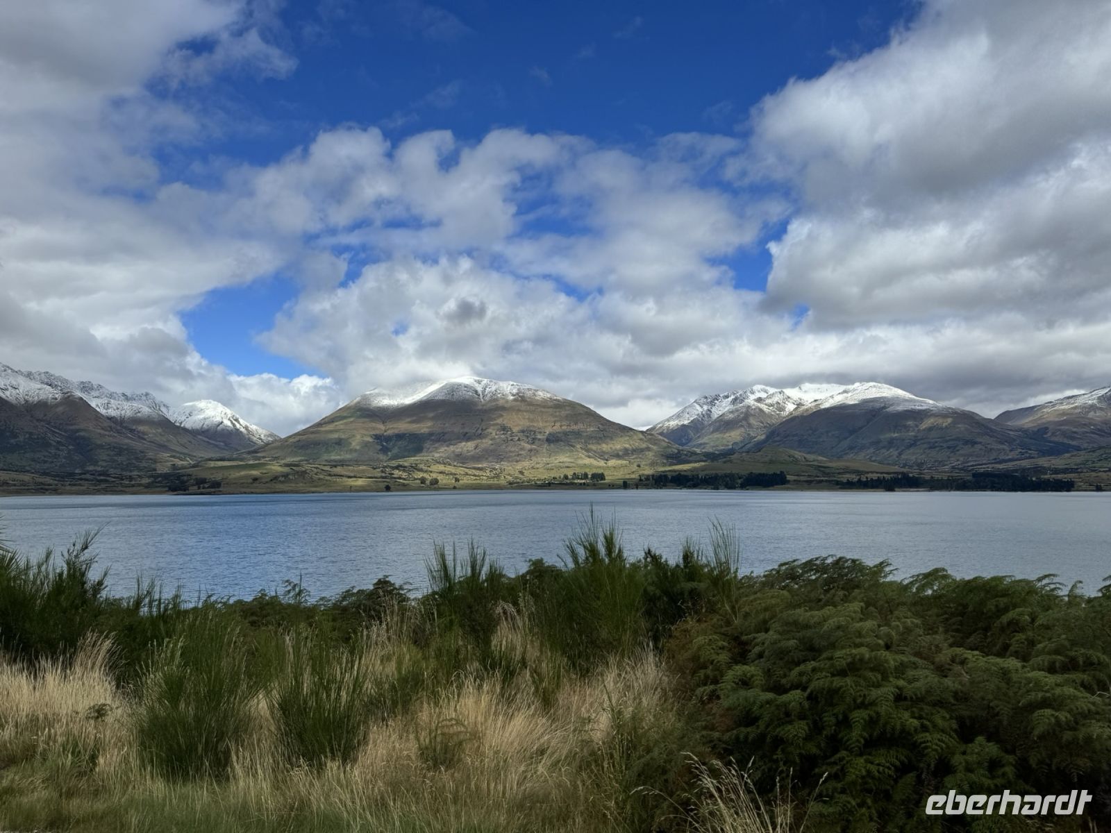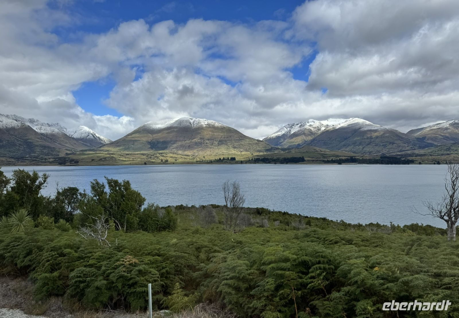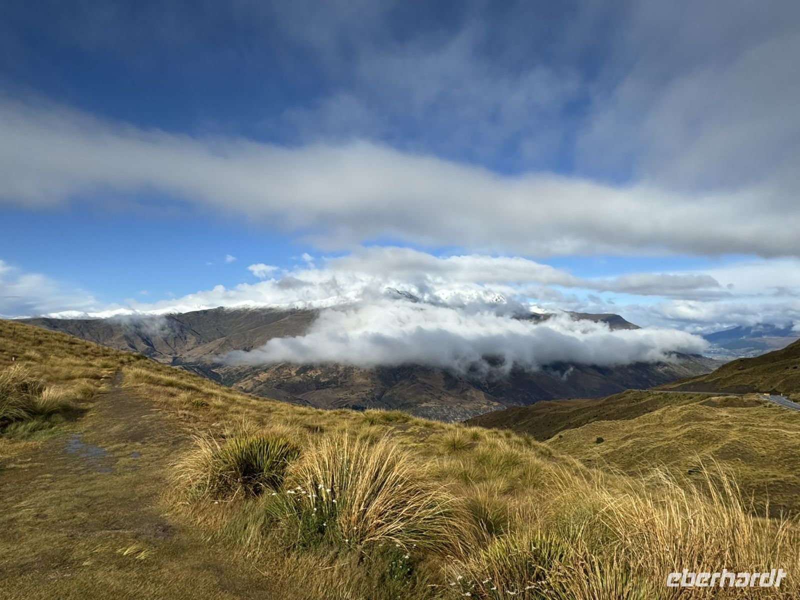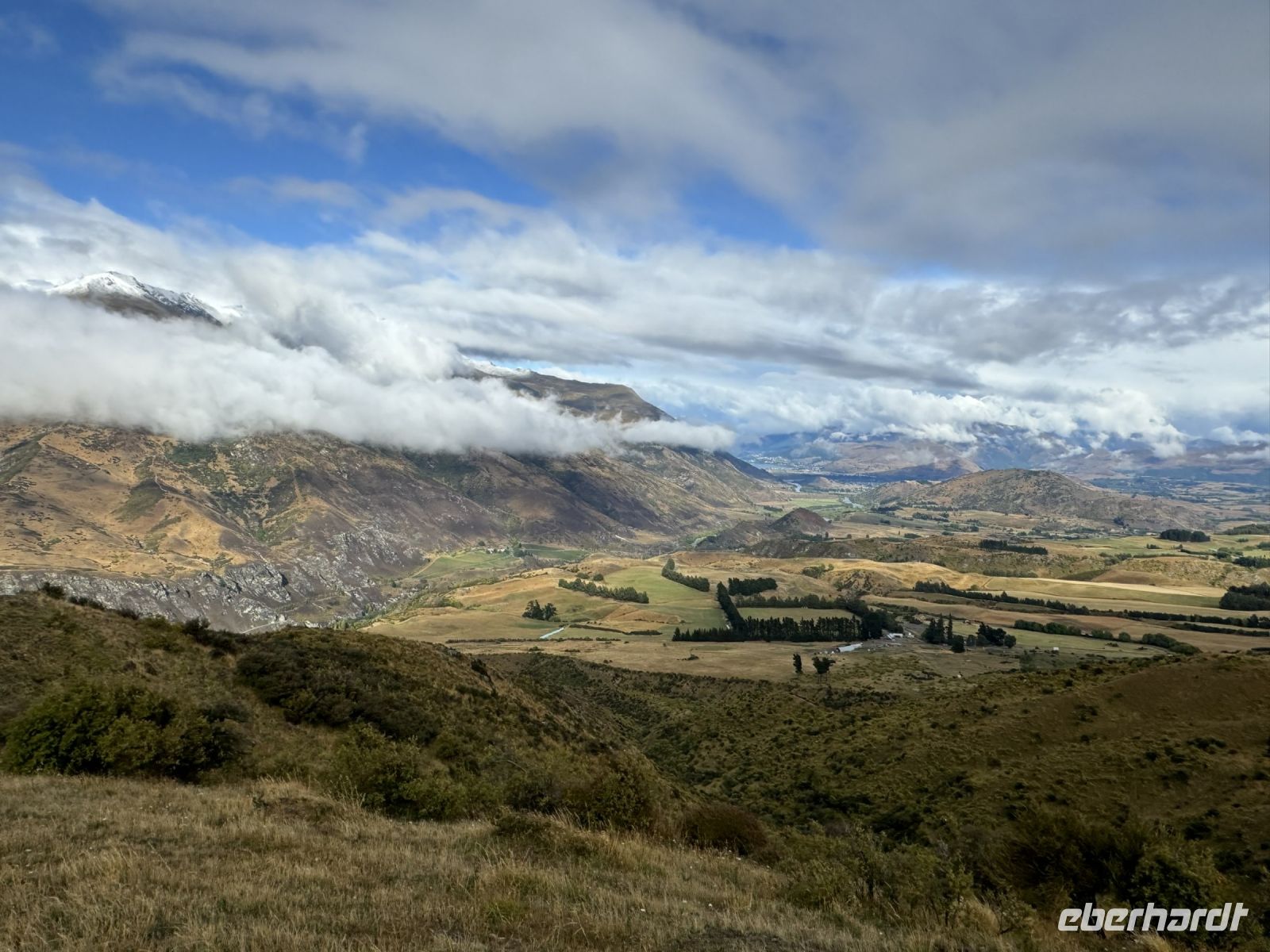 Dann sind wir bis 1.000 Meter Höhe gefahren und direkt am Crown Range Pass angekommen. Da konnte man die schneebedecken Südalpen sowie die Stadt Queenstown und den Flughafen sehen.