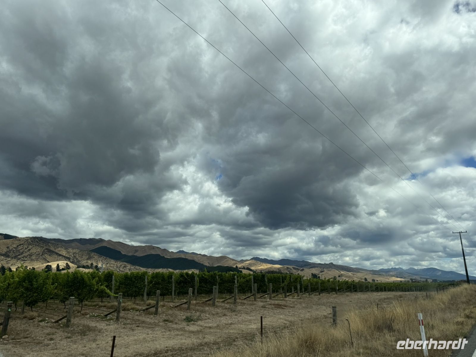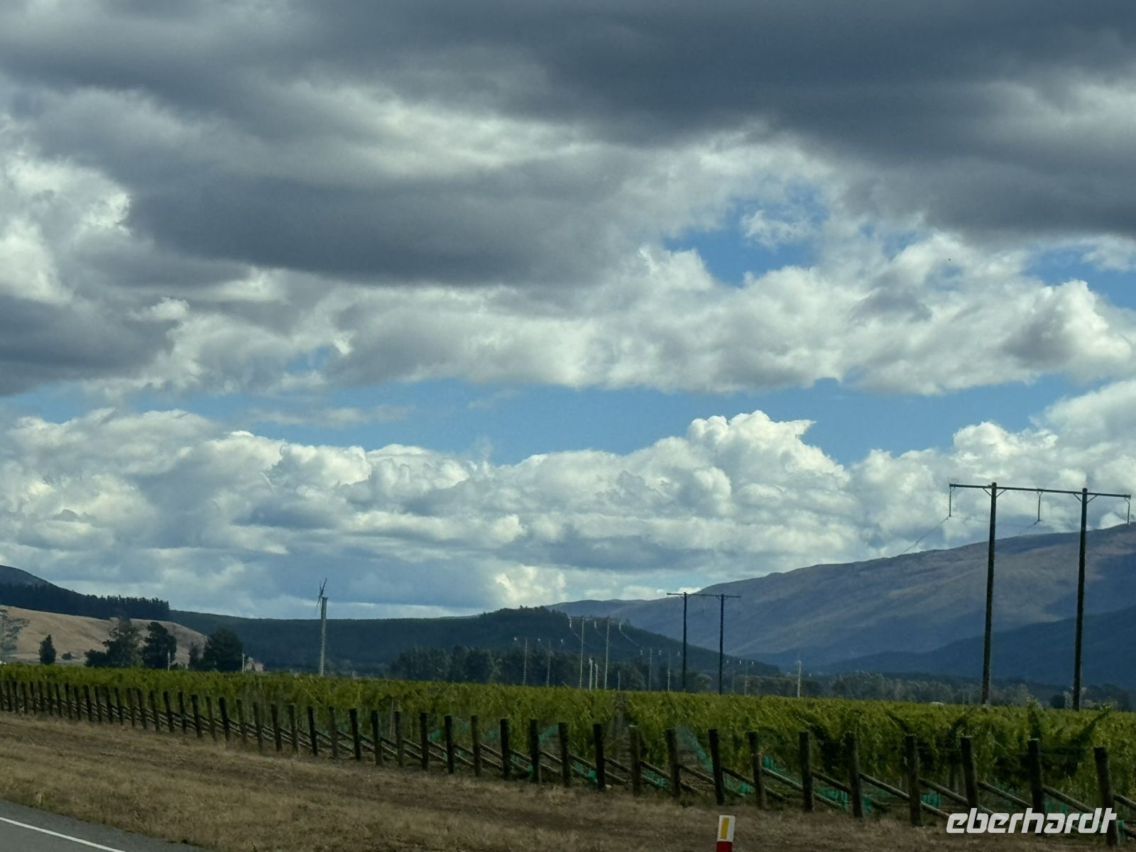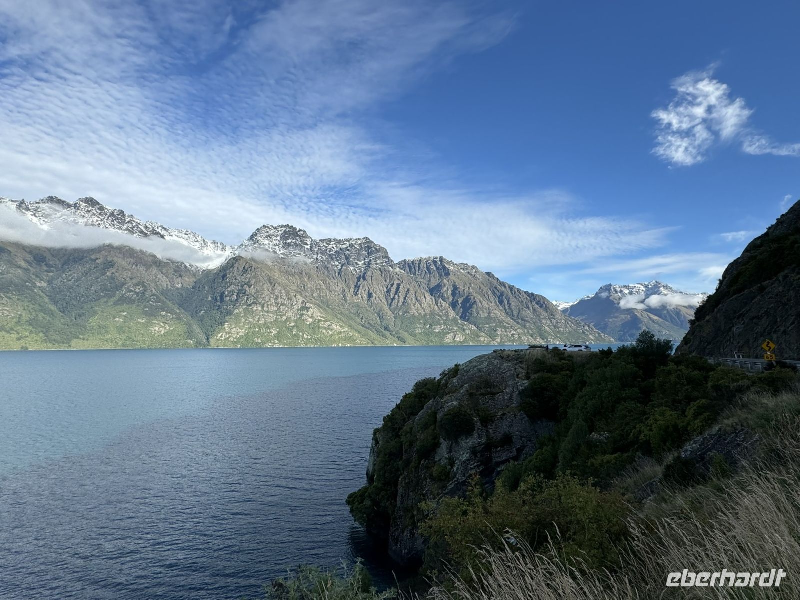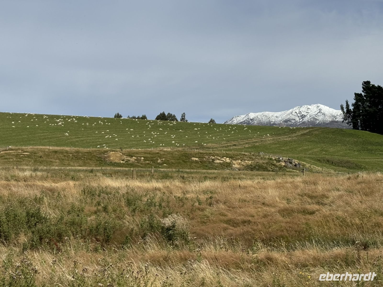 Dann sind wir bis 1.000 Meter Höhe gefahren und direkt am Crown Range Pass angekommen. Da konnte man die schneebedecken Südalpen sowie die Stadt Queenstown und den Flughafen sehen.