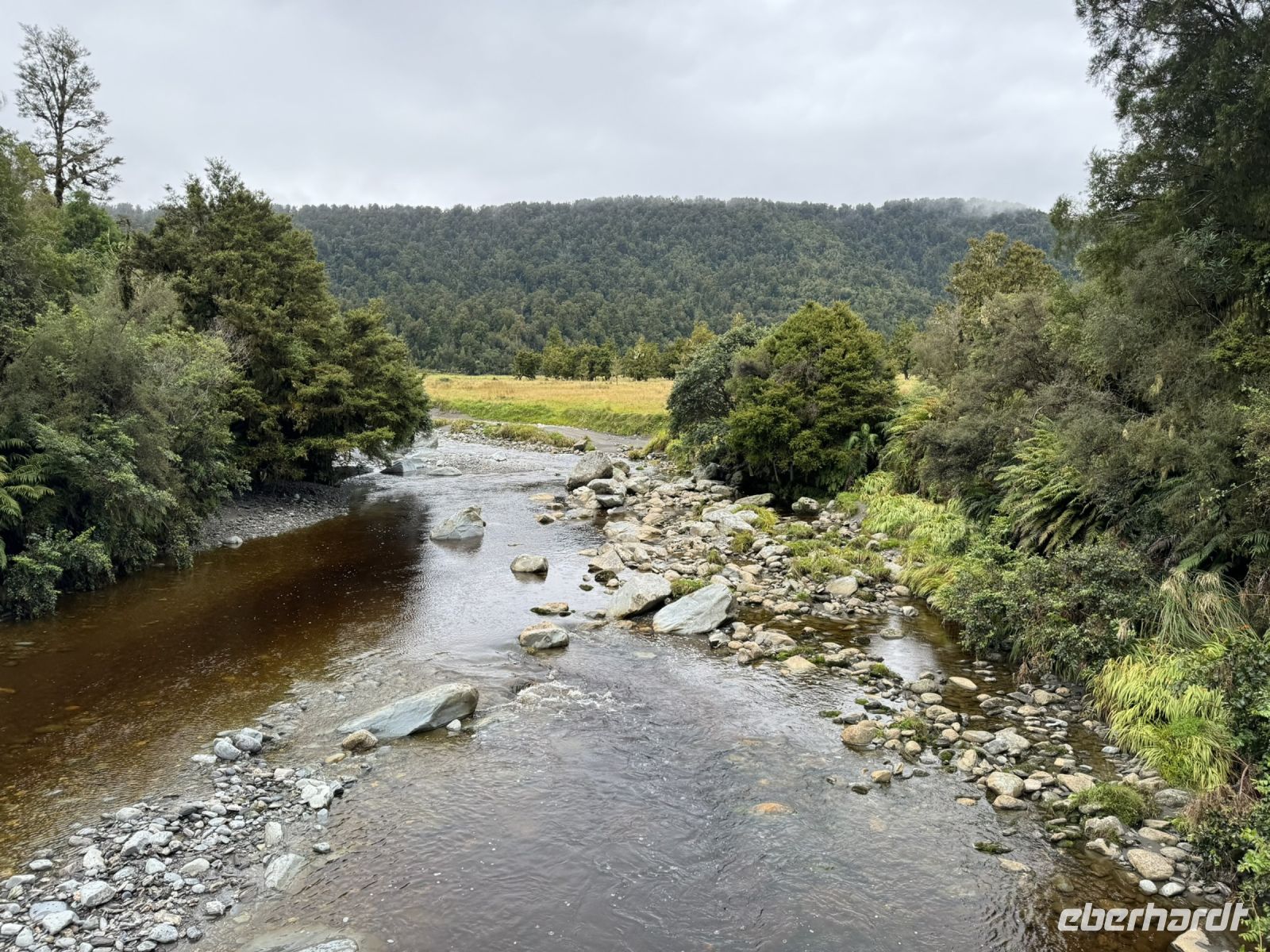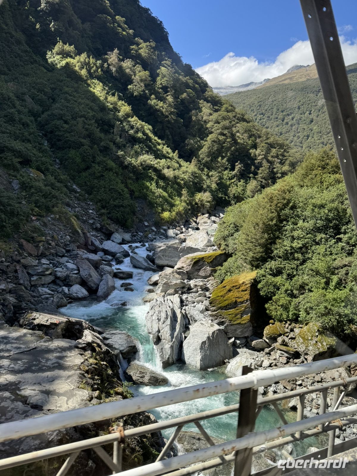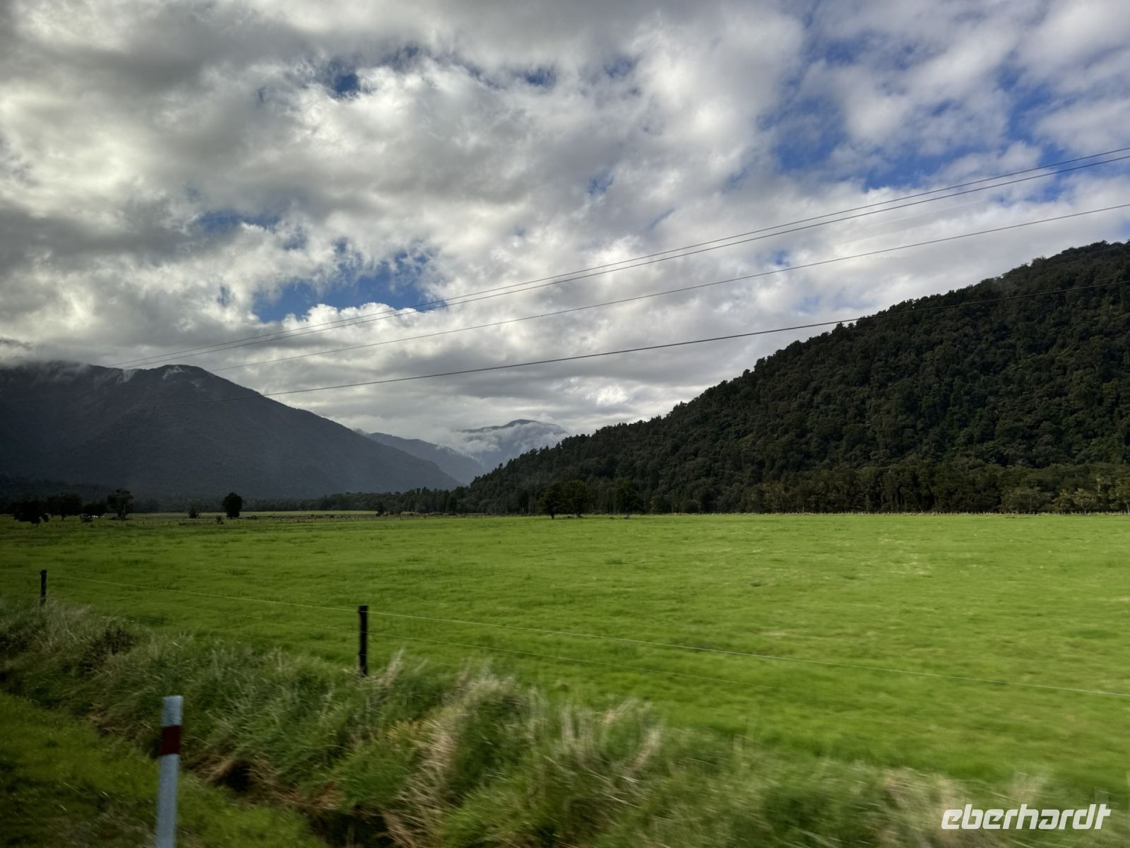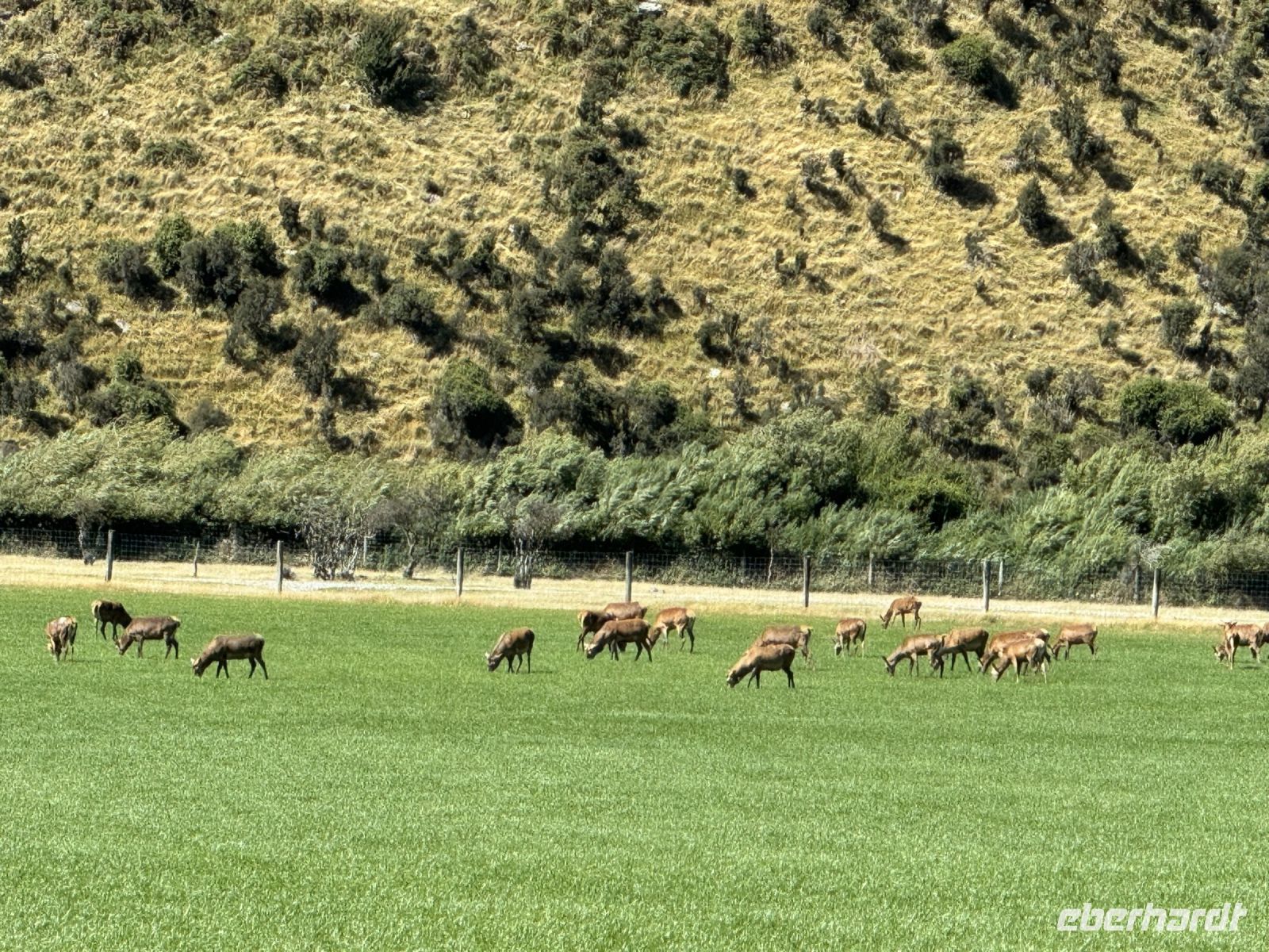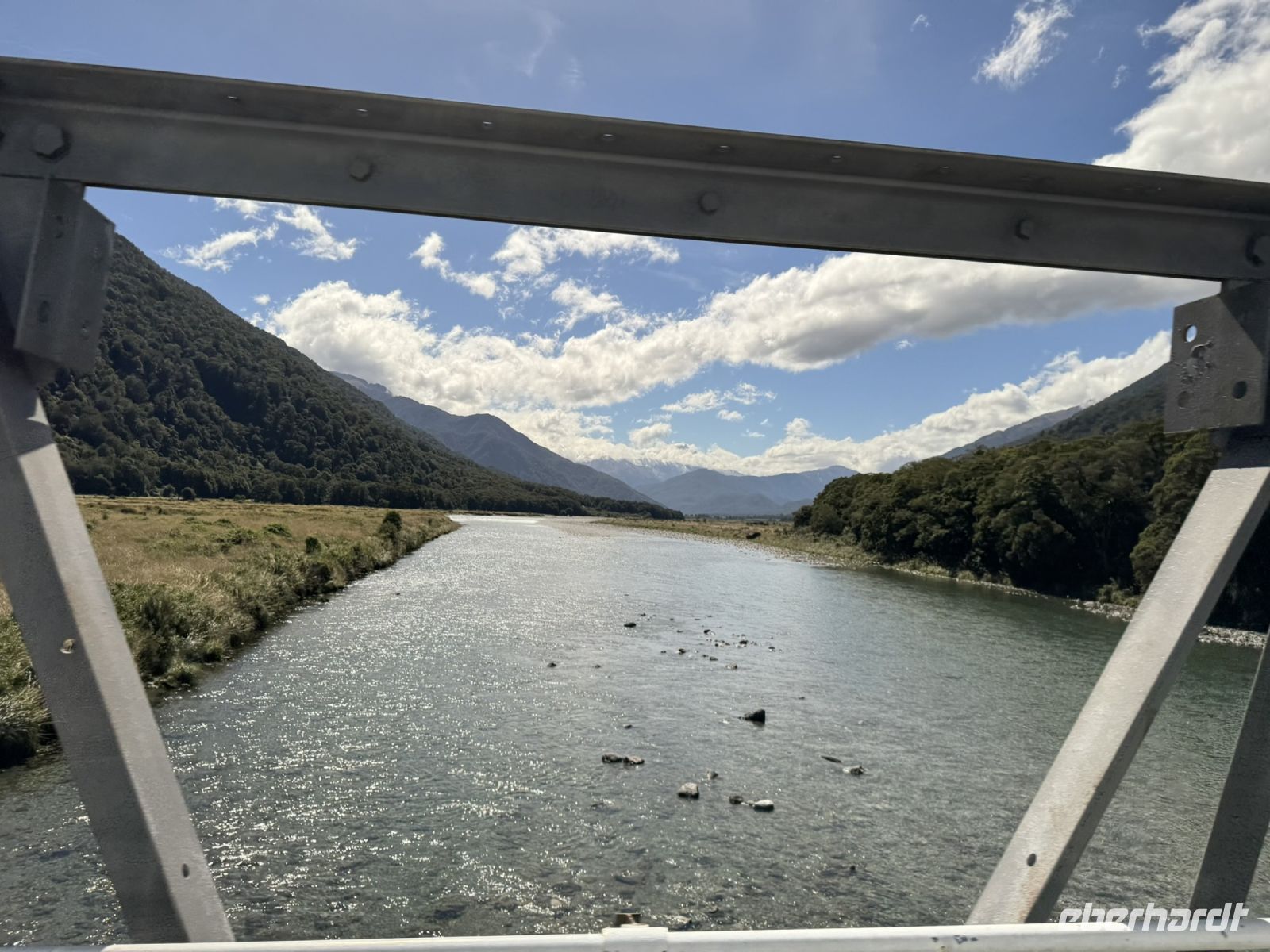 Dann fuhren wir über den Haast-Pass, fanden unterwegs den Creek Wasserfall und sehr schöne Panoramen von den Südalpen. Unsere Fahrt führte entlang des Flusses über verschiedene Brücken, wo wir die Schafe, Kühe und Hirsche auf unsere Strecke sahen.