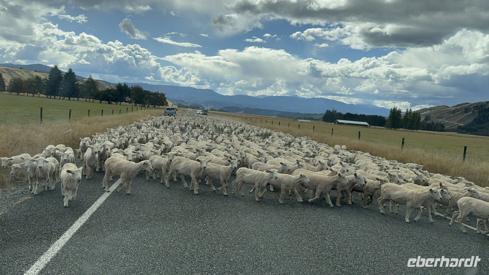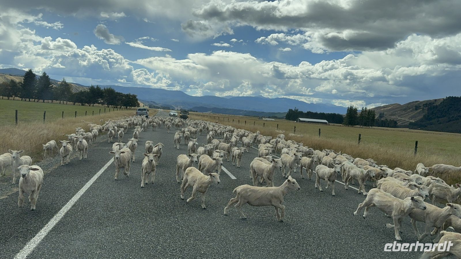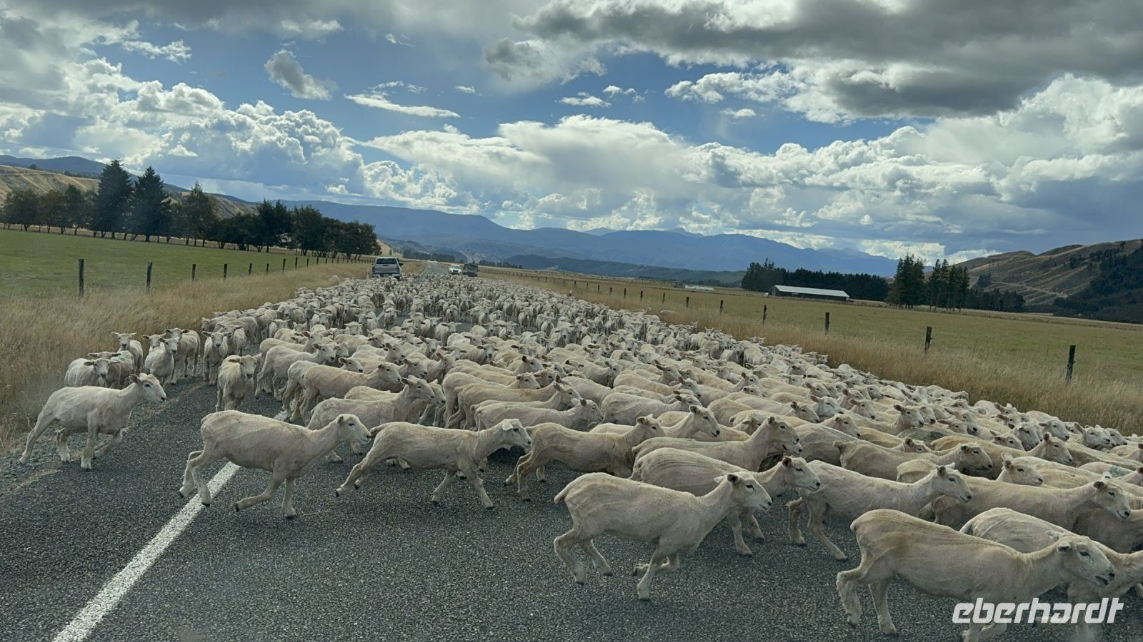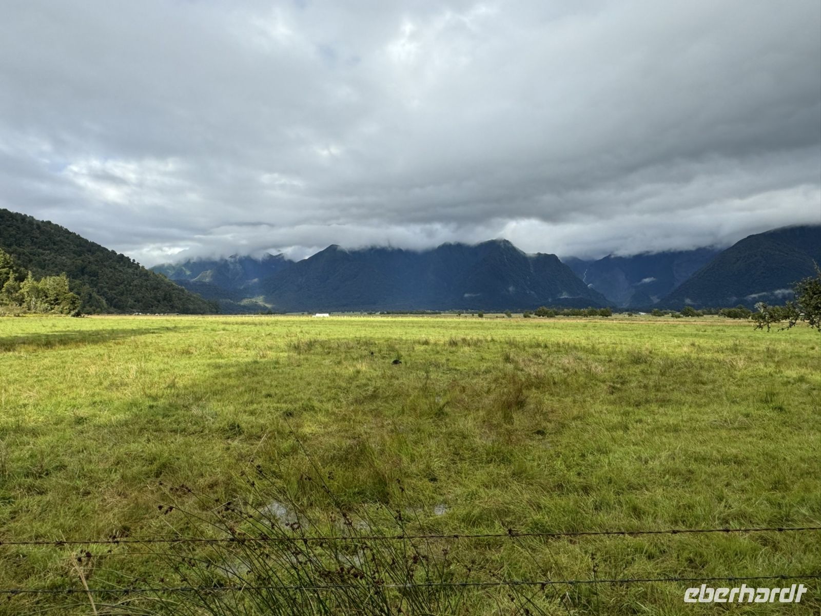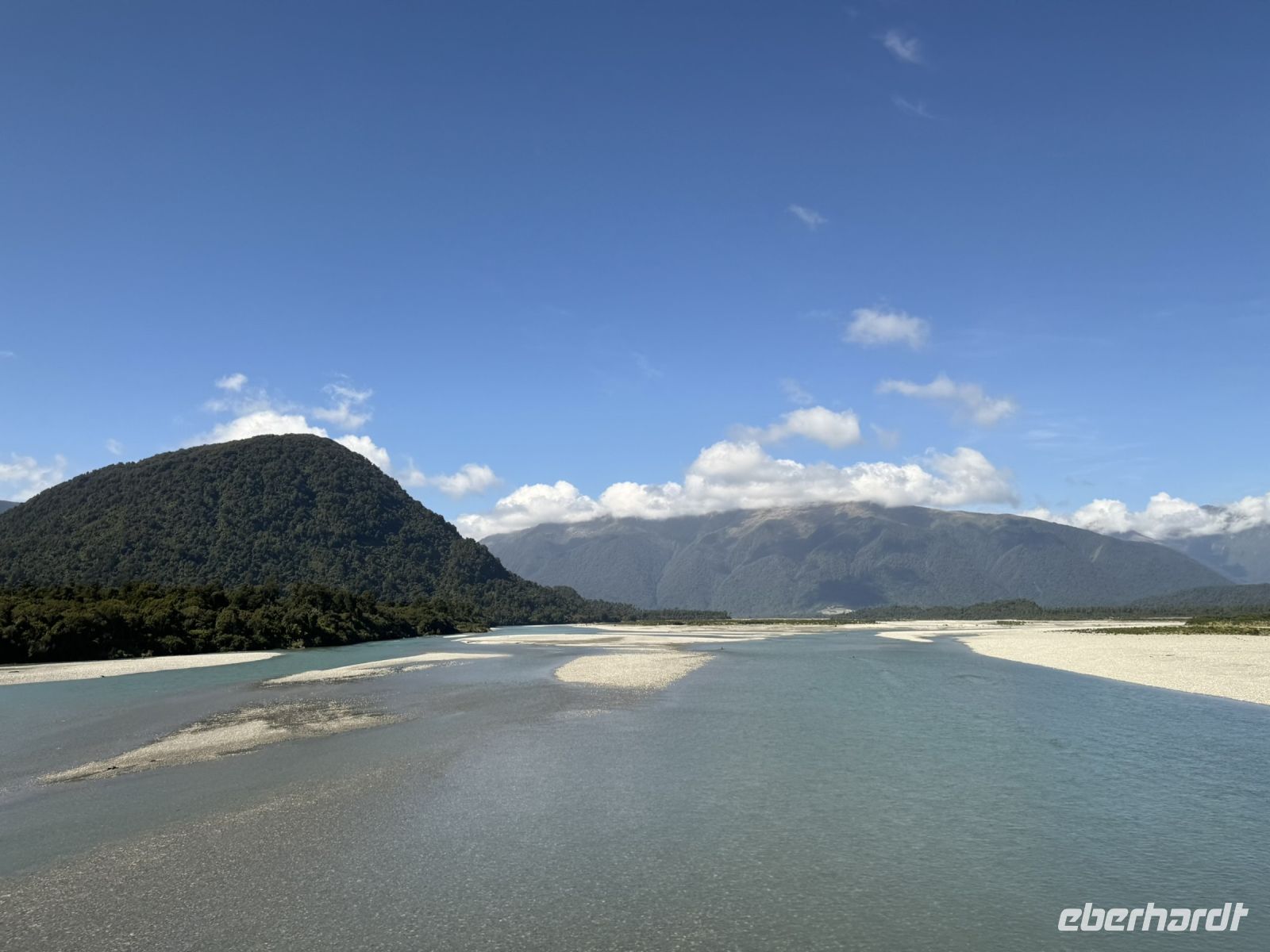 Dann fuhren wir über den Haast-Pass, fanden unterwegs den Creek Wasserfall und sehr schöne Panoramen von den Südalpen. Unsere Fahrt führte entlang des Flusses über verschiedene Brücken, wo wir die Schafe, Kühe und Hirsche auf unsere Strecke sahen.