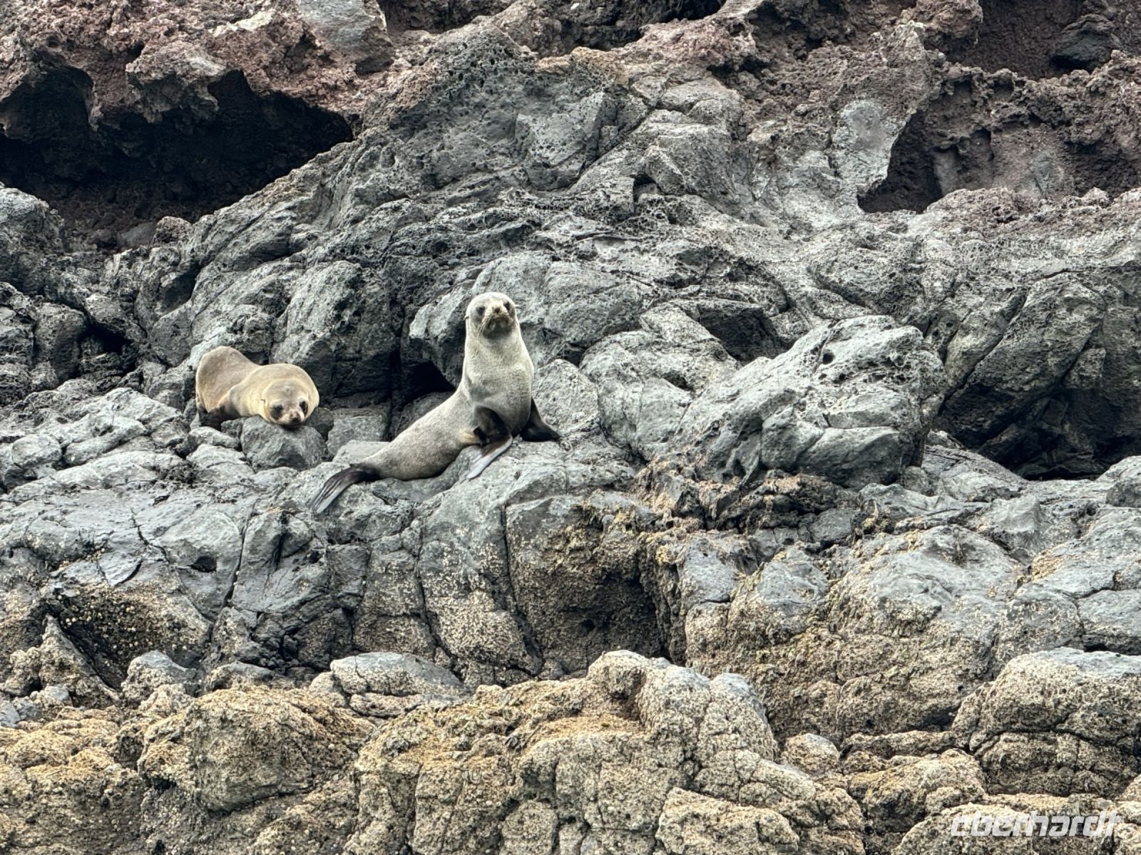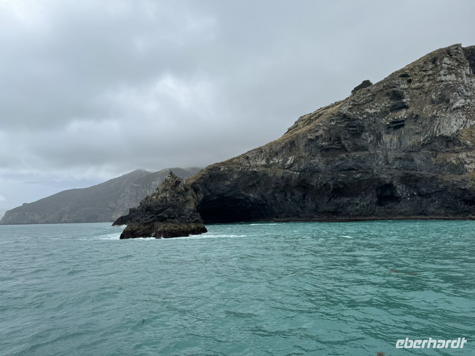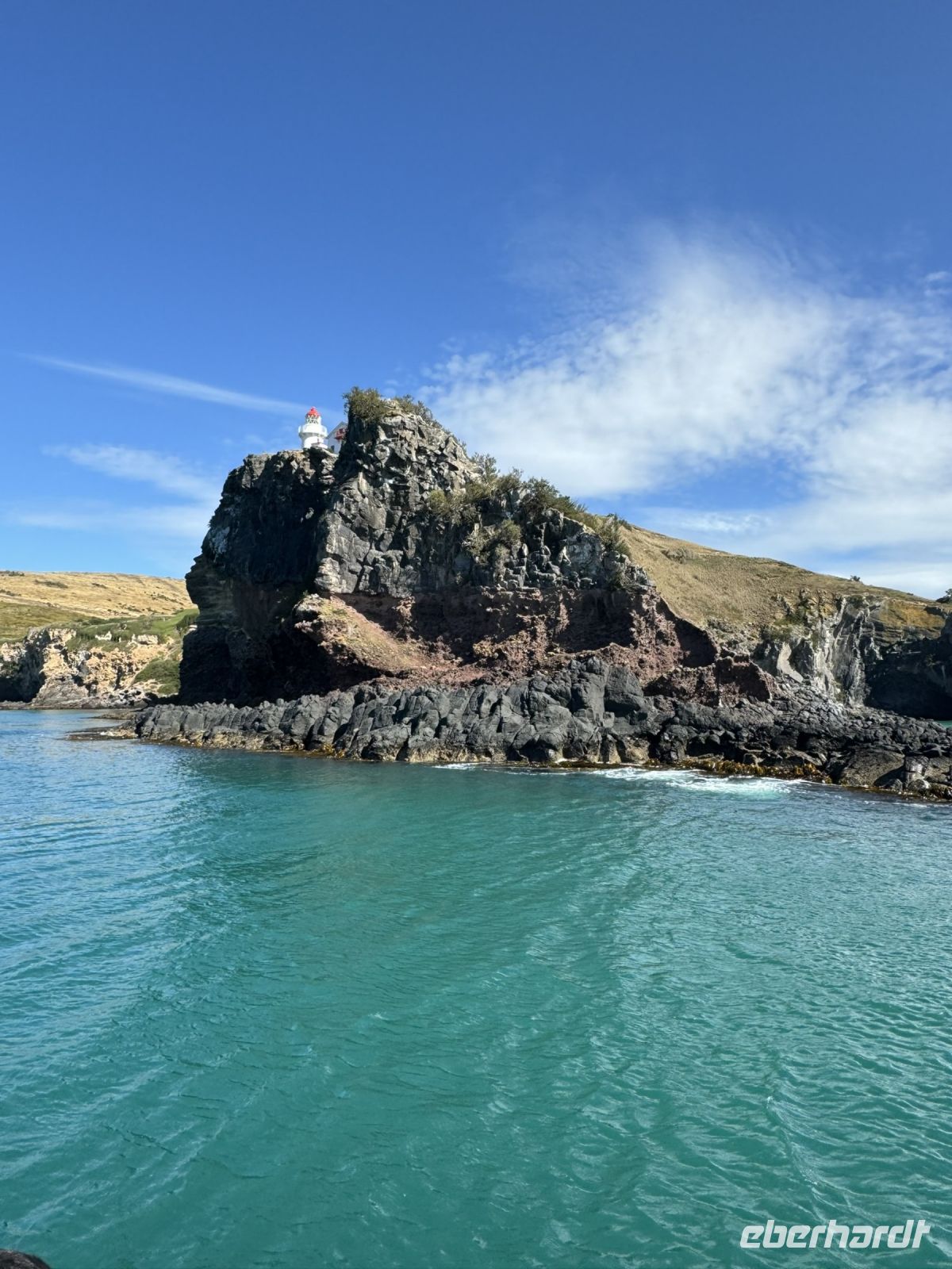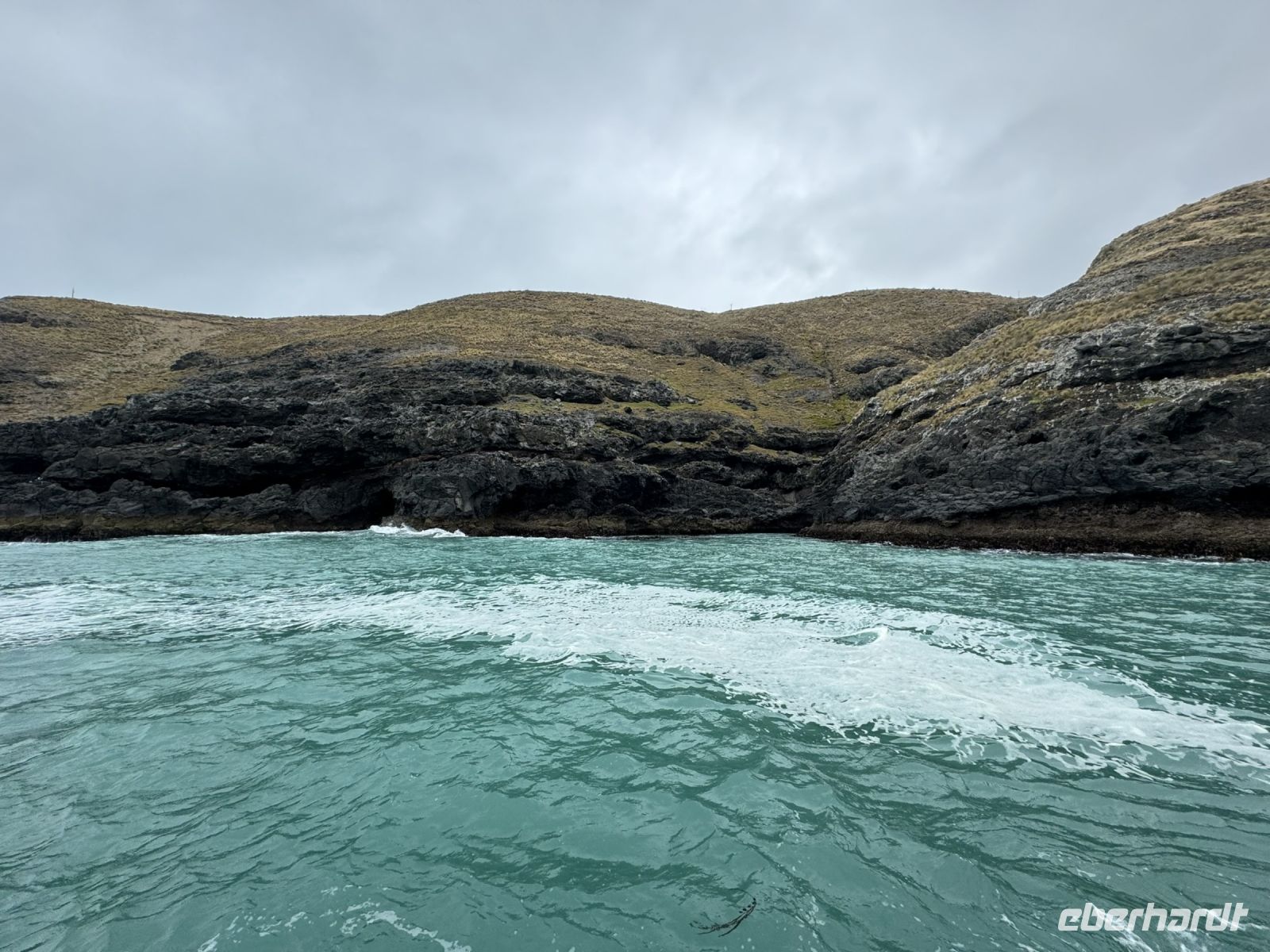 Obwohl der Himmel etwas bewölkt war, genossen wir angenehme Temperaturen und türkisfarbenes Wasser. Während wir entlang des alten Lavaverlaufs und der Höhlen fuhren, wurden wir von Delphinen begrüßt. Wir sahen außerdem Möwen, Kormorane, Seebären und Albatrosse, und später begegneten wir auch den seltenen Blauen Pinguinen. Sie kamen alle ganz nah an unser Boot heran, und wir erlebten ein unvergessliches Erlebnis.