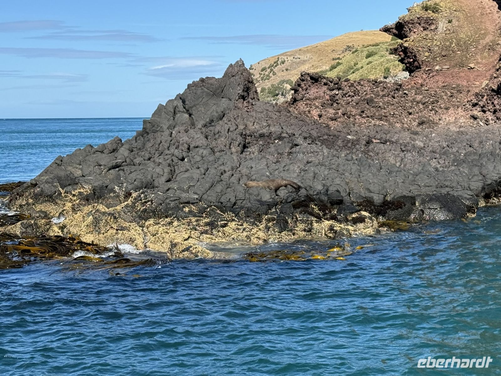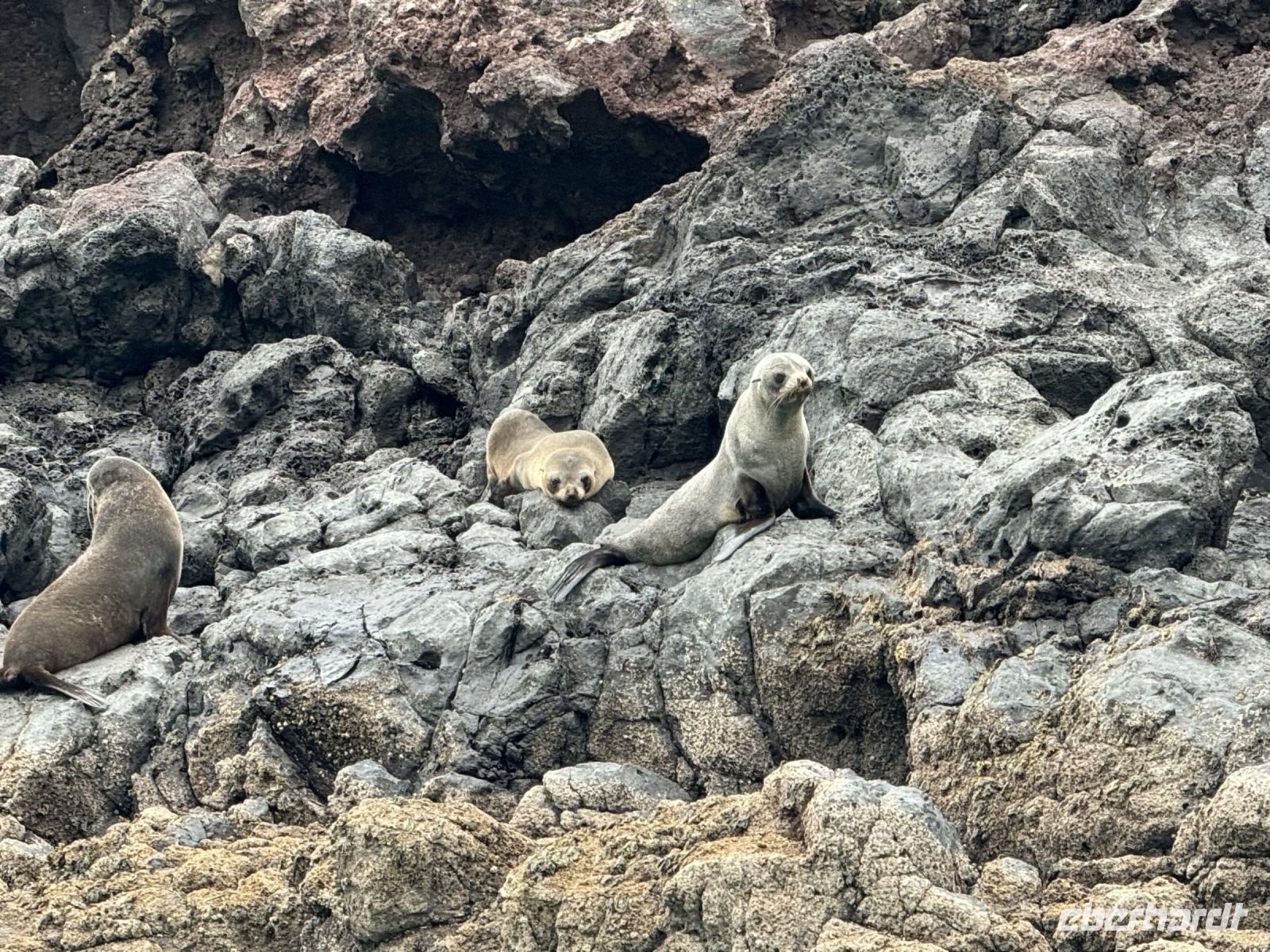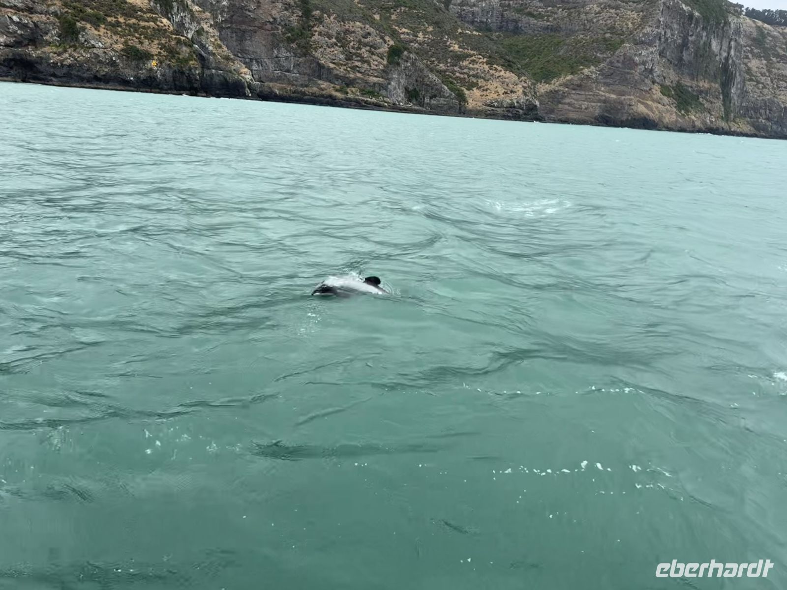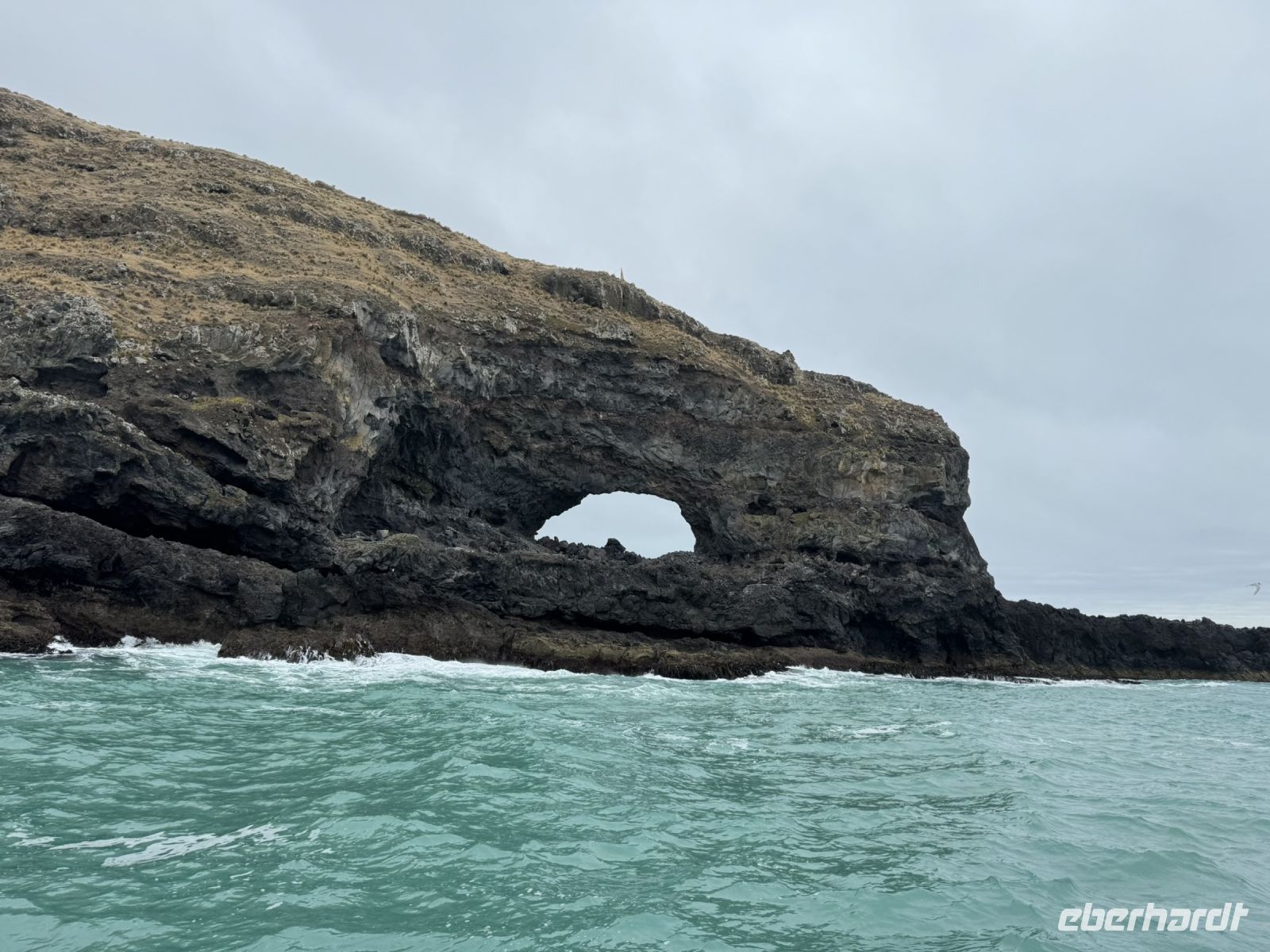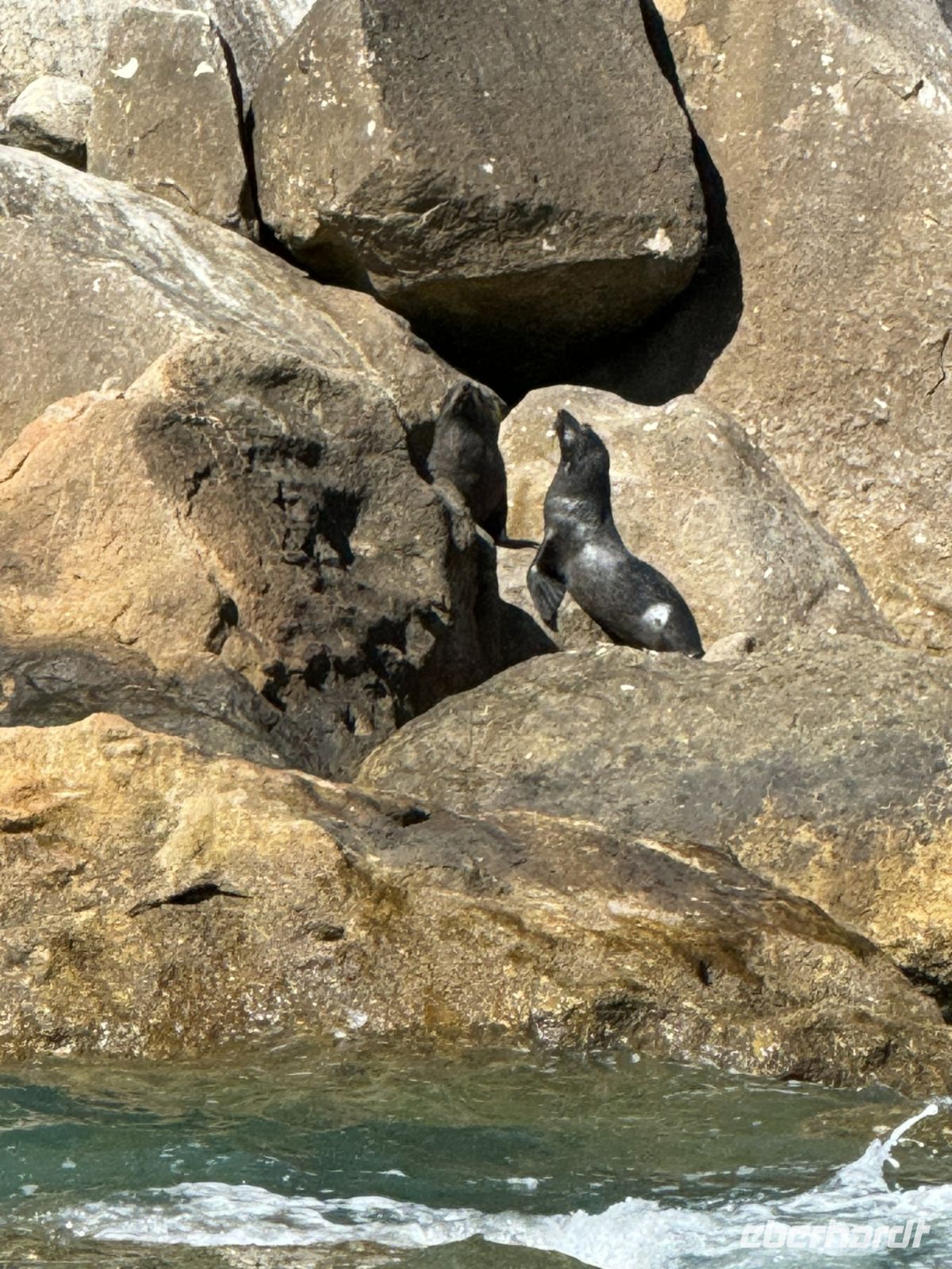 Obwohl der Himmel etwas bewölkt war, genossen wir angenehme Temperaturen und türkisfarbenes Wasser. Während wir entlang des alten Lavaverlaufs und der Höhlen fuhren, wurden wir von Delphinen begrüßt. Wir sahen außerdem Möwen, Kormorane, Seebären und Albatrosse, und später begegneten wir auch den seltenen Blauen Pinguinen. Sie kamen alle ganz nah an unser Boot heran, und wir erlebten ein unvergessliches Erlebnis.
