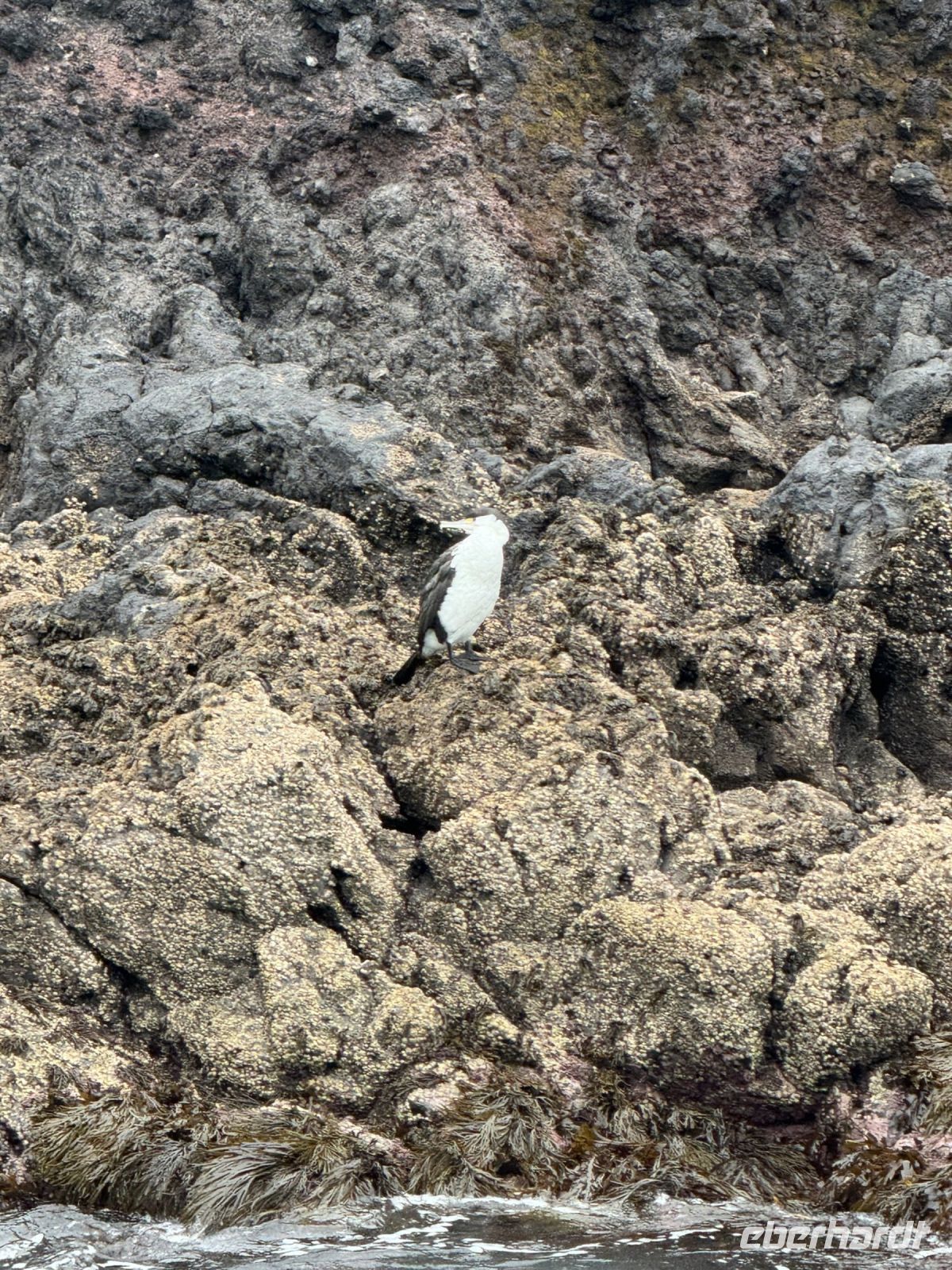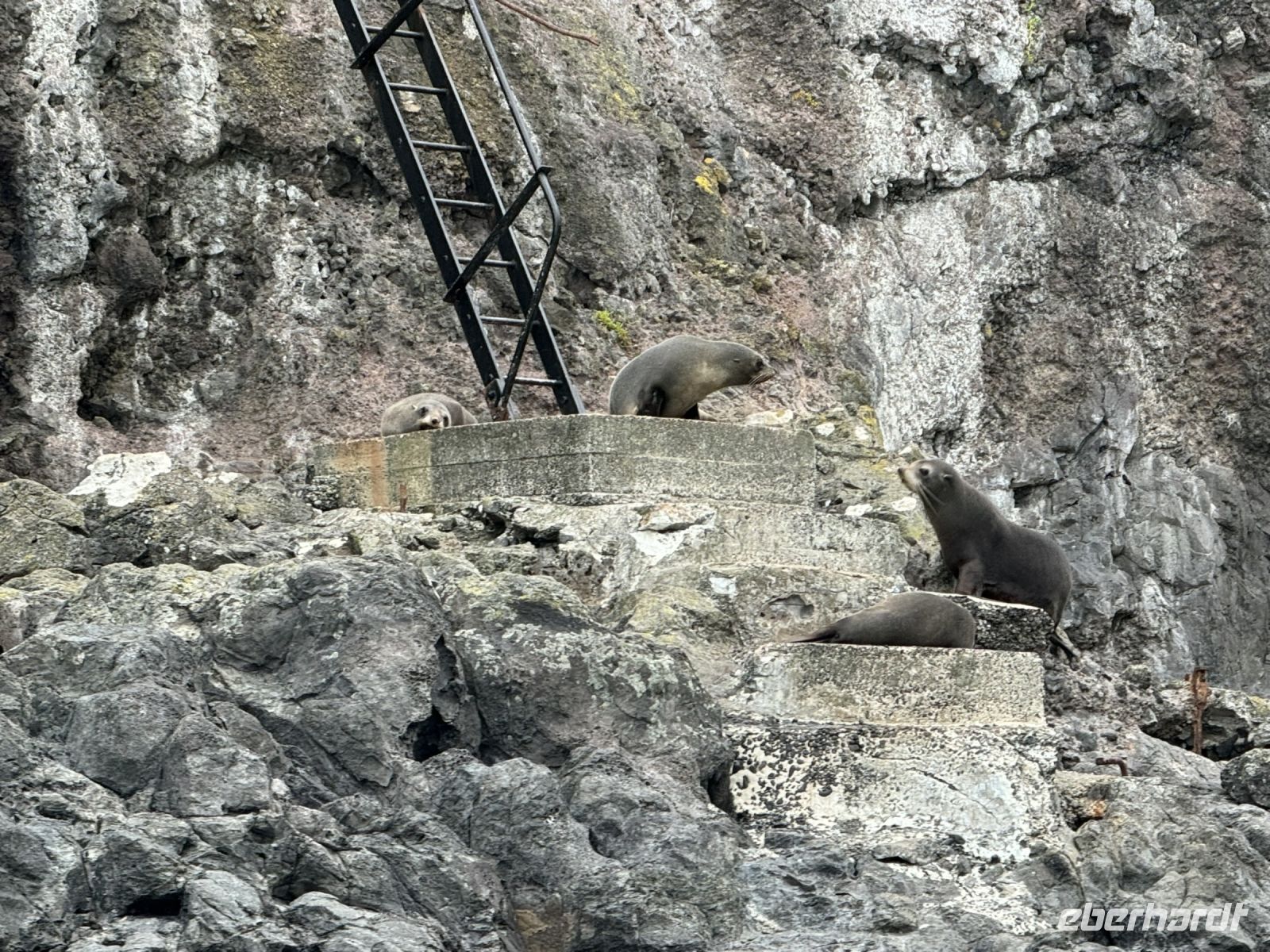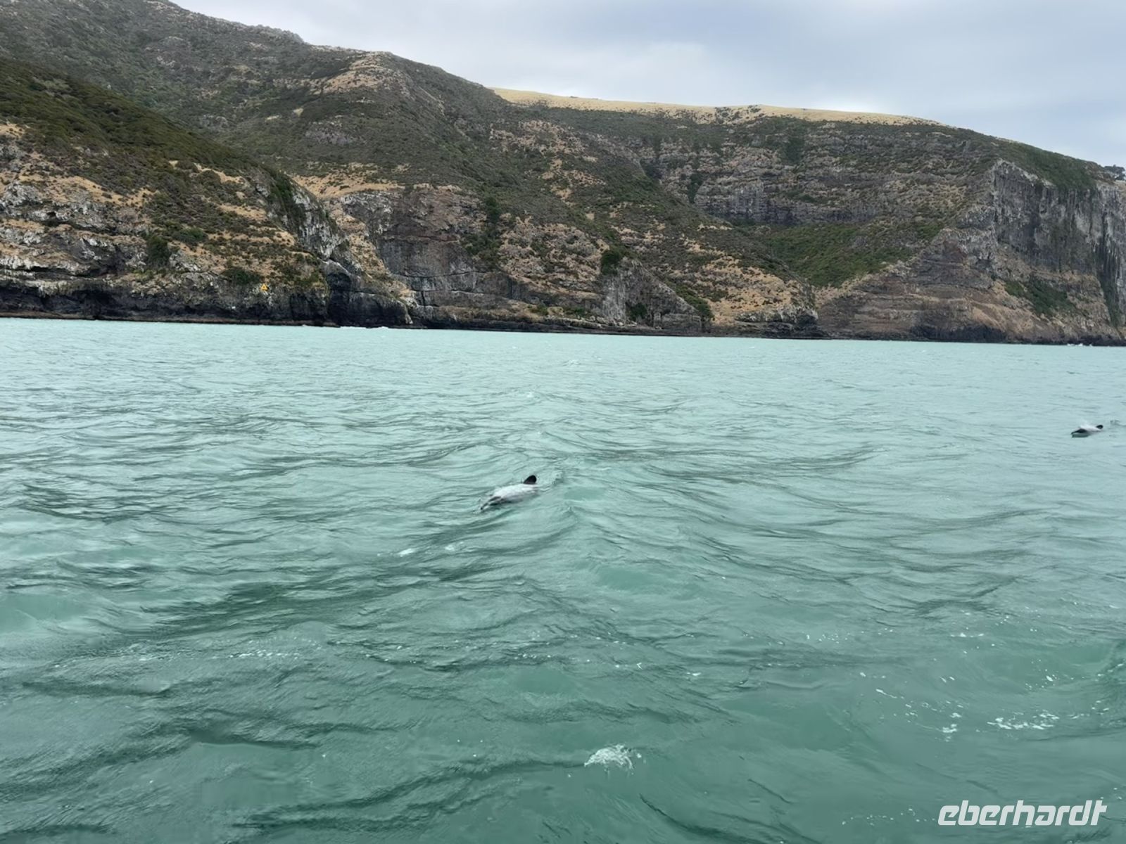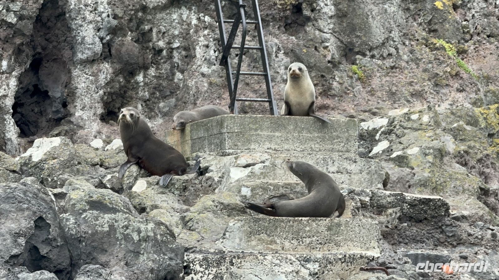 Obwohl der Himmel etwas bewölkt war, genossen wir angenehme Temperaturen und türkisfarbenes Wasser. Während wir entlang des alten Lavaverlaufs und der Höhlen fuhren, wurden wir von Delphinen begrüßt. Wir sahen außerdem Möwen, Kormorane, Seebären und Albatrosse, und später begegneten wir auch den seltenen Blauen Pinguinen. Sie kamen alle ganz nah an unser Boot heran, und wir erlebten ein unvergessliches Erlebnis.