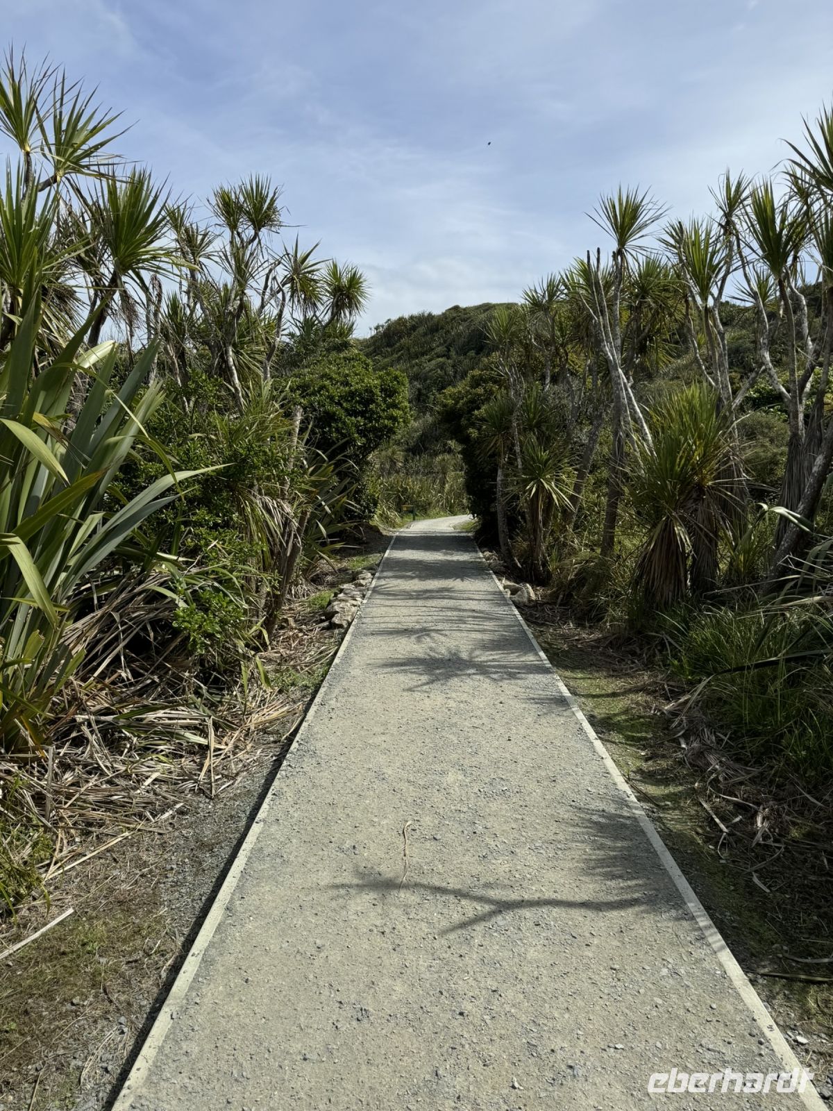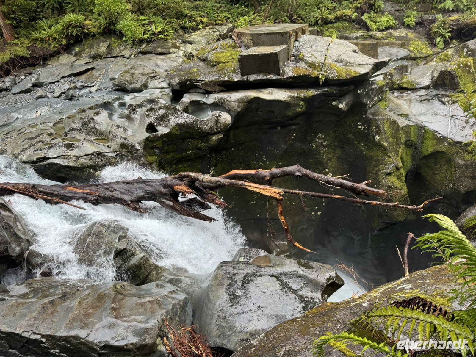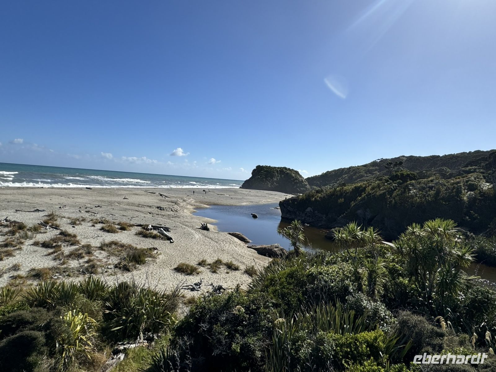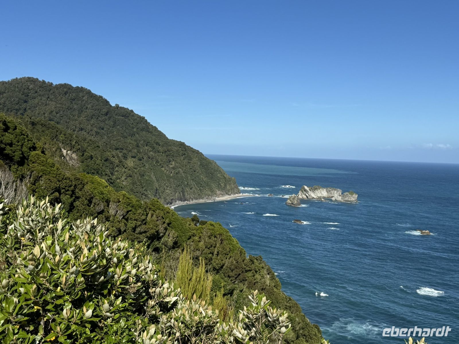 Wir fuhren weiter entlang der Westküste und machten unterwegs verschiedene Stopps, um die Fels-Formationen zu fotografieren, sowie zwei kleine Wanderung. Das erste war Trauman, in den gingen wir langsam runter zur Küstenlinie und fanden auf unserem Weg einen imposanten nördlichen Rata Baum sowie einen tollen Strand mit kleinen Wasserfällen.