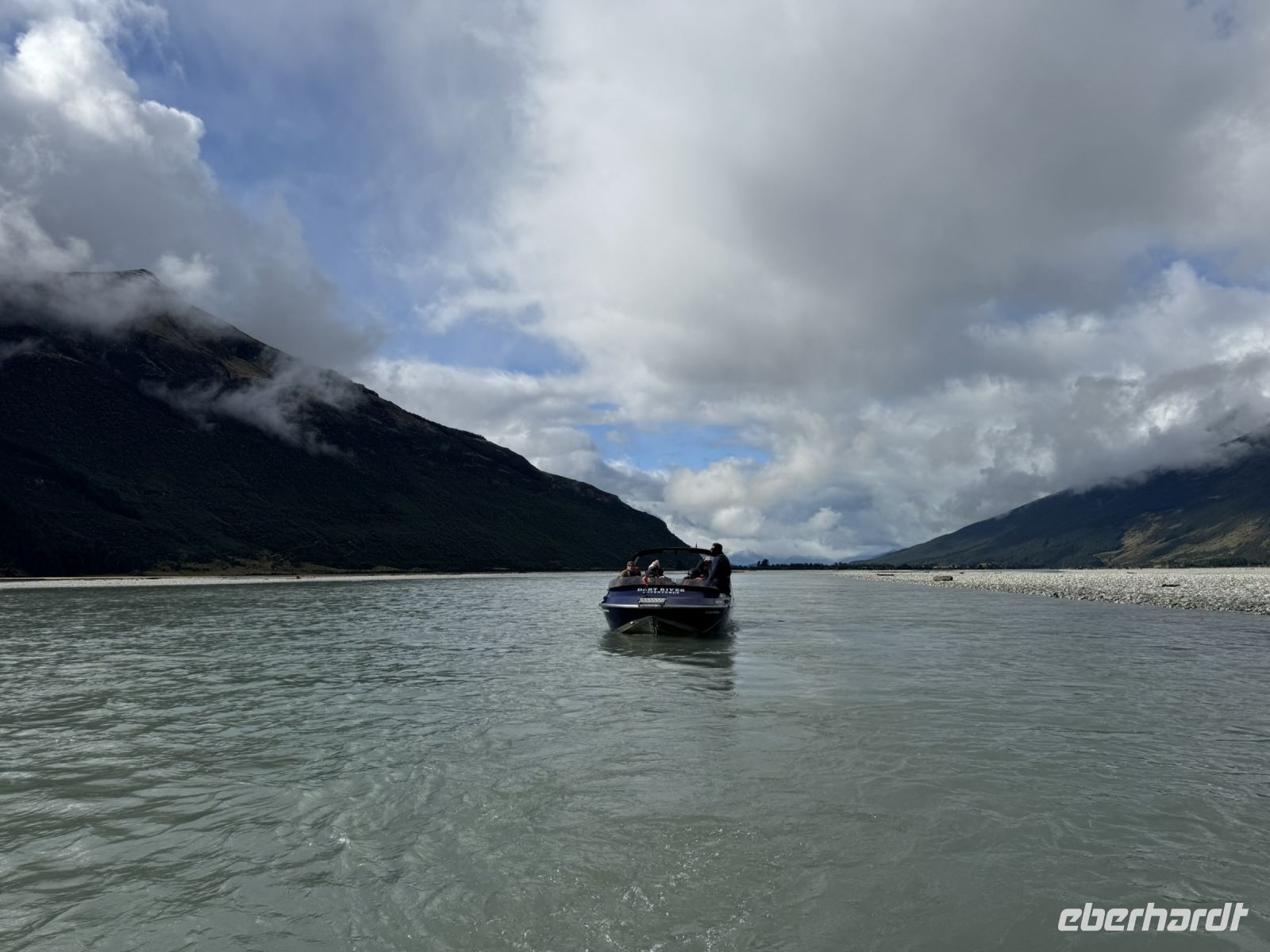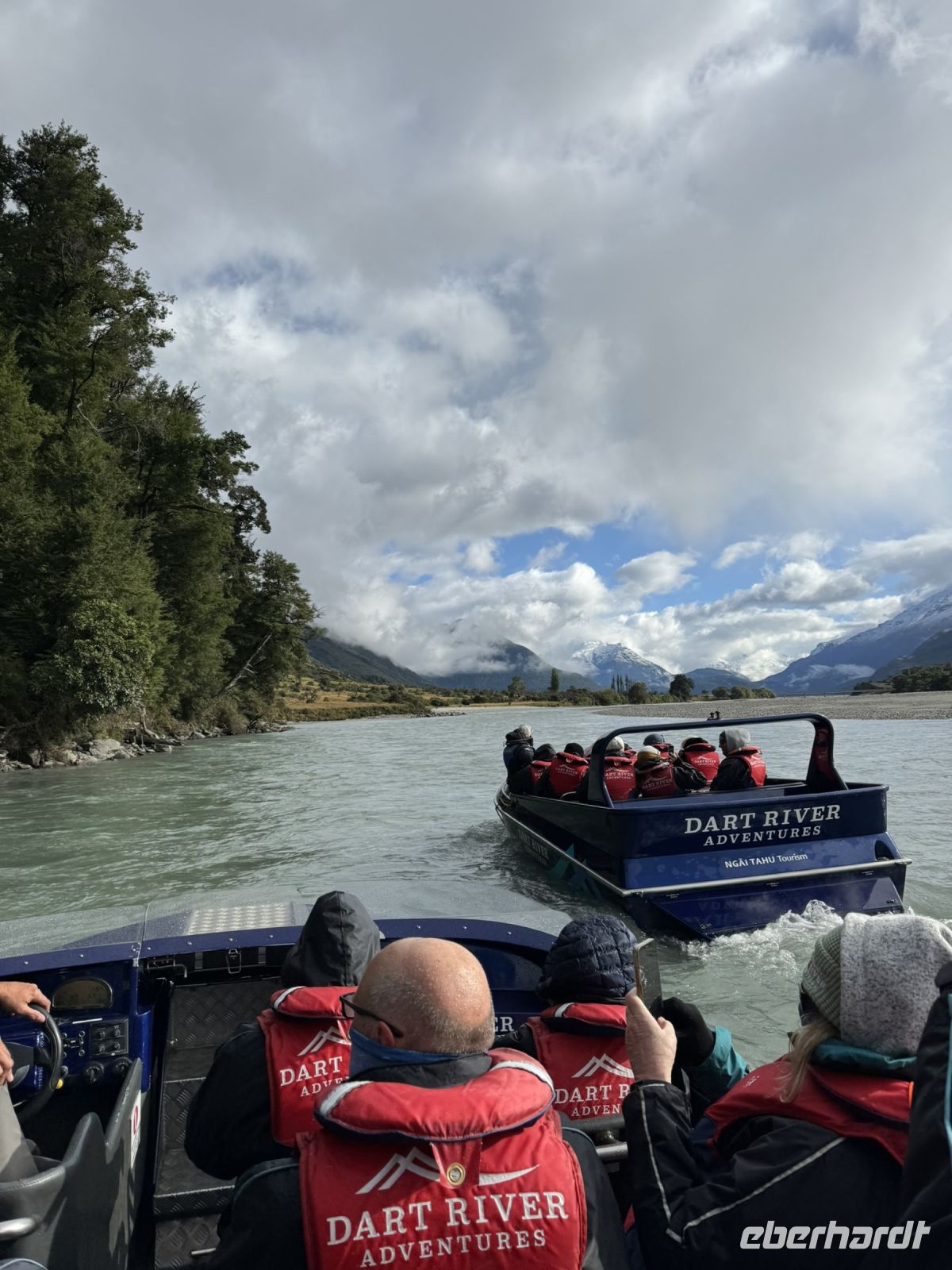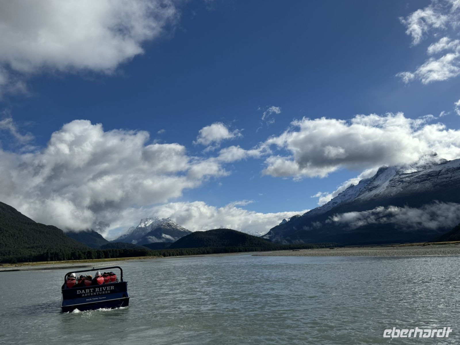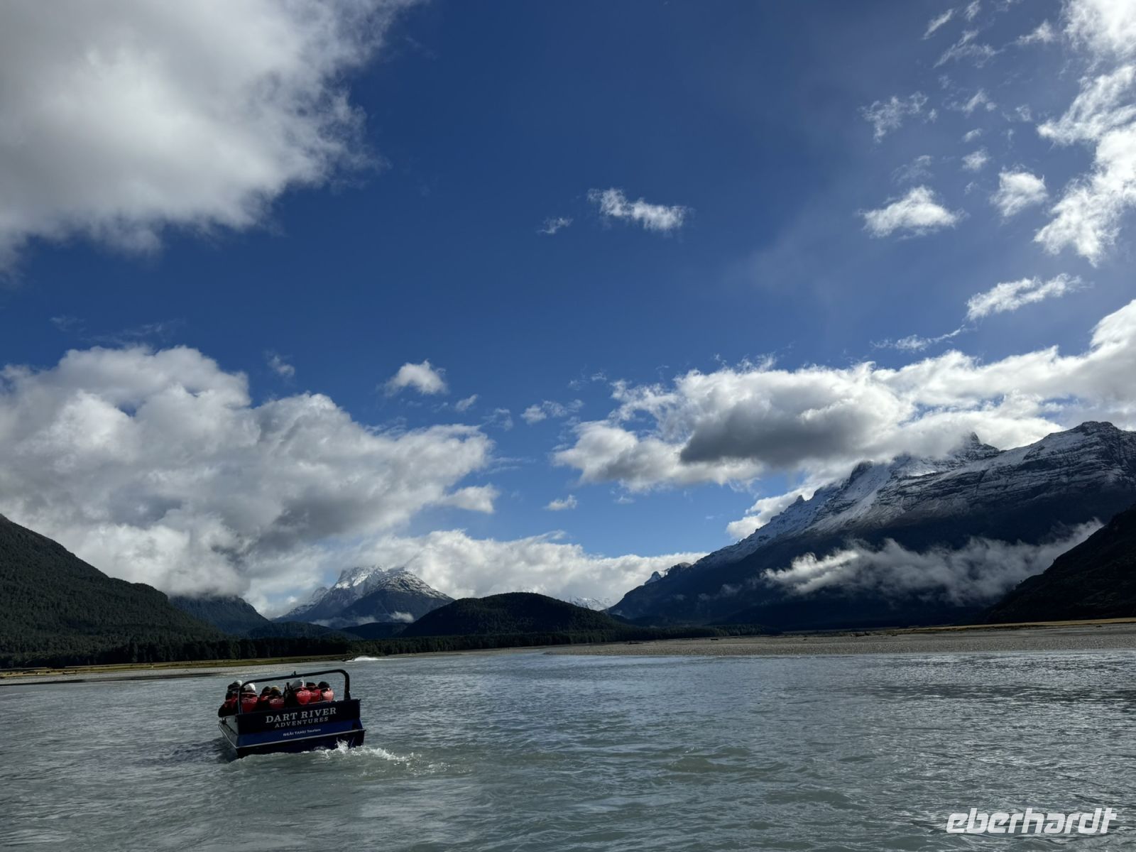 Eine andere Möglichkeit war die Dart River Safari von Glenorchy zum Dart River und nach Paradise. Unser Abenteuer begann mit einer entspannten Busfahrt entlang des Wakatipu-Sees mit schönen Ausblicken zu den Südalpen bis zum Dorf Glenorchy. Da verließen wir unseren Bus und wurden gut für unsere Bootsfahrt vorbereitet. In unser Jet Boot eingestiegen, begann die lustige und rasante Fahrt! Zunächst fuhren wir auf dem See und anschließend auf dem Dart River und drehten hier unsere Runden. Außerdem konnte man alle Berge ganz klar sehen und etwas mehr darüber kennenlernen. In dieser schönen Gegend wurde Isengard von "Der Herr der Ringe" gedreht.