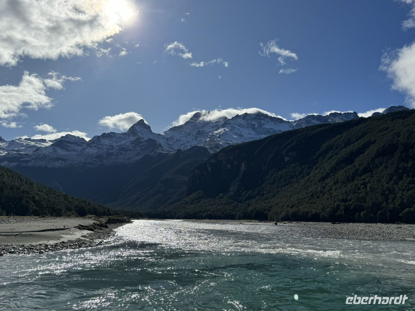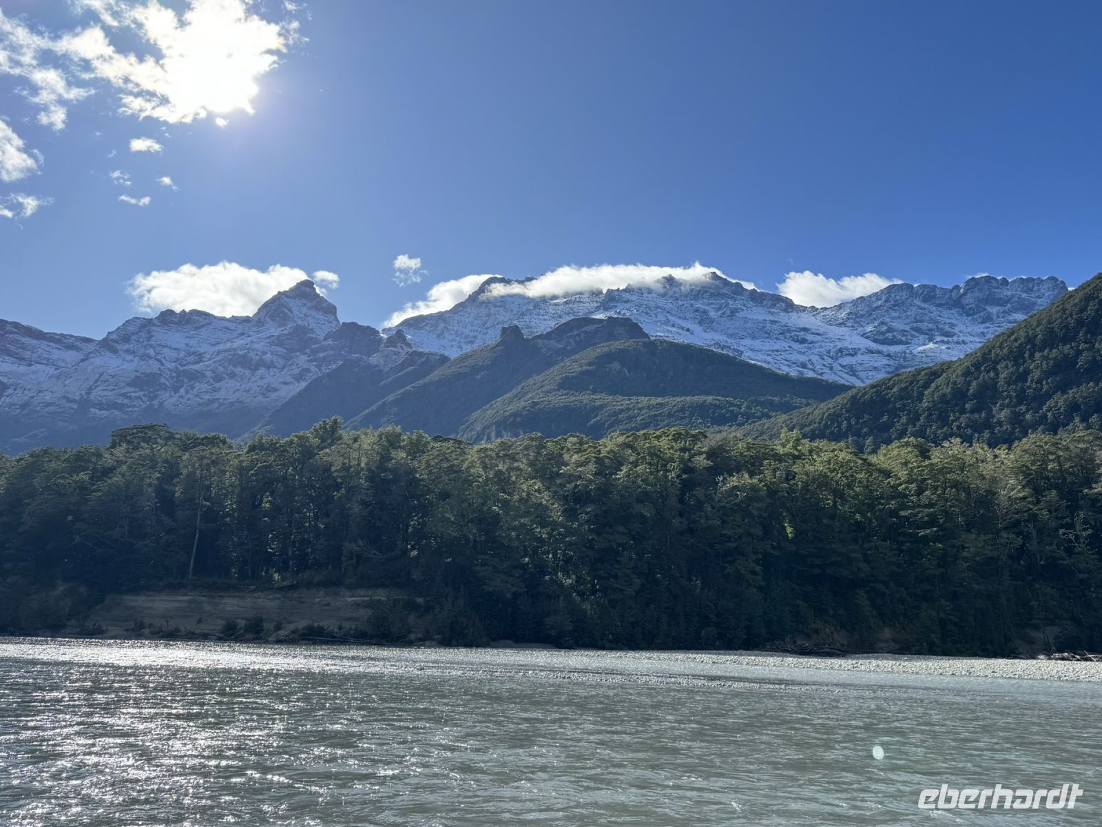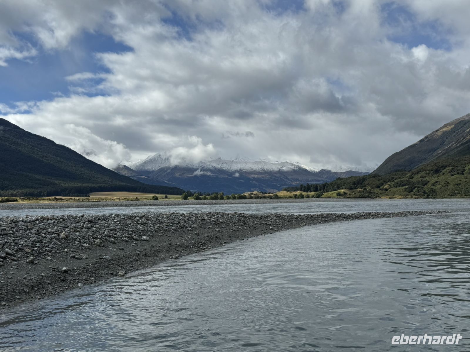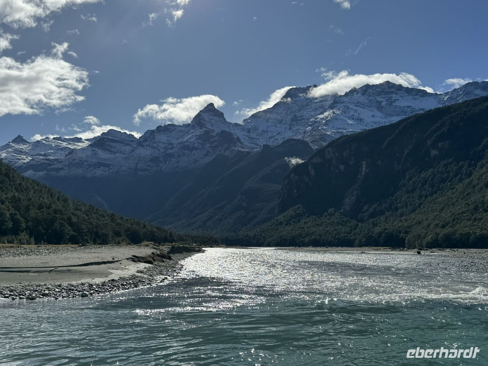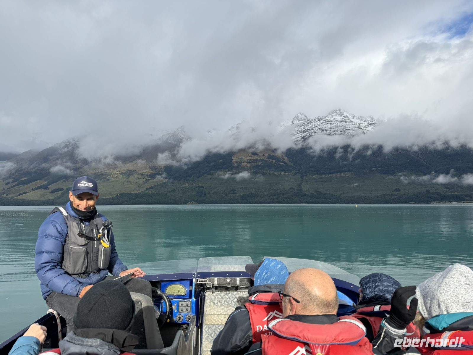 Eine andere Möglichkeit war die Dart River Safari von Glenorchy zum Dart River und nach Paradise. Unser Abenteuer begann mit einer entspannten Busfahrt entlang des Wakatipu-Sees mit schönen Ausblicken zu den Südalpen bis zum Dorf Glenorchy. Da verließen wir unseren Bus und wurden gut für unsere Bootsfahrt vorbereitet. In unser Jet Boot eingestiegen, begann die lustige und rasante Fahrt! Zunächst fuhren wir auf dem See und anschließend auf dem Dart River und drehten hier unsere Runden. Außerdem konnte man alle Berge ganz klar sehen und etwas mehr darüber kennenlernen. In dieser schönen Gegend wurde Isengard von "Der Herr der Ringe" gedreht.
