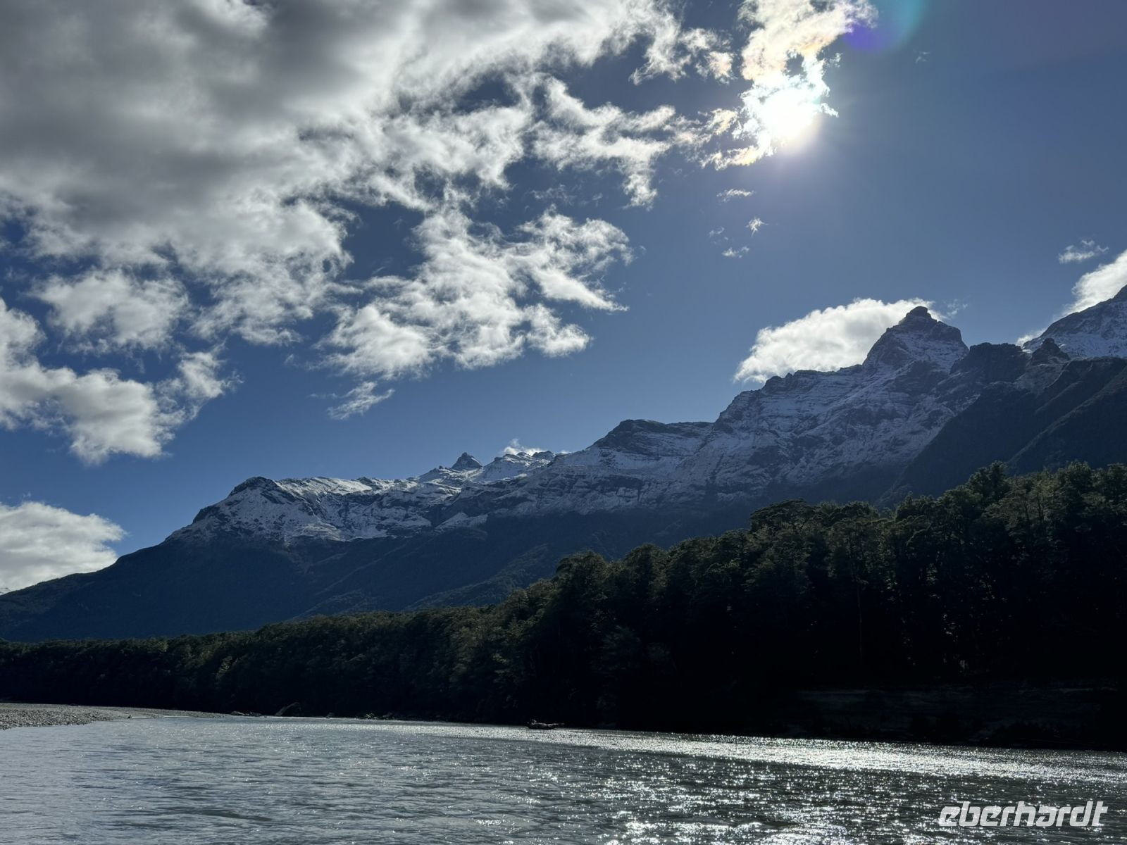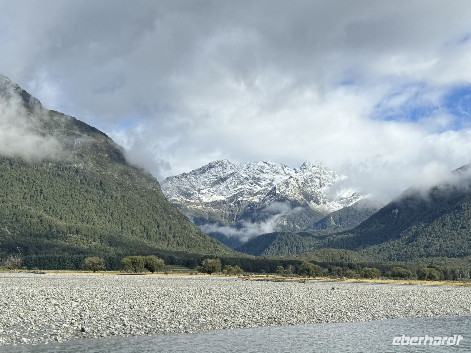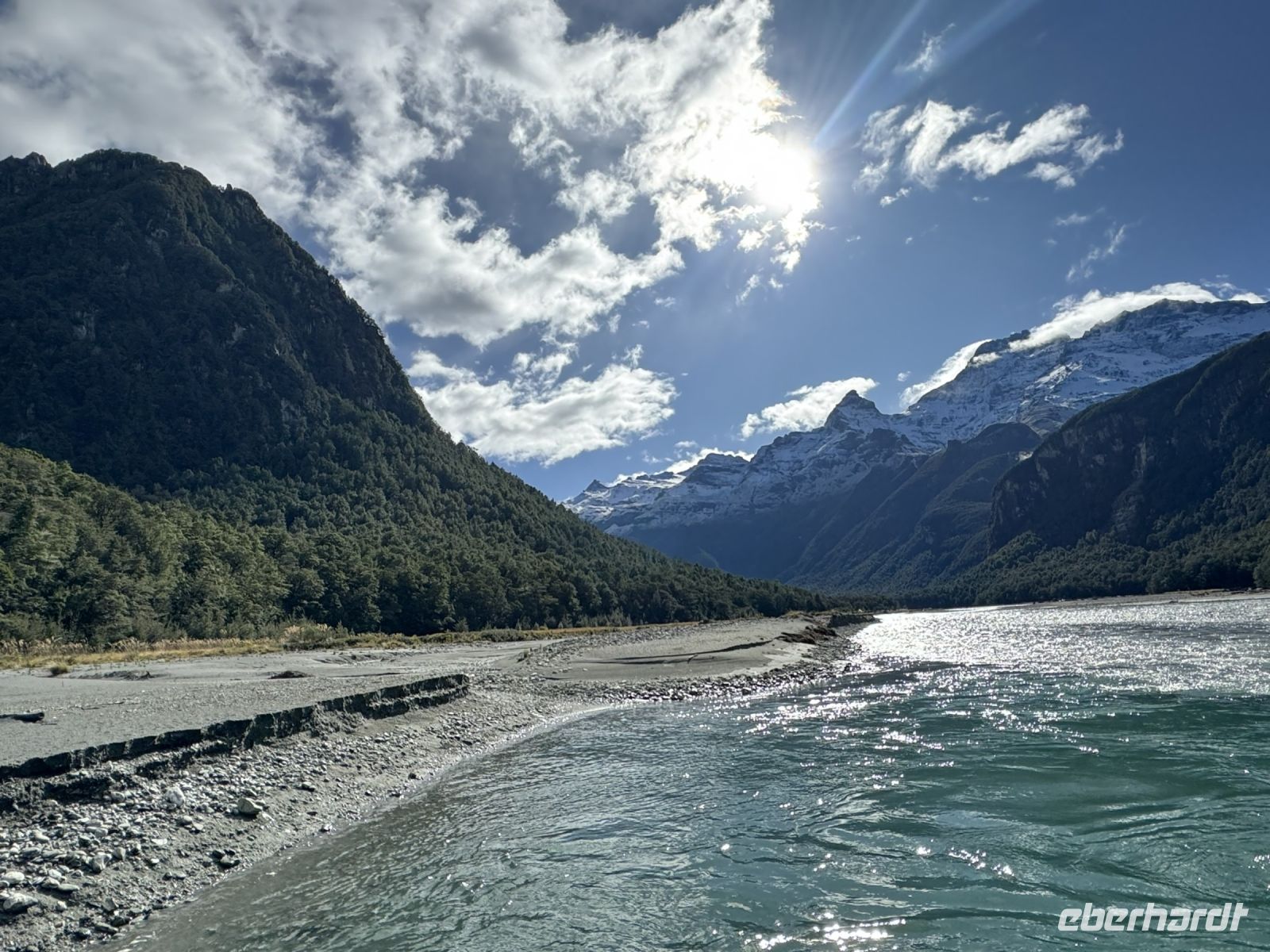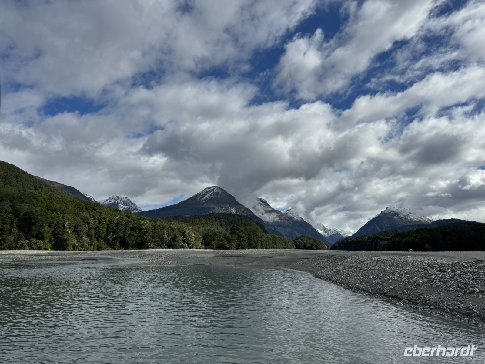 Eine andere Möglichkeit war die Dart River Safari von Glenorchy zum Dart River und nach Paradise. Unser Abenteuer begann mit einer entspannten Busfahrt entlang des Wakatipu-Sees mit schönen Ausblicken zu den Südalpen bis zum Dorf Glenorchy. Da verließen wir unseren Bus und wurden gut für unsere Bootsfahrt vorbereitet. In unser Jet Boot eingestiegen, begann die lustige und rasante Fahrt! Zunächst fuhren wir auf dem See und anschließend auf dem Dart River und drehten hier unsere Runden. Außerdem konnte man alle Berge ganz klar sehen und etwas mehr darüber kennenlernen. In dieser schönen Gegend wurde Isengard von "Der Herr der Ringe" gedreht.