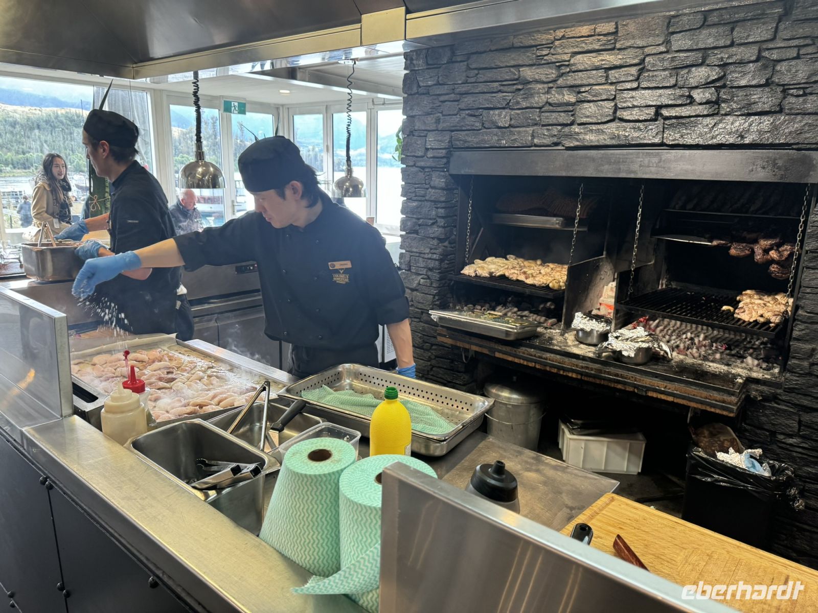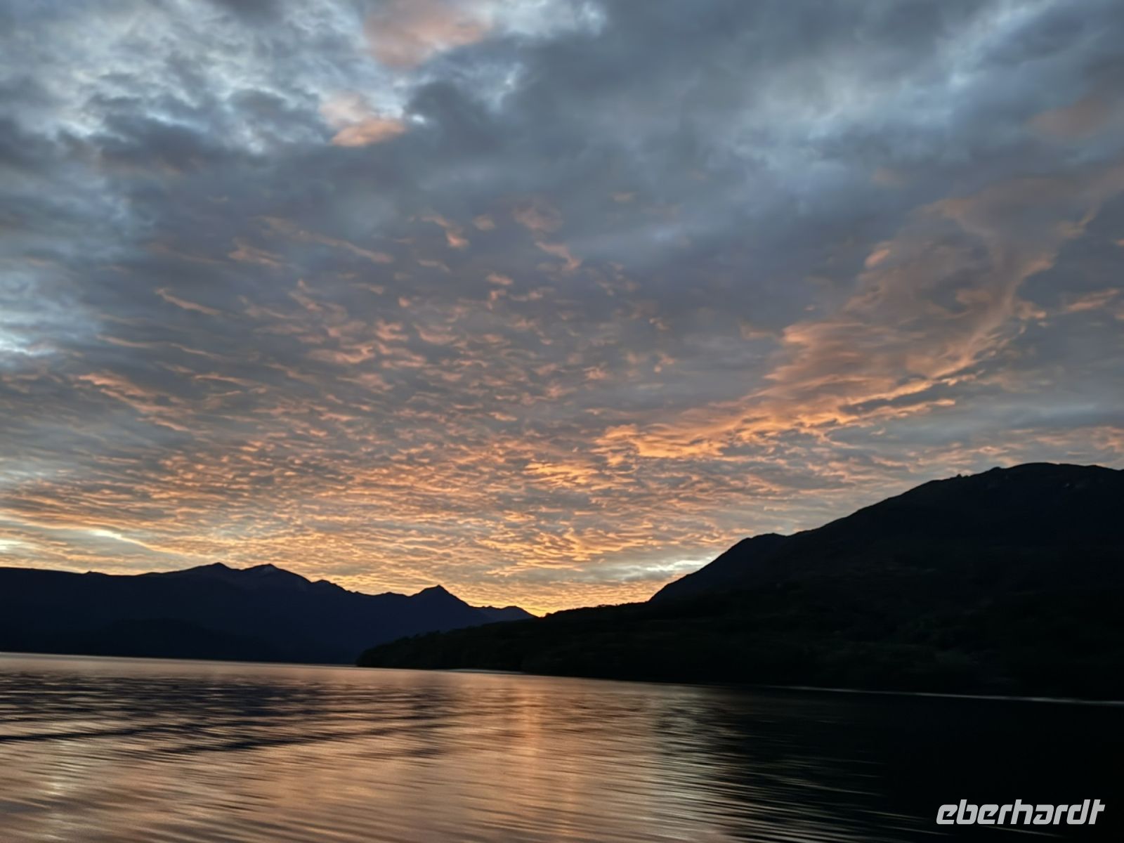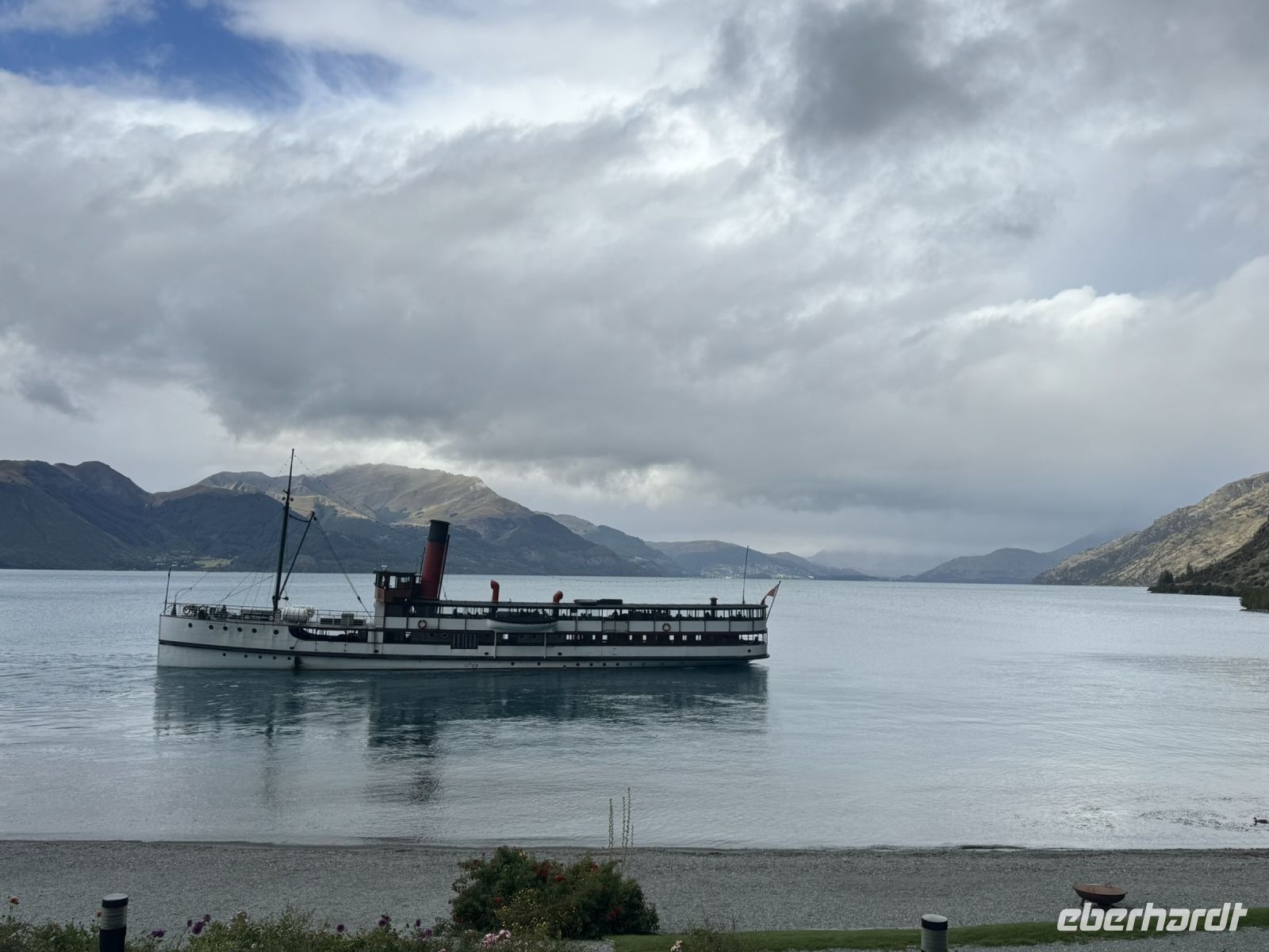 Am Abend sind wir mit dem TSS Earnslaw Dampschiff auf dem Wakatipu-See zur Walter Peak Farm gefahren. Bei der Fahrt konnte man die Südalpen sehen und die Motoren des Dampfschiffs hören.