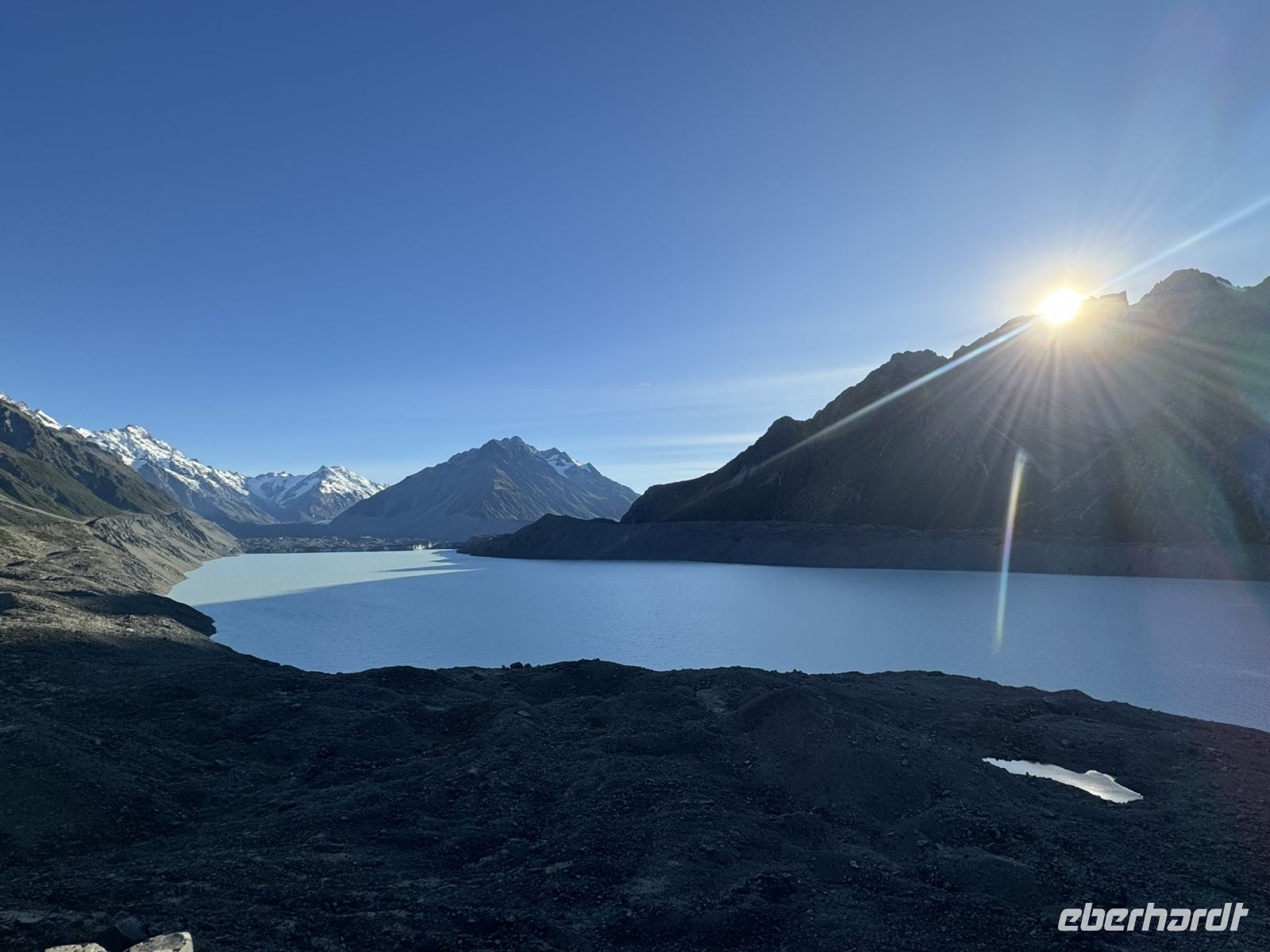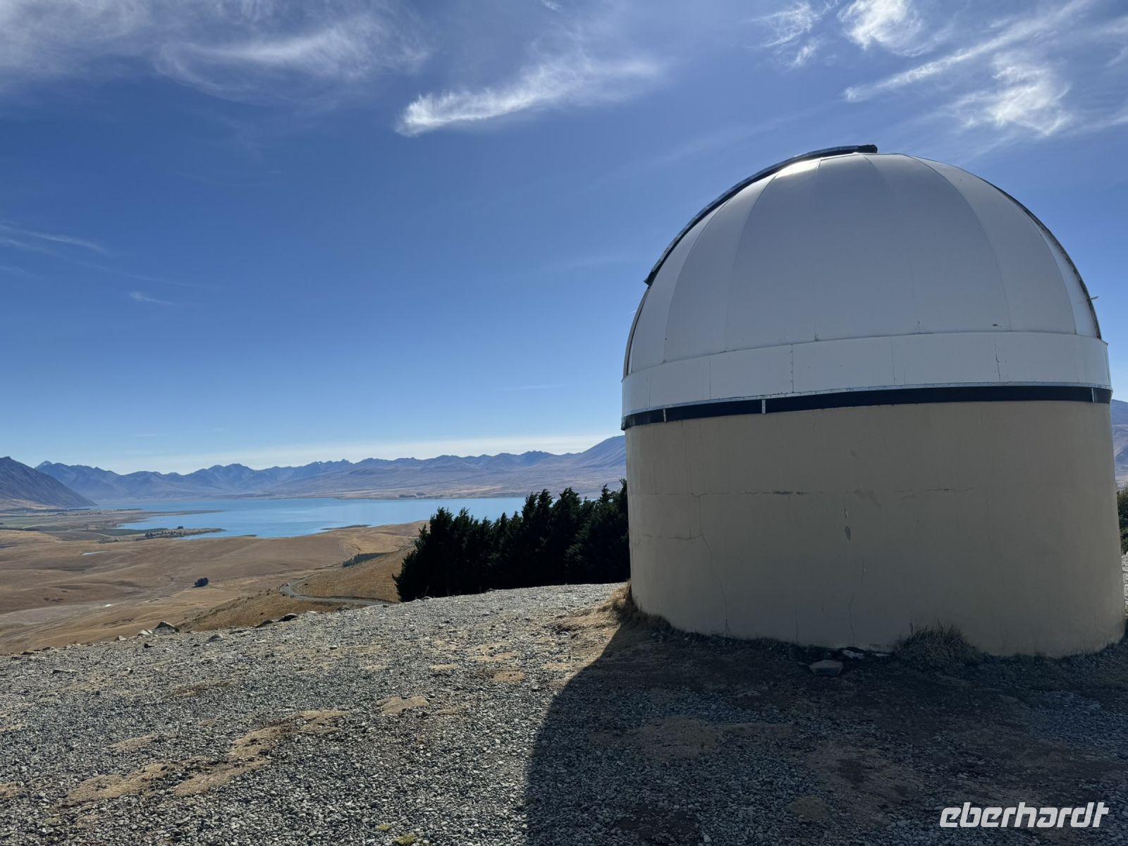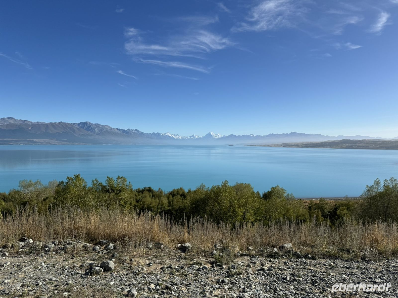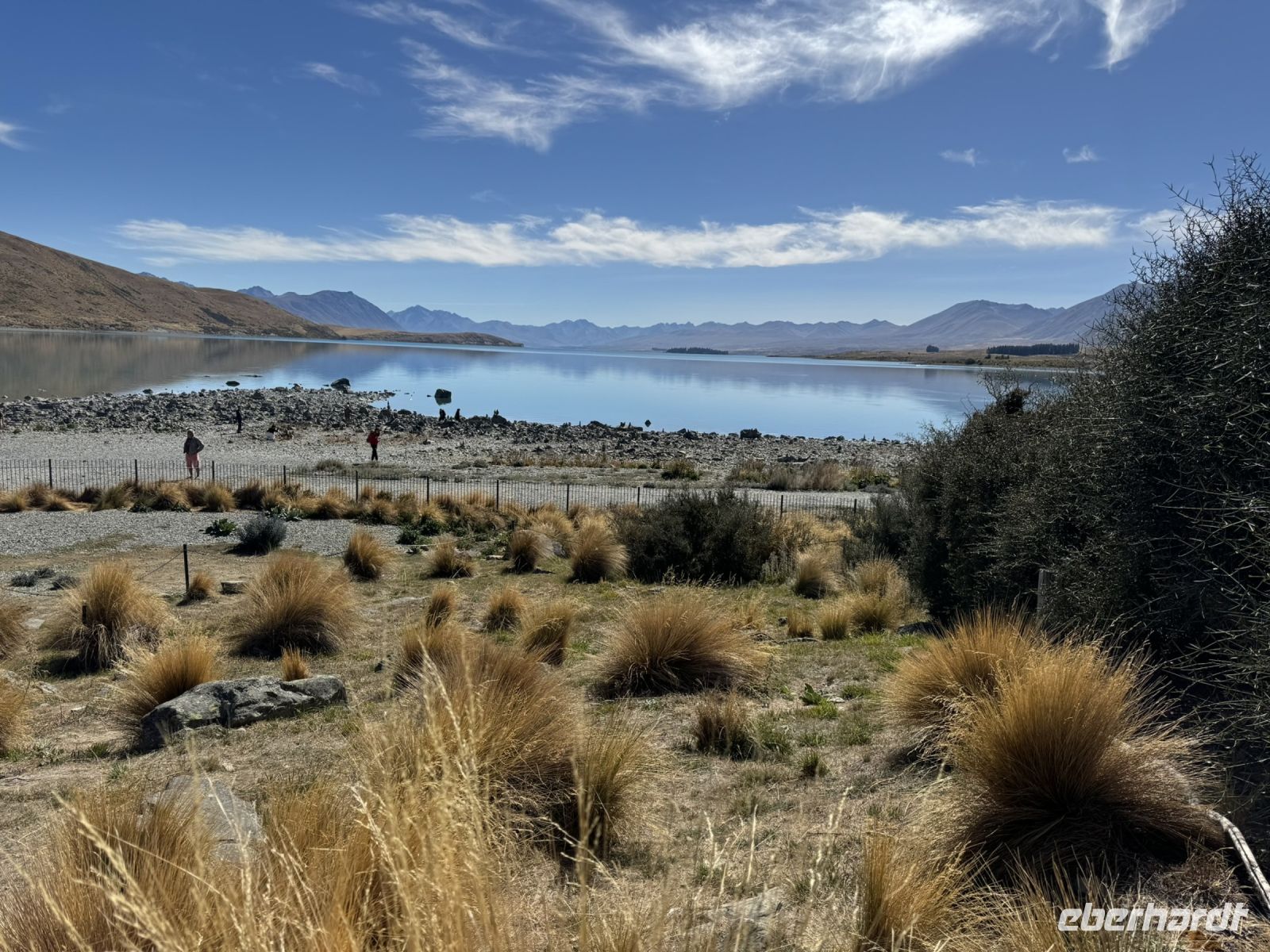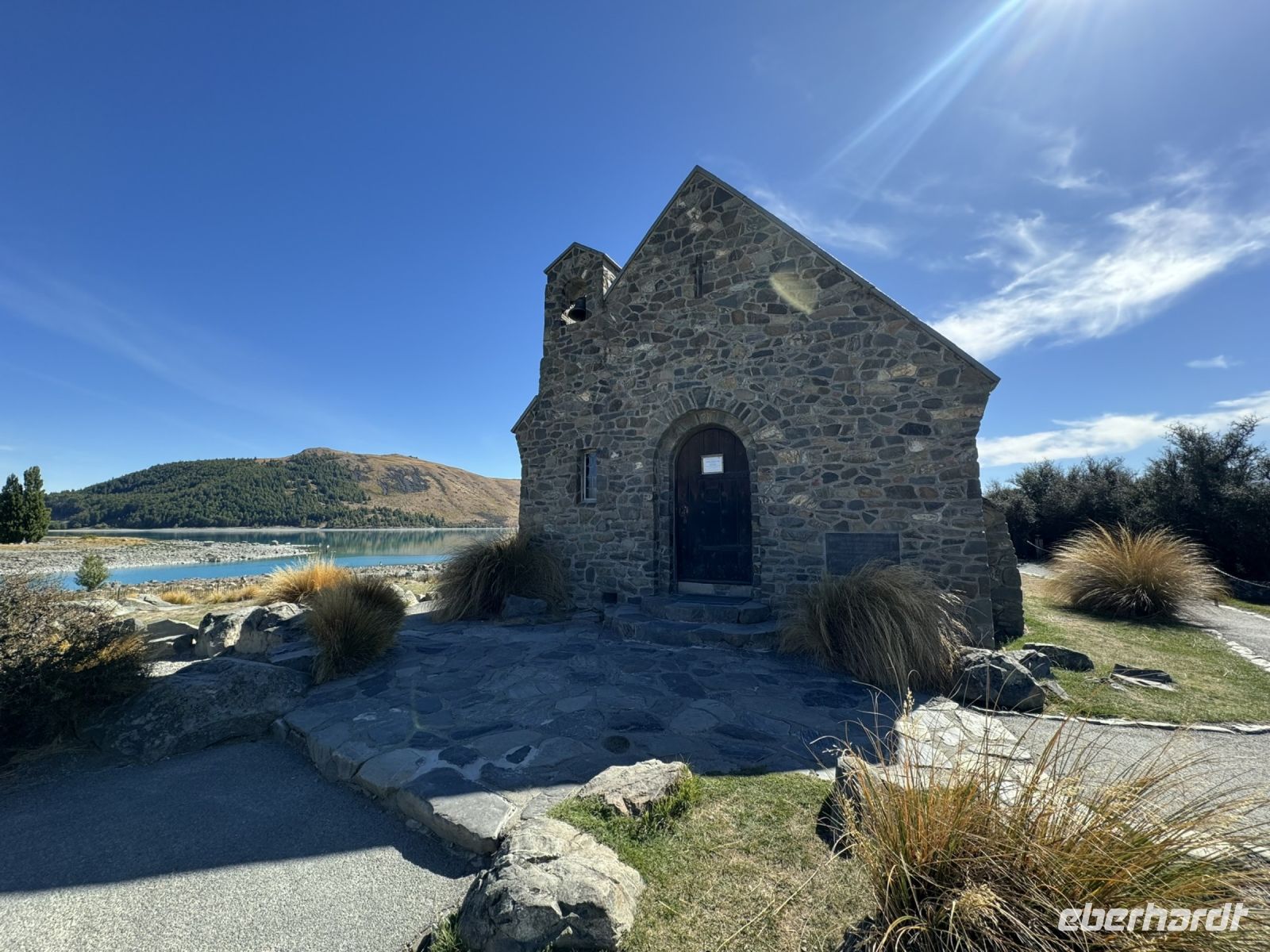 In den frühen, kühlen Morgenstunden strebten wir danach, die ersten Sonnenstrahlen des Tages einzufangen, mit den besten Aussichten auf den Tasman-Gletscher. Es war eine kurze, aber intensive Strecke, die eine angenehme Überraschung für die Augen bereithielt. Langsam stiegen die Temperaturen, und wir setzten unsere Reise fort zum nächsten Ziel: dem Sternenobservatorium am Lake Tekapo. Dort fanden wir am blauen See und Himmel den perfekten Ort, um ein schönes Geburtstagsständchen für unsere liebe Gaby anzustimmen. Mit Musik und Party-Atmosphäre erreichten wir das Dorf und erblickten die Kirche des Guten Hirten.