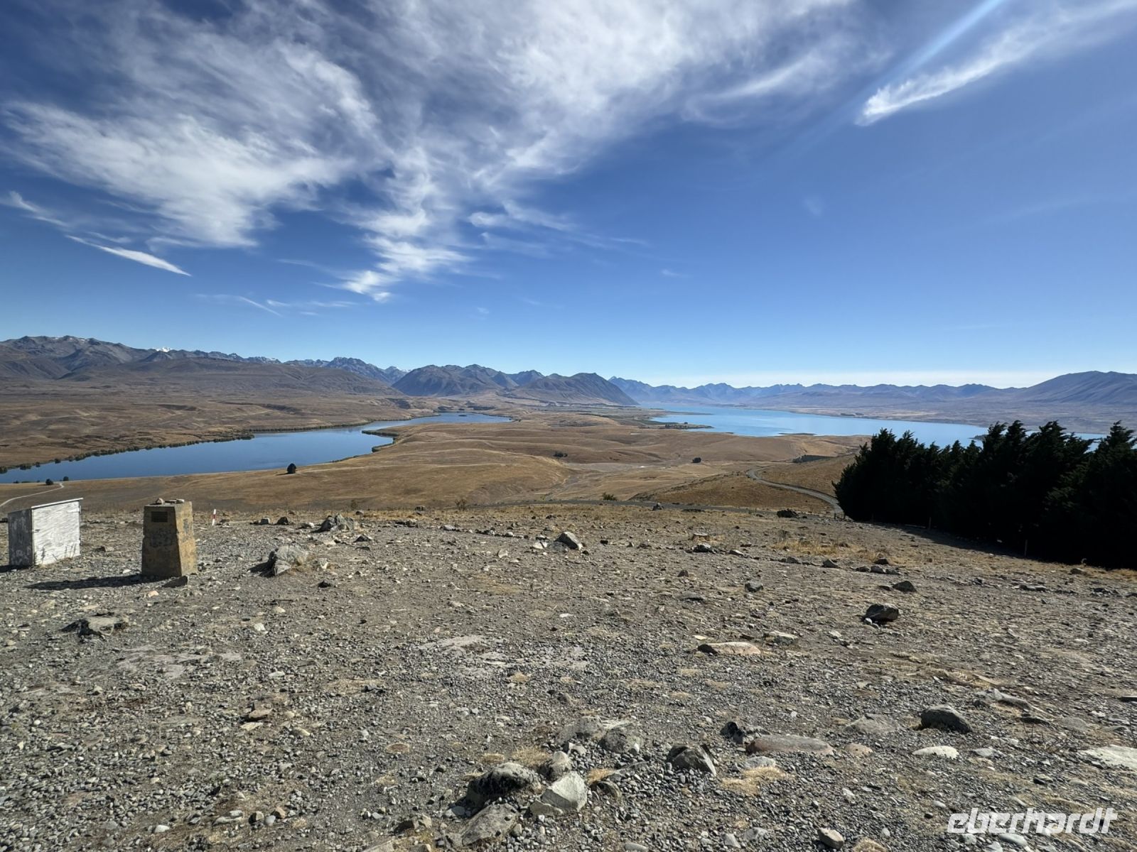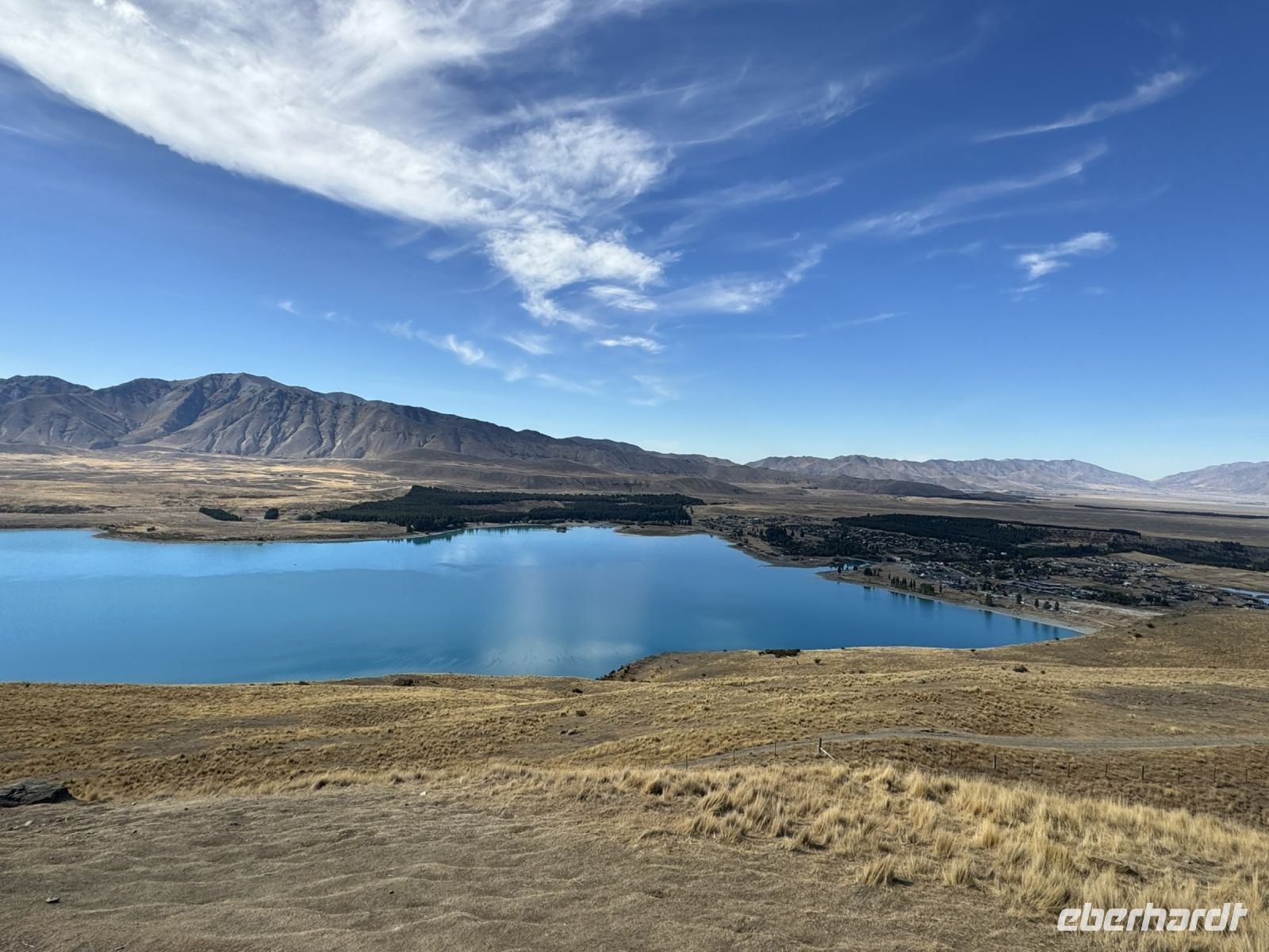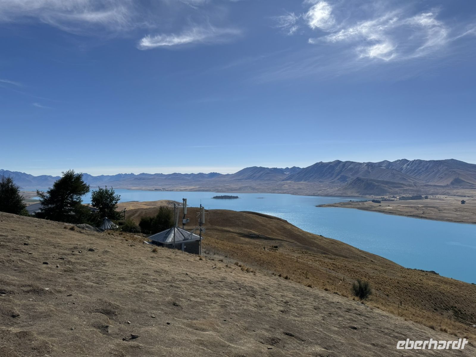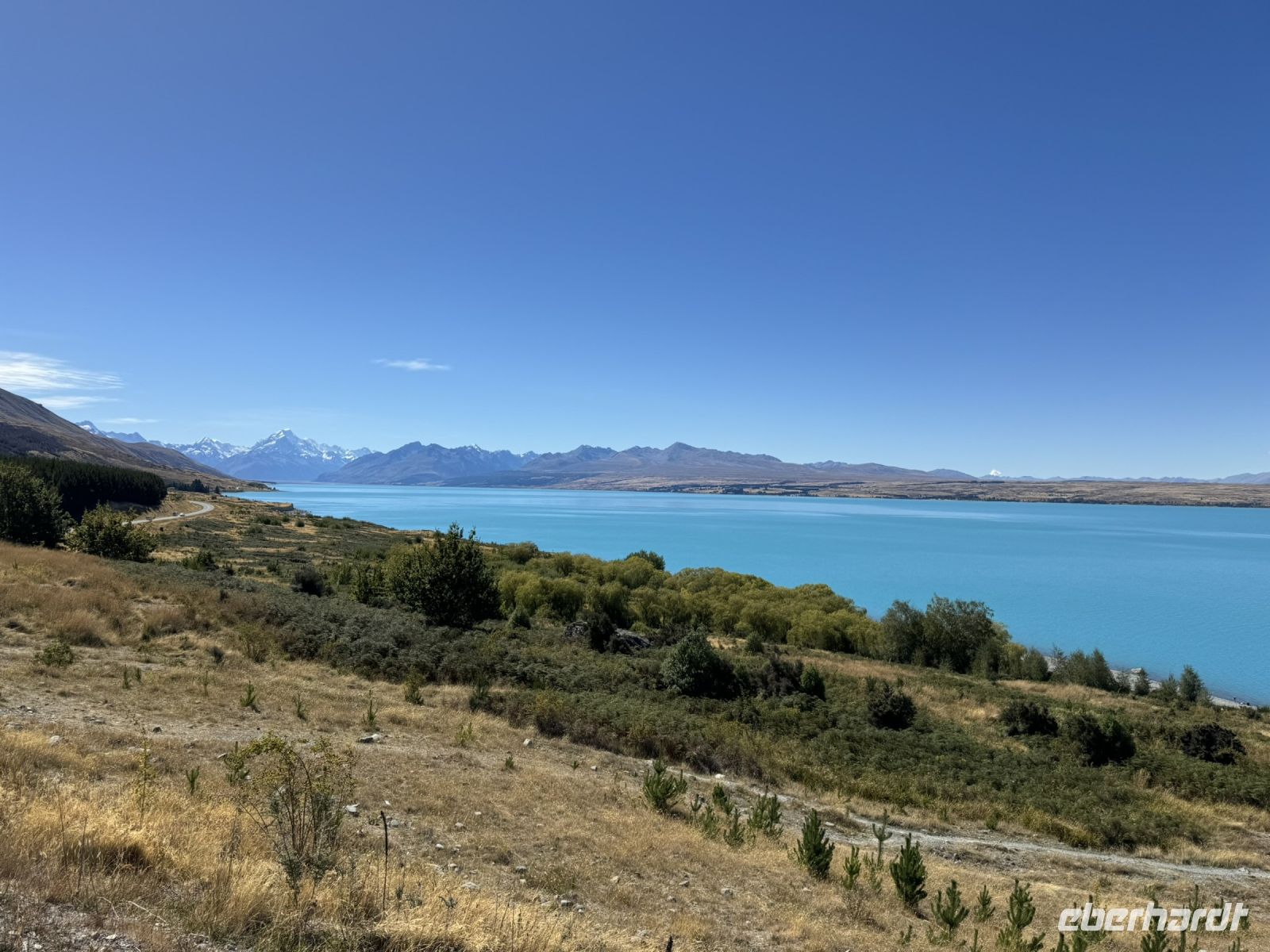 In den frühen, kühlen Morgenstunden strebten wir danach, die ersten Sonnenstrahlen des Tages einzufangen, mit den besten Aussichten auf den Tasman-Gletscher. Es war eine kurze, aber intensive Strecke, die eine angenehme Überraschung für die Augen bereithielt. Langsam stiegen die Temperaturen, und wir setzten unsere Reise fort zum nächsten Ziel: dem Sternenobservatorium am Lake Tekapo. Dort fanden wir am blauen See und Himmel den perfekten Ort, um ein schönes Geburtstagsständchen für unsere liebe Gaby anzustimmen. Mit Musik und Party-Atmosphäre erreichten wir das Dorf und erblickten die Kirche des Guten Hirten.