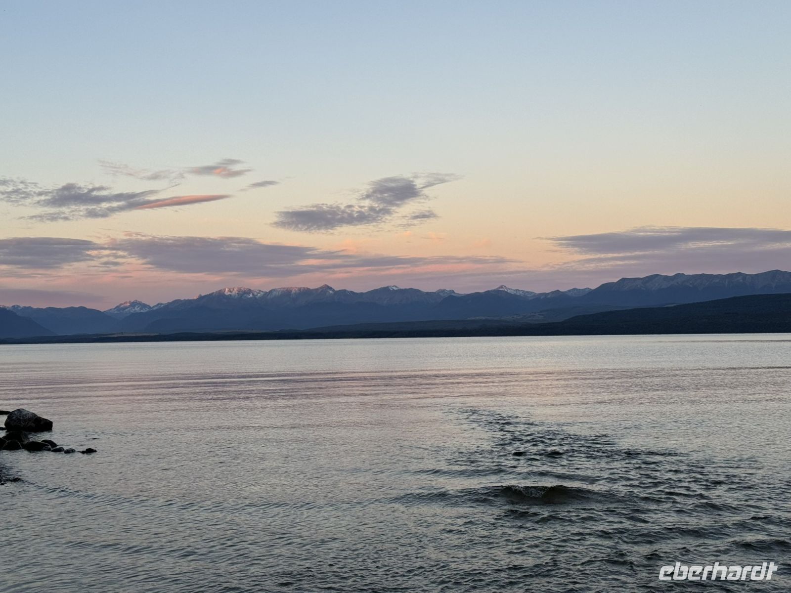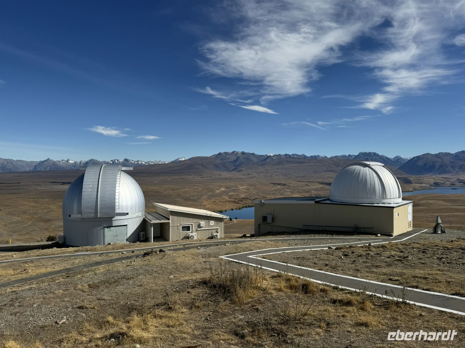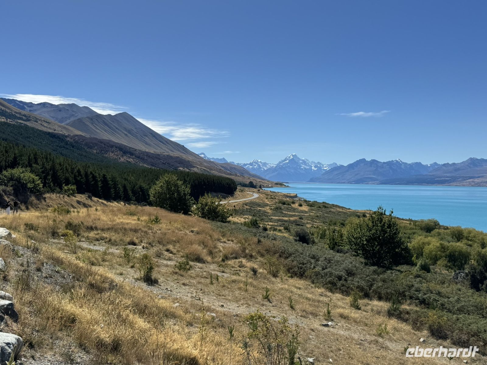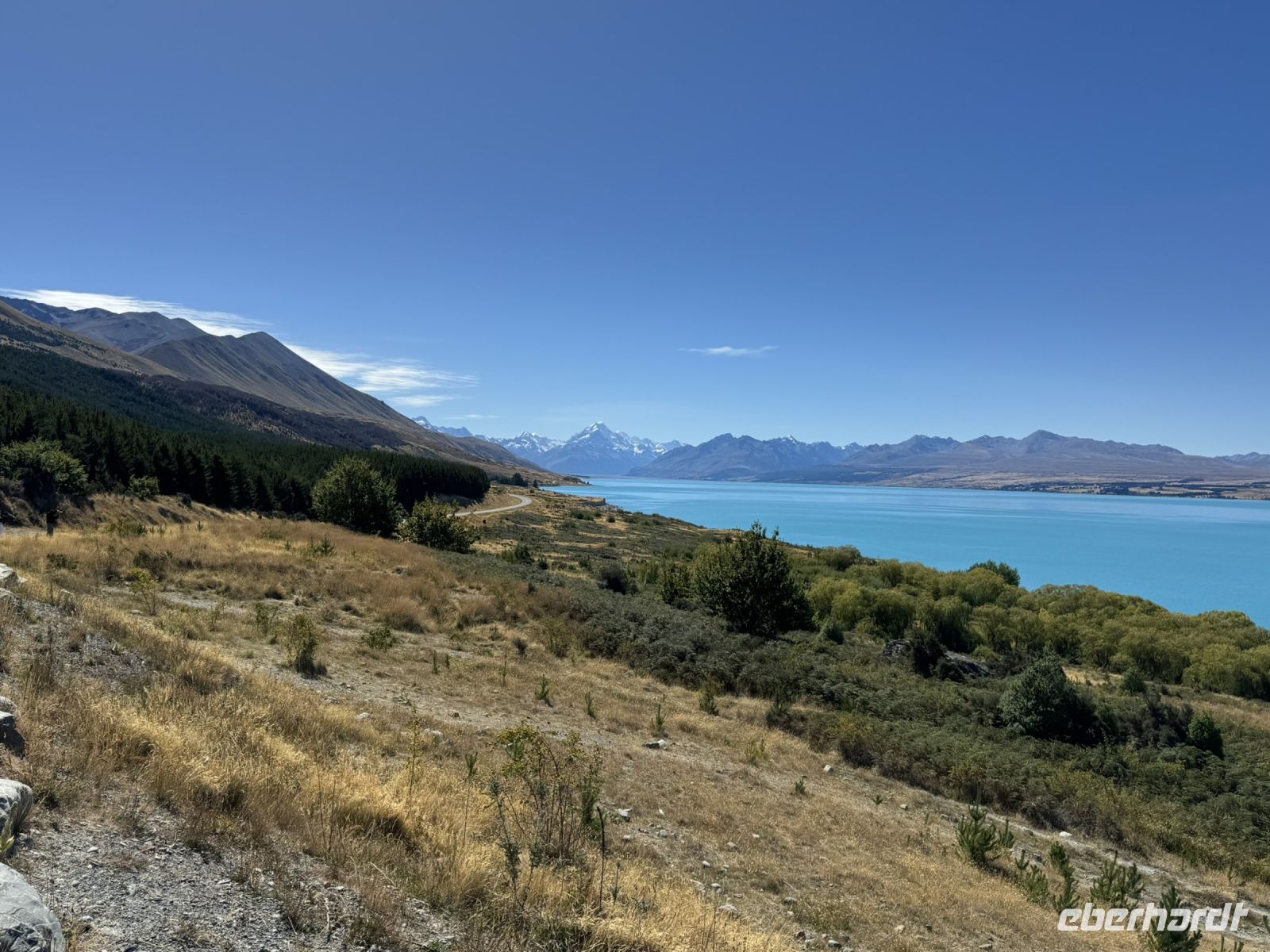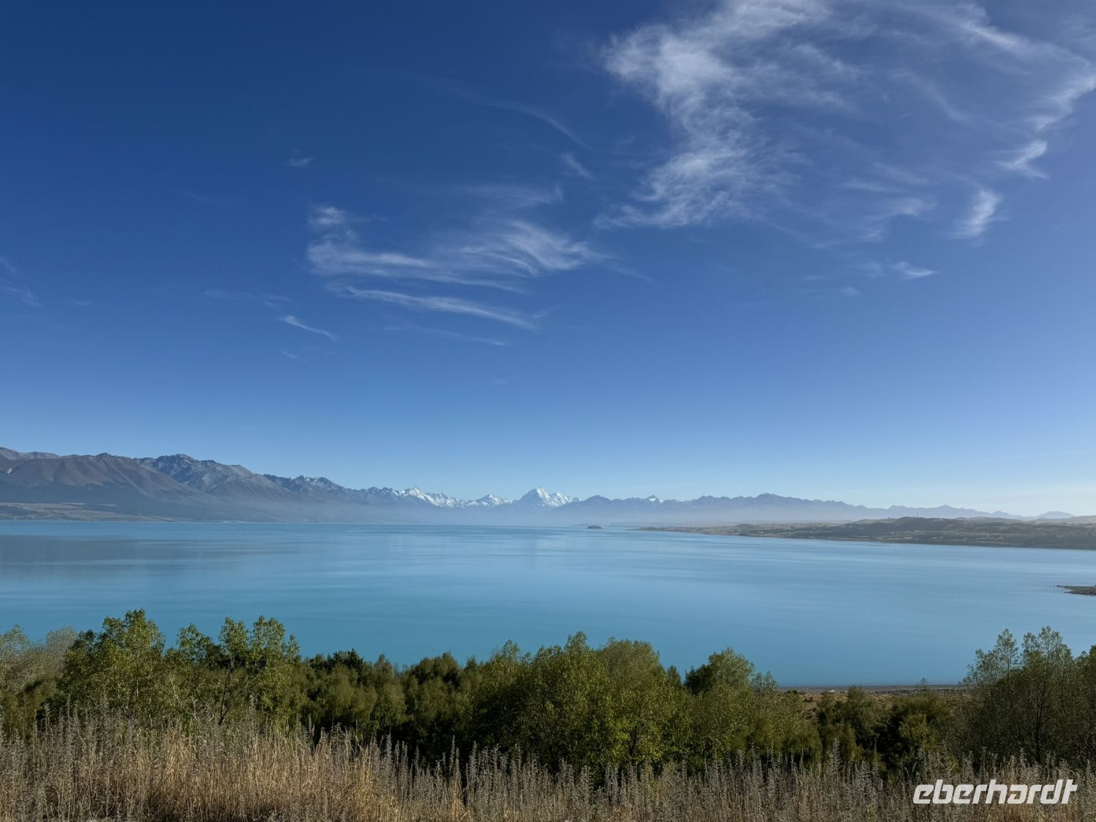 In den frühen, kühlen Morgenstunden strebten wir danach, die ersten Sonnenstrahlen des Tages einzufangen, mit den besten Aussichten auf den Tasman-Gletscher. Es war eine kurze, aber intensive Strecke, die eine angenehme Überraschung für die Augen bereithielt. Langsam stiegen die Temperaturen, und wir setzten unsere Reise fort zum nächsten Ziel: dem Sternenobservatorium am Lake Tekapo. Dort fanden wir am blauen See und Himmel den perfekten Ort, um ein schönes Geburtstagsständchen für unsere liebe Gaby anzustimmen. Mit Musik und Party-Atmosphäre erreichten wir das Dorf und erblickten die Kirche des Guten Hirten.