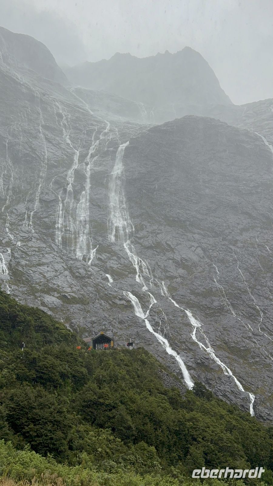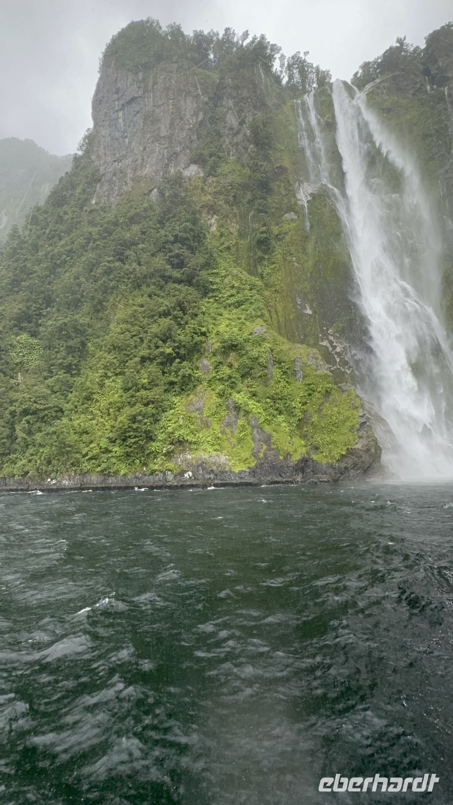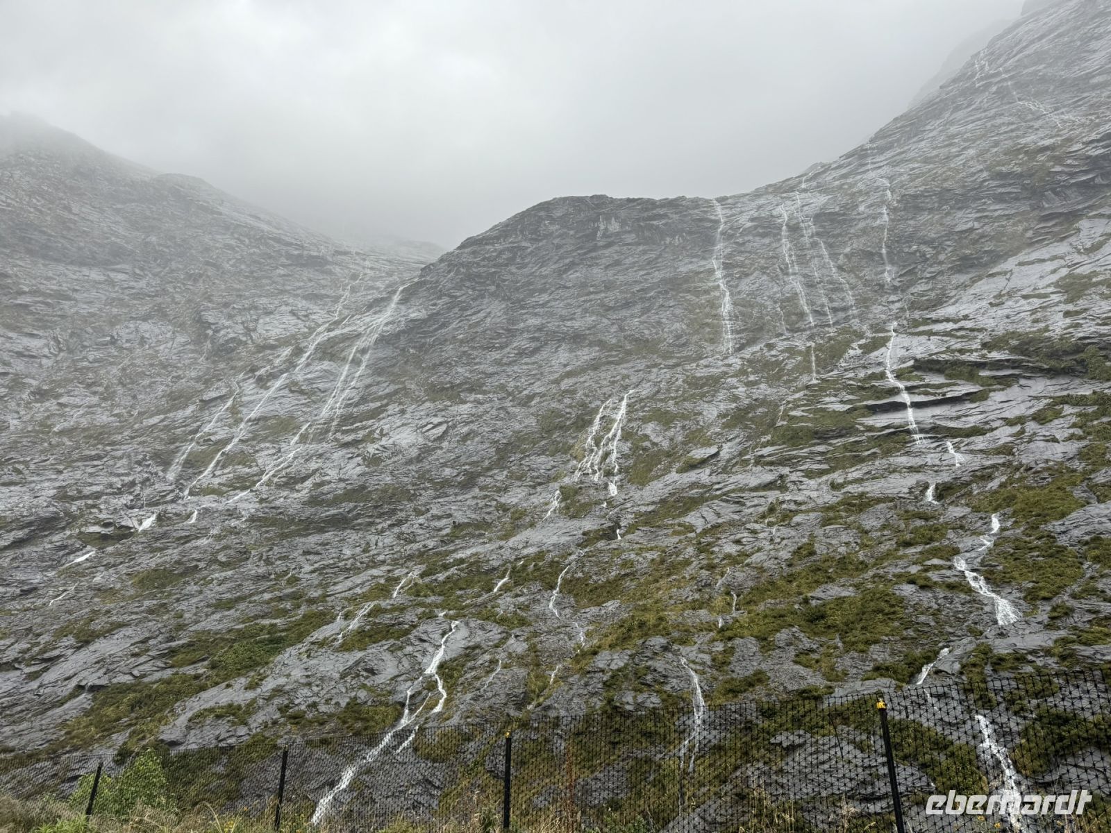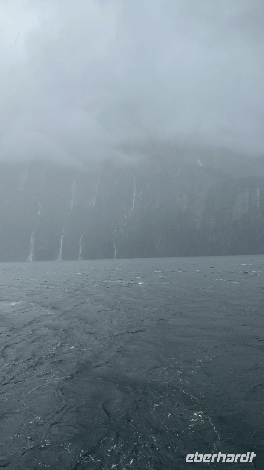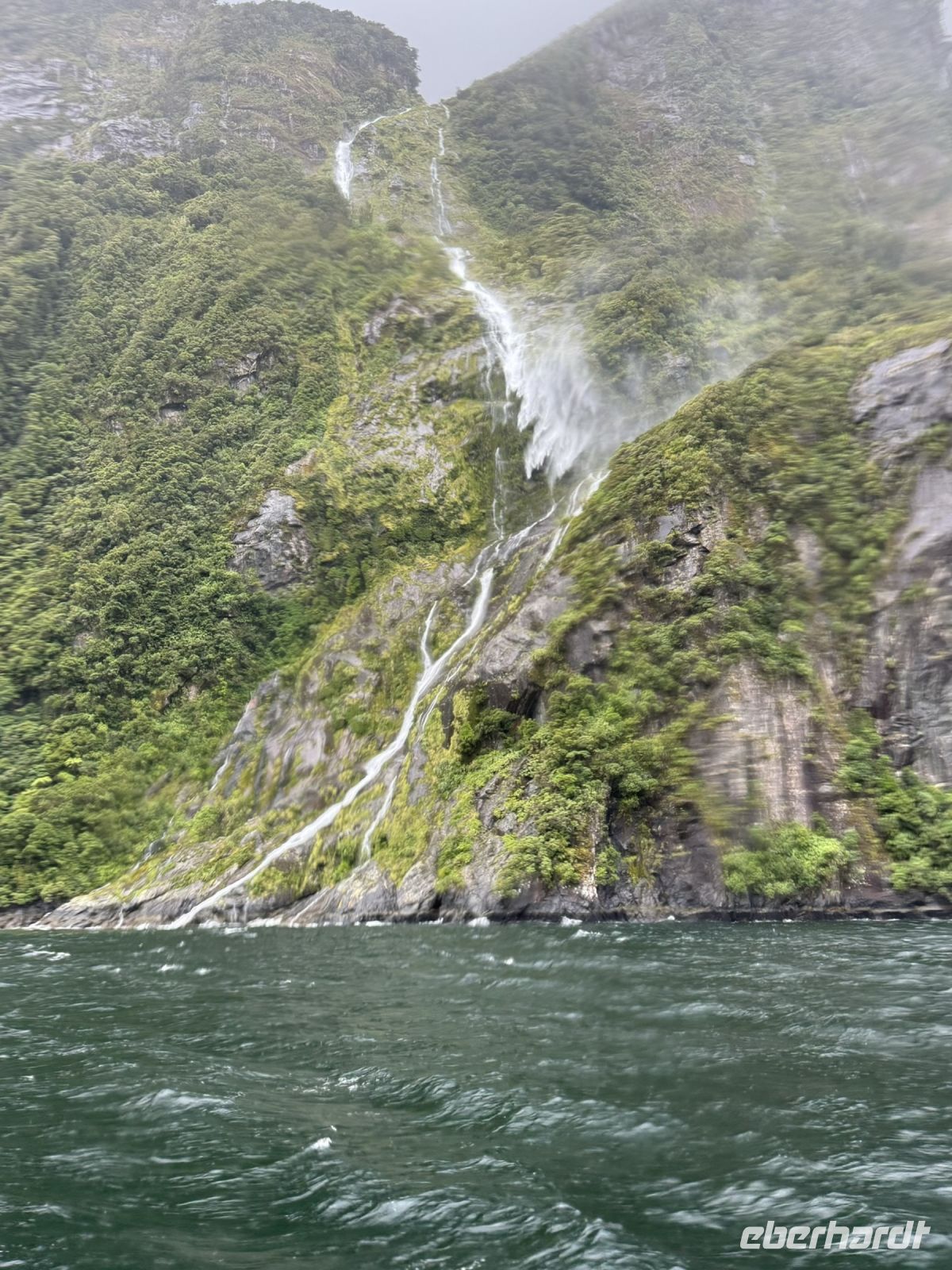 In der Nähe des Milford Sound entdeckten wir zahlreiche Wasserfälle. Normalerweise sind an sonnigen Tagen nur wenige zu sehen, aber bei Regen war es einfach unglaublich! Dieses Naturwunder gewinnt mit der Zeit an Kraft. Auf unserer Kreuzfahrt durch den Fjordland Nationalpark sahen wir spektakuläre Wasserfälle, von denen einige nicht ins Wasser stürzten, sondern vom Wind nach oben und zurück getragen wurden.