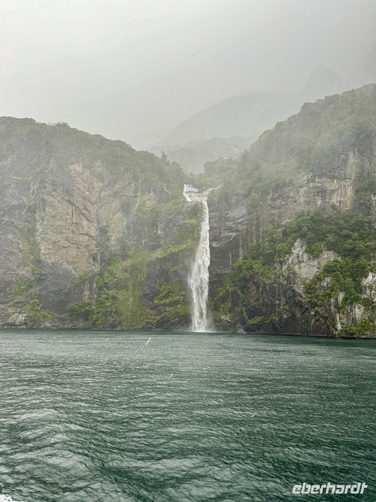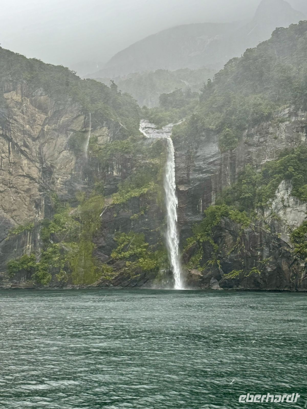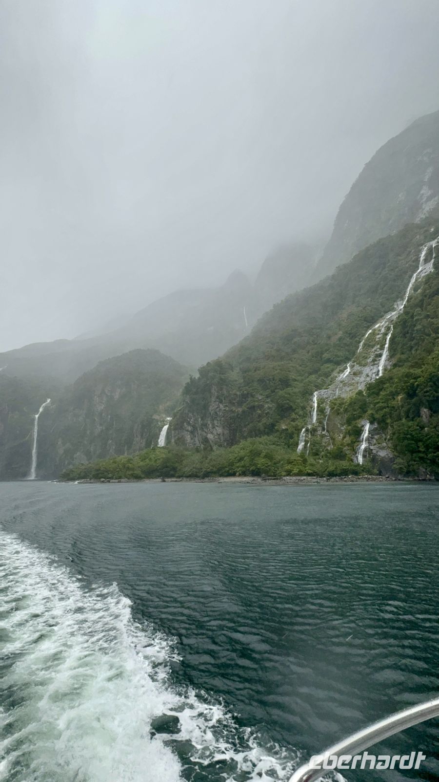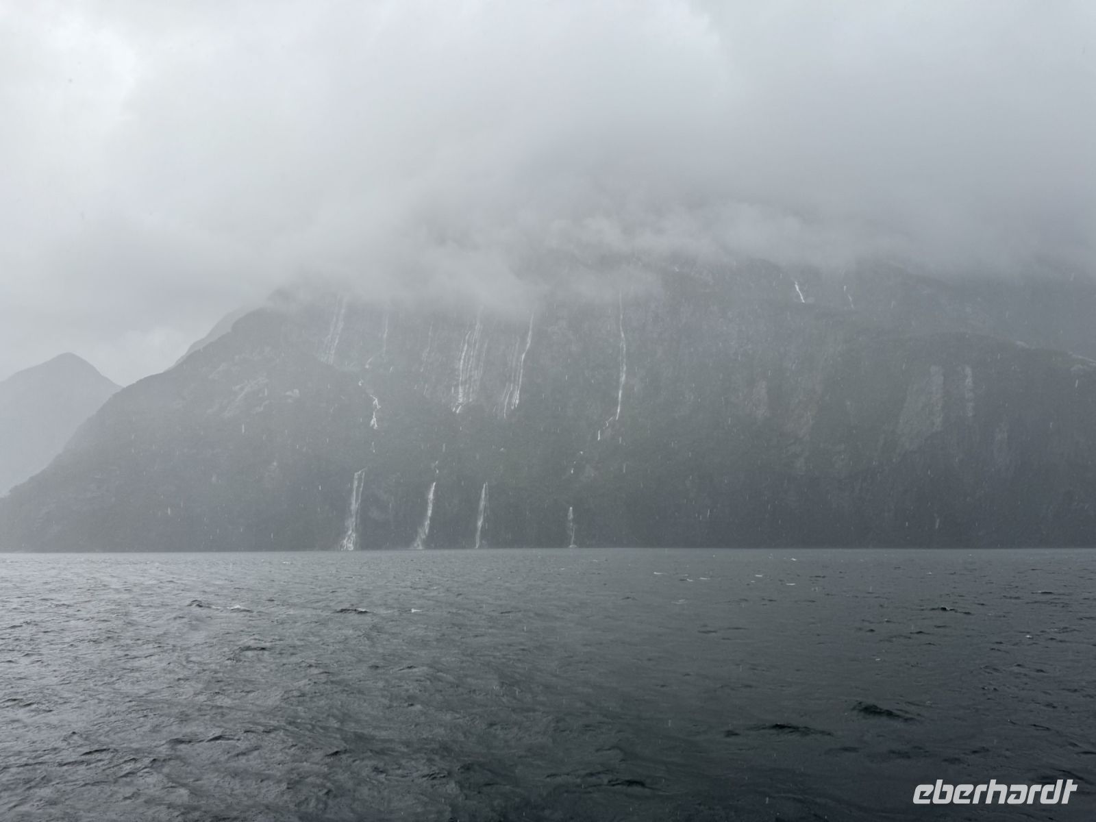 In der Nähe des Milford Sound entdeckten wir zahlreiche Wasserfälle. Normalerweise sind an sonnigen Tagen nur wenige zu sehen, aber bei Regen war es einfach unglaublich! Dieses Naturwunder gewinnt mit der Zeit an Kraft. Auf unserer Kreuzfahrt durch den Fjordland Nationalpark sahen wir spektakuläre Wasserfälle, von denen einige nicht ins Wasser stürzten, sondern vom Wind nach oben und zurück getragen wurden.