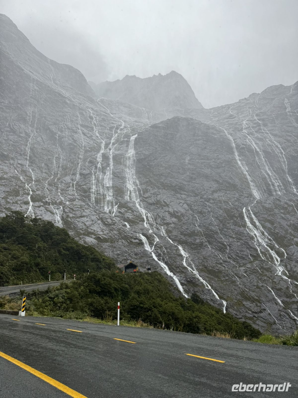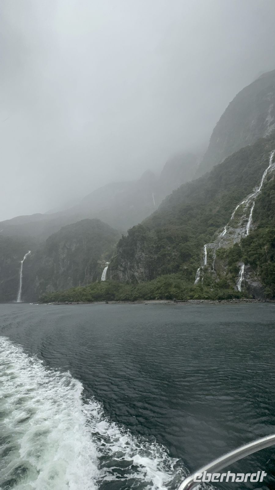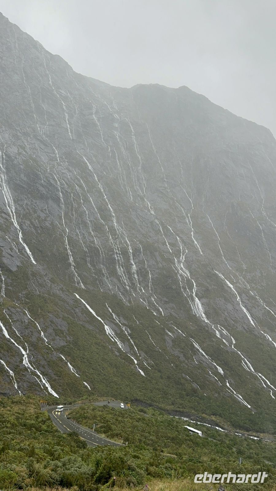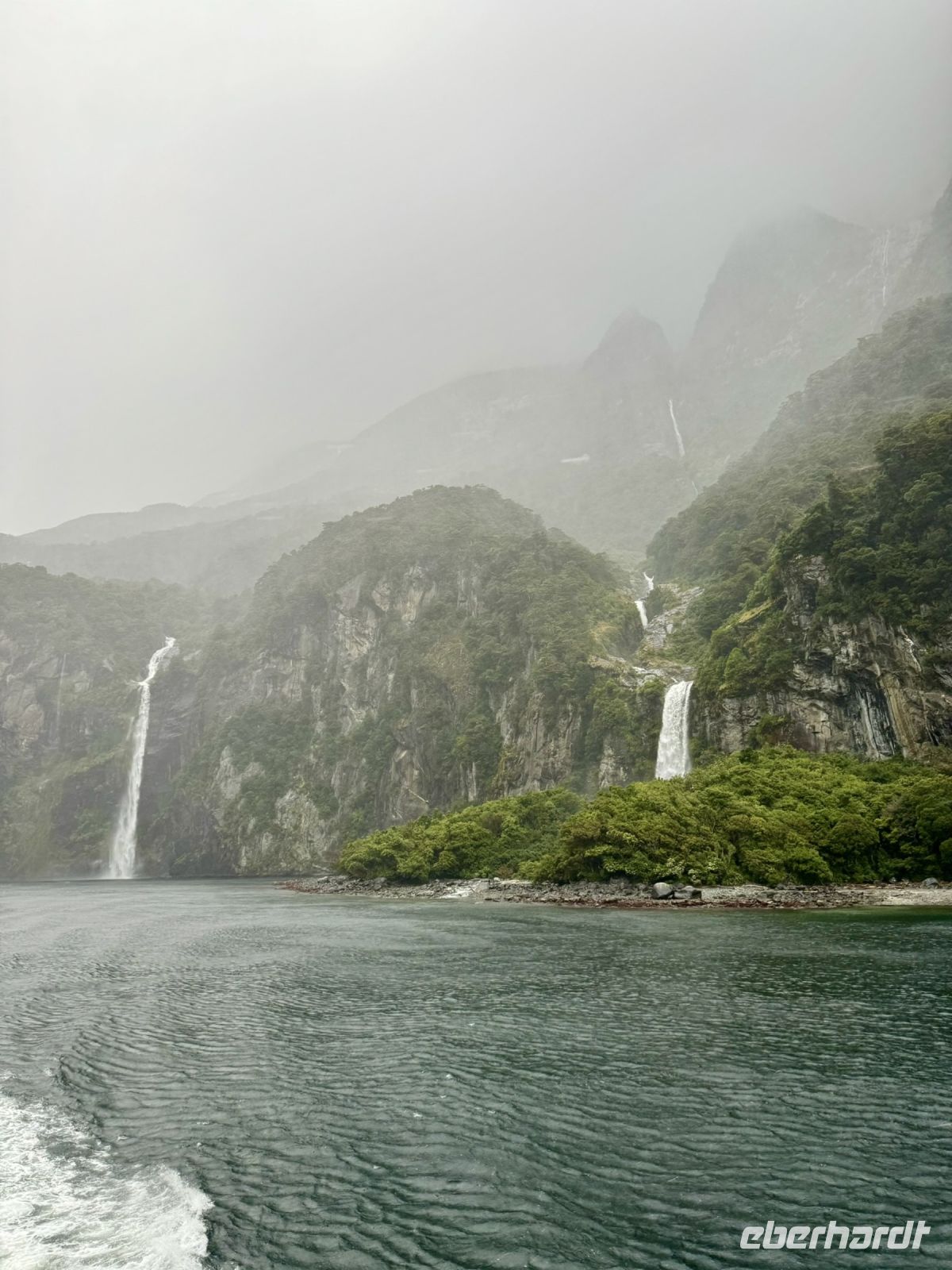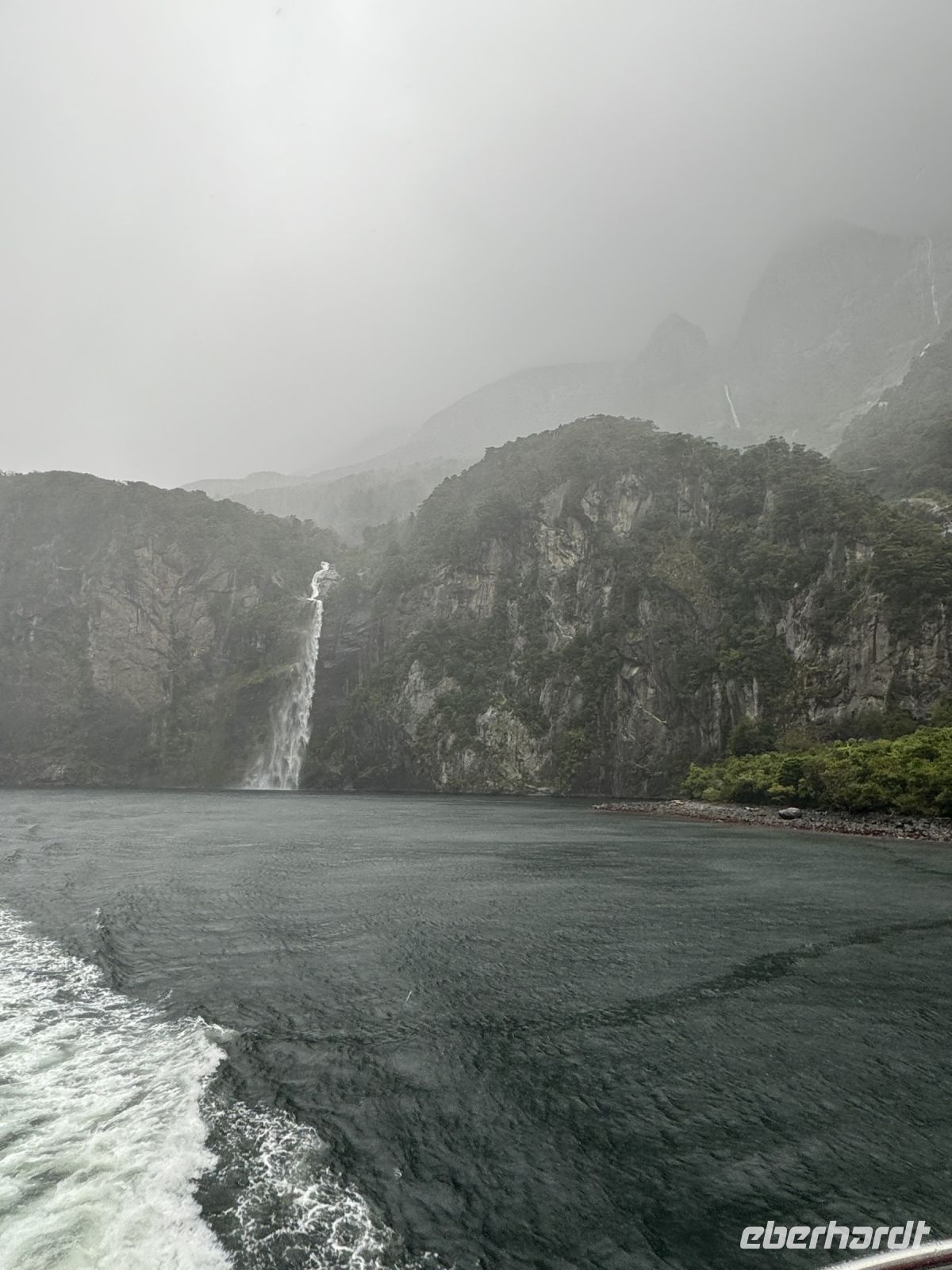 In der Nähe des Milford Sound entdeckten wir zahlreiche Wasserfälle. Normalerweise sind an sonnigen Tagen nur wenige zu sehen, aber bei Regen war es einfach unglaublich! Dieses Naturwunder gewinnt mit der Zeit an Kraft. Auf unserer Kreuzfahrt durch den Fjordland Nationalpark sahen wir spektakuläre Wasserfälle, von denen einige nicht ins Wasser stürzten, sondern vom Wind nach oben und zurück getragen wurden.