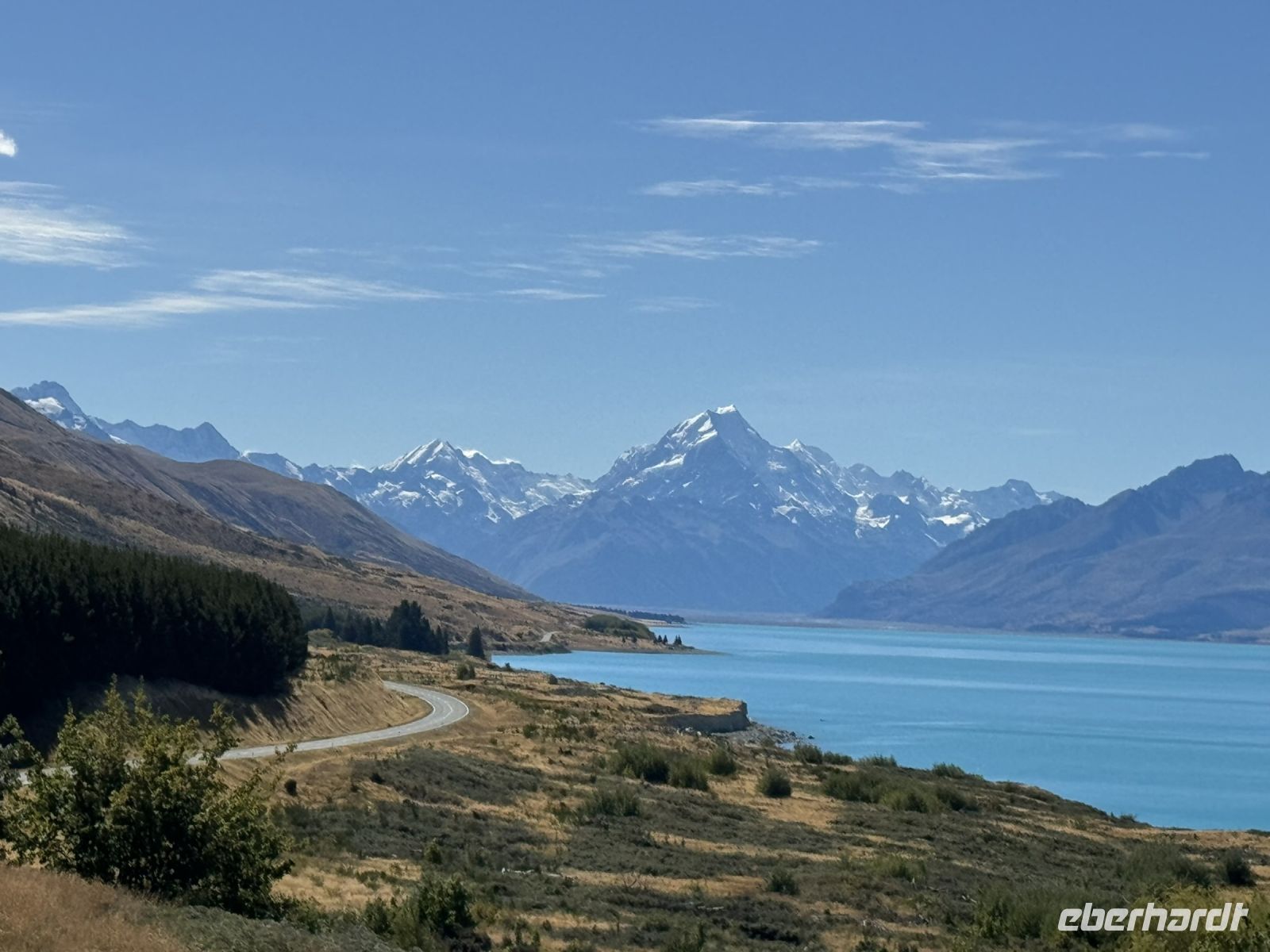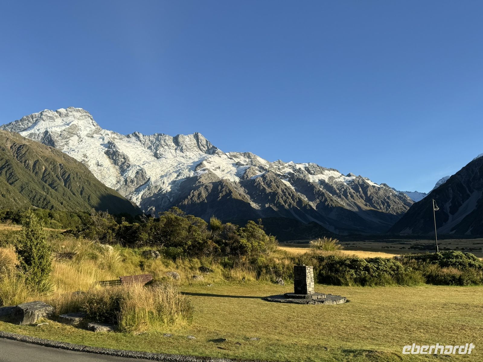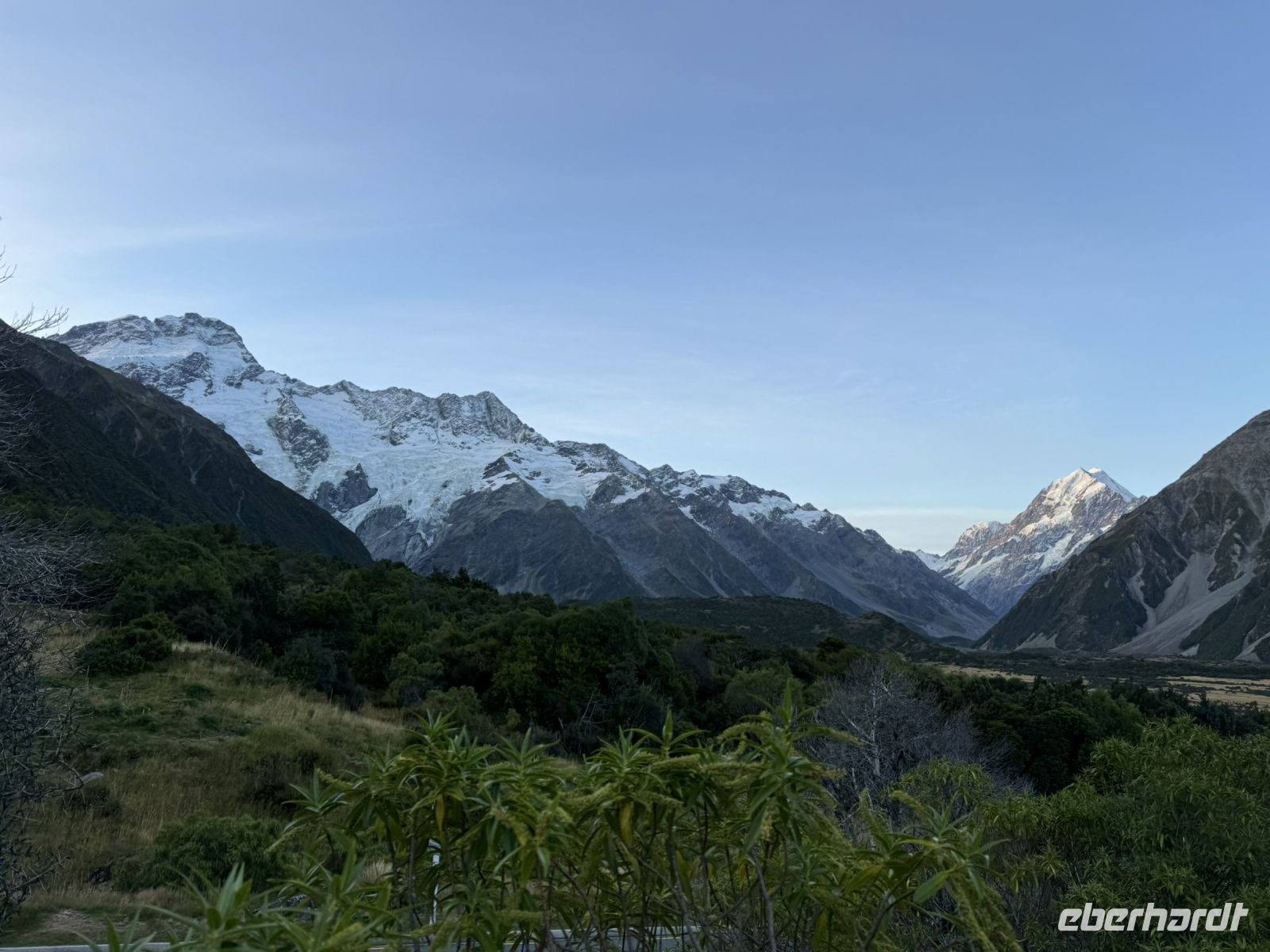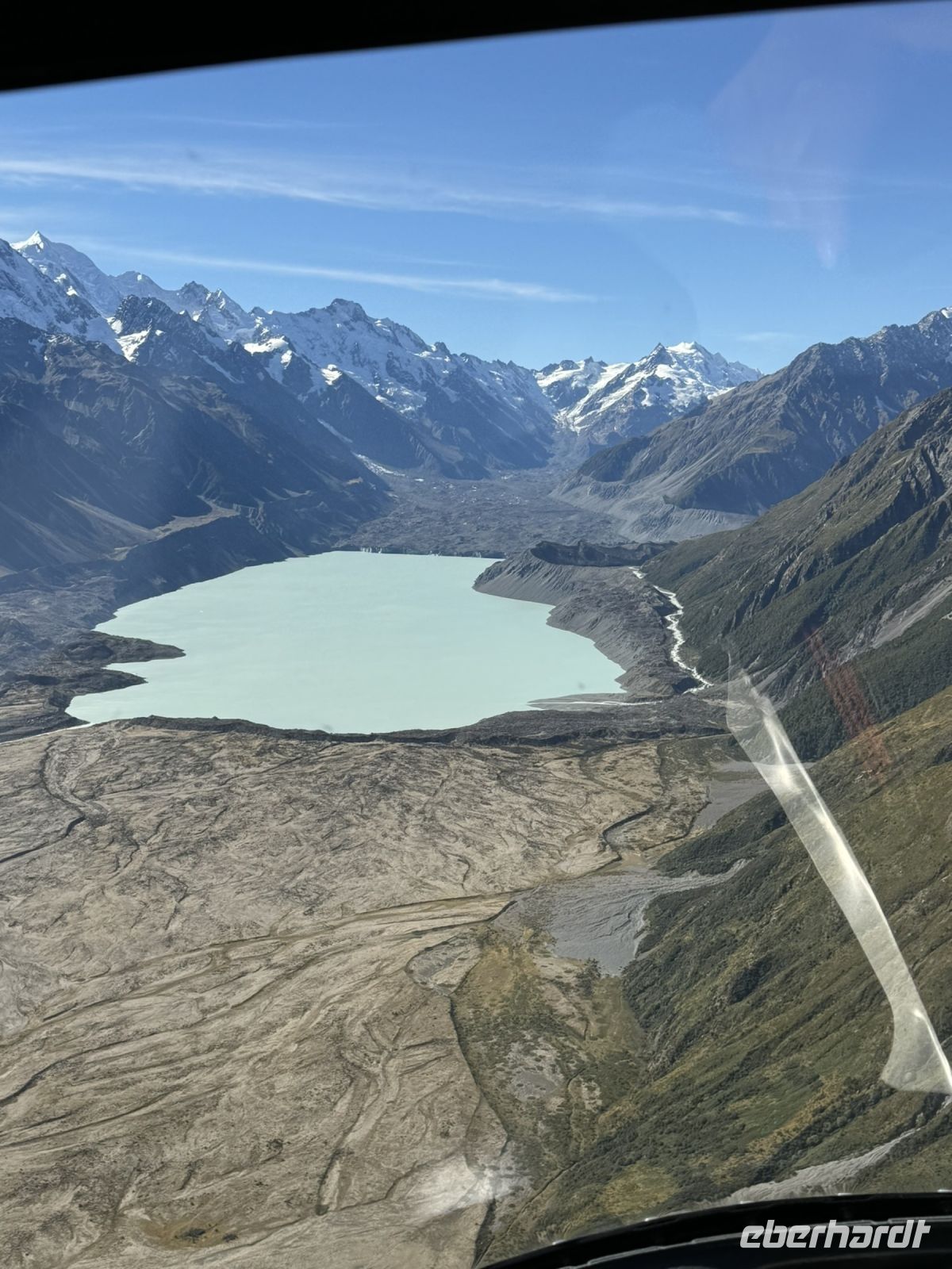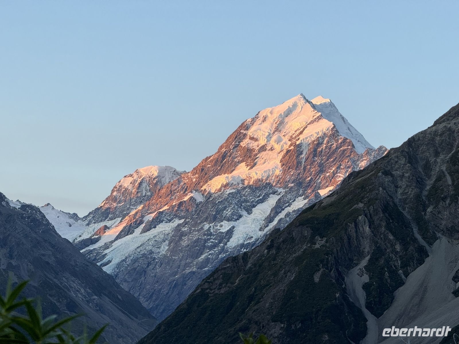 In Kurow machten wir Mittagspause und besuchten das Denkmal für Richie McCaw, die Rugby-Legende und Ikone der All Blacks. Nur wenige Schritte entfernt sahen wir den Lake Waitaki und das dazugehörige Wasserkraftwerk. Anschließend erreichten wir den Lake Pukaki im Nationalpark, von dem aus wir bei traumhaftem Wetter einen spektakulären Blick auf den Mount Cook genießen konnten. Hier standen uns zwei verschiedene Optionen offen: Entweder eine kleine Wanderung entlang des Tasman-River oder ein Helikopterflug, bei dem wir den Fluss, den Lake Pukaki, die Moränen und die majestätische Schönheit des Mount Cook aus der Luft betrachten konnten. Ein besonderes Erlebnis für alle! Wir genossen das atemberaubende Panorama von unseren Zimmern aus sowohl am Nachmittag als auch während des Abendessens, begleitet von einem reichhaltigen Buffet. Die Romantiker unter uns verweilten bis zum Sonnenuntergang, um den rot gefärbten Berg zu bewundern, und genossen später in der Dunkelheit den Anblick des Kreuzes des Südens und der Milchstraße.