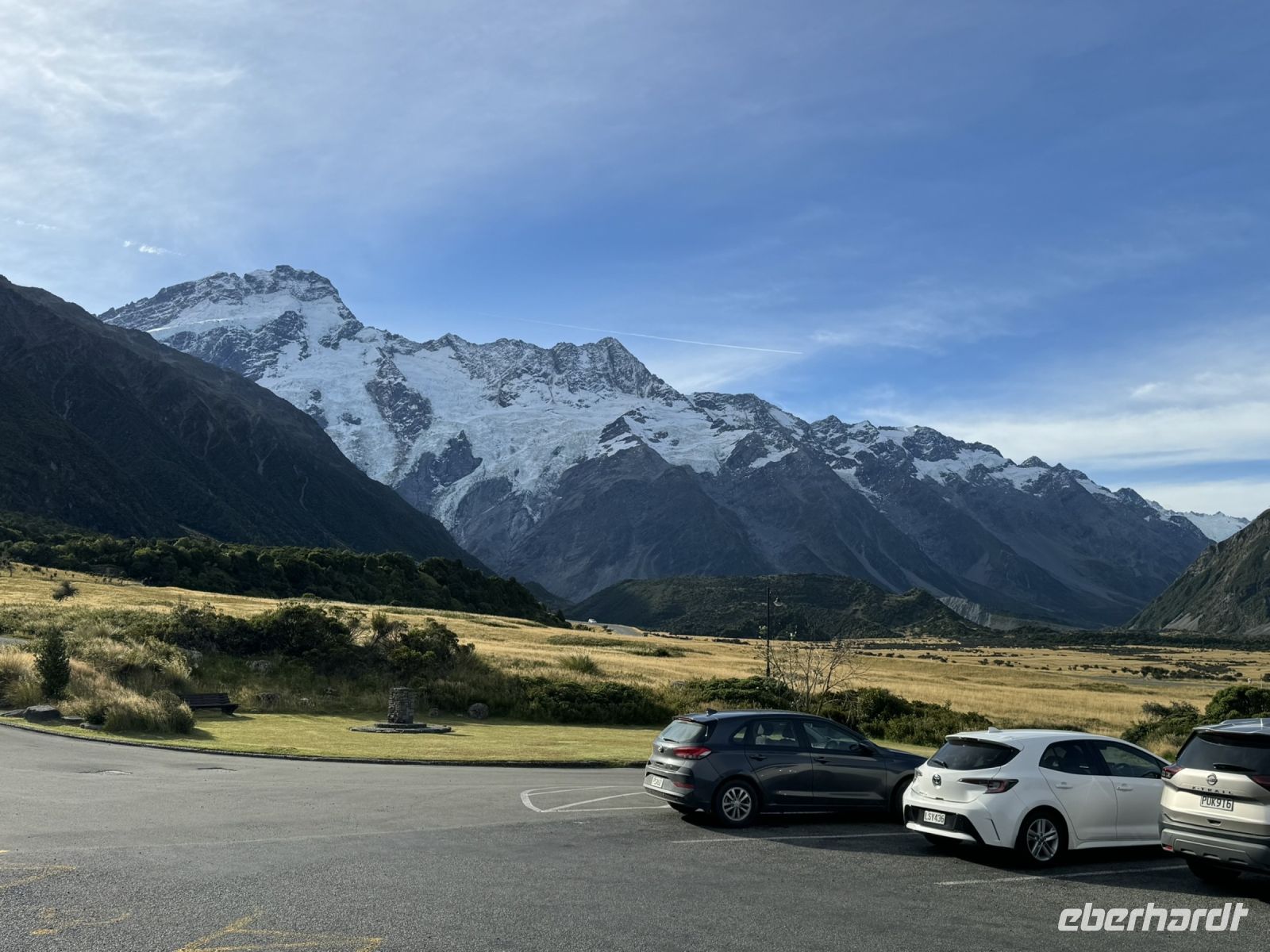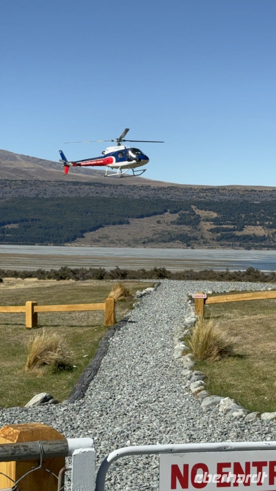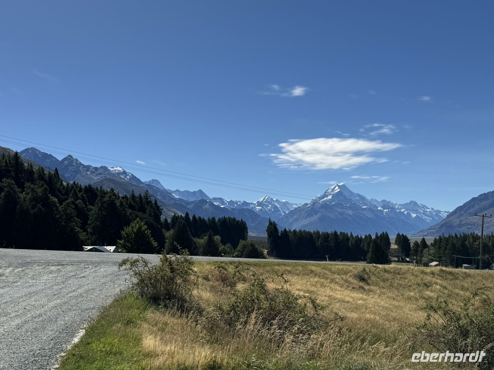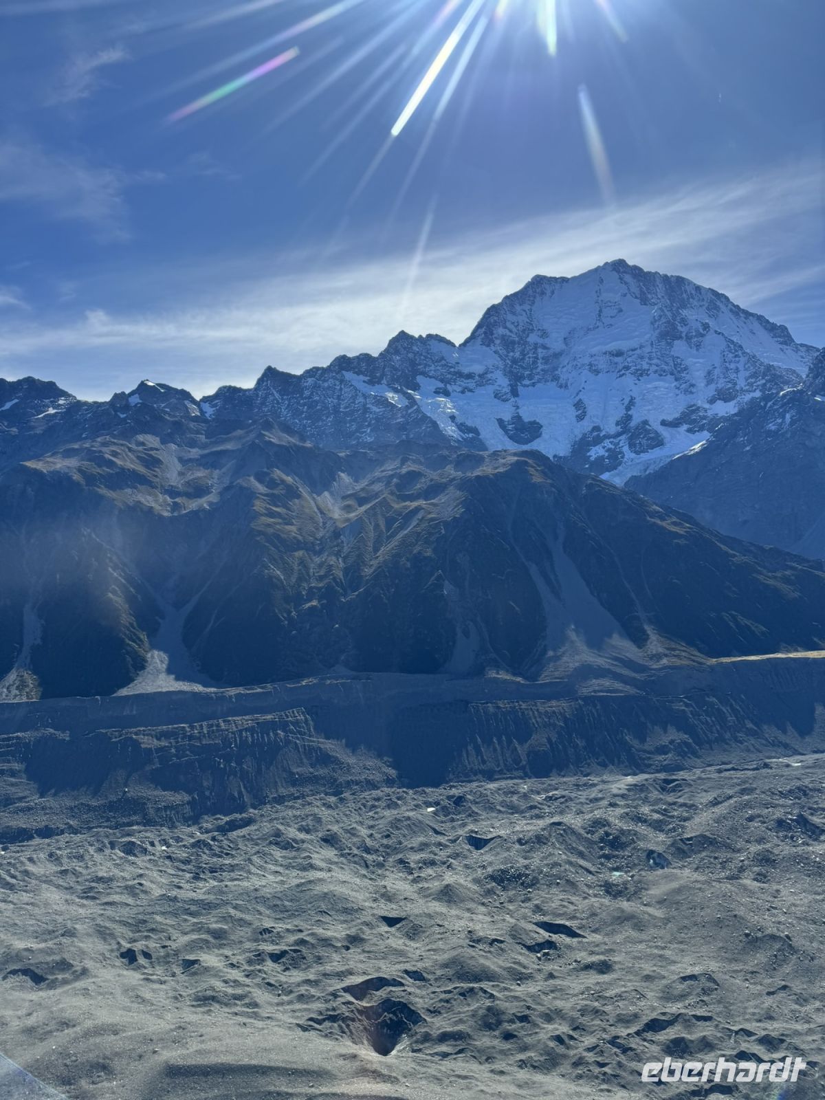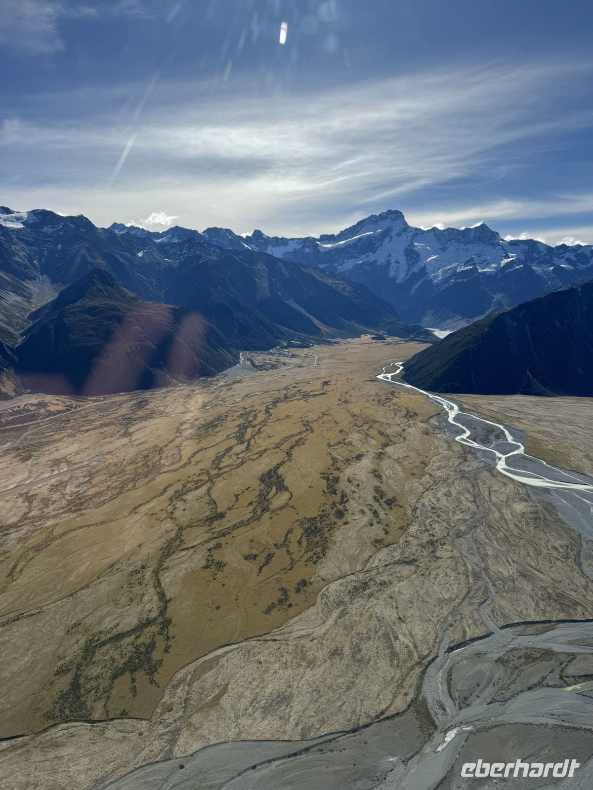 In Kurow machten wir Mittagspause und besuchten das Denkmal für Richie McCaw, die Rugby-Legende und Ikone der All Blacks. Nur wenige Schritte entfernt sahen wir den Lake Waitaki und das dazugehörige Wasserkraftwerk. Anschließend erreichten wir den Lake Pukaki im Nationalpark, von dem aus wir bei traumhaftem Wetter einen spektakulären Blick auf den Mount Cook genießen konnten. Hier standen uns zwei verschiedene Optionen offen: Entweder eine kleine Wanderung entlang des Tasman-River oder ein Helikopterflug, bei dem wir den Fluss, den Lake Pukaki, die Moränen und die majestätische Schönheit des Mount Cook aus der Luft betrachten konnten. Ein besonderes Erlebnis für alle! Wir genossen das atemberaubende Panorama von unseren Zimmern aus sowohl am Nachmittag als auch während des Abendessens, begleitet von einem reichhaltigen Buffet. Die Romantiker unter uns verweilten bis zum Sonnenuntergang, um den rot gefärbten Berg zu bewundern, und genossen später in der Dunkelheit den Anblick des Kreuzes des Südens und der Milchstraße.