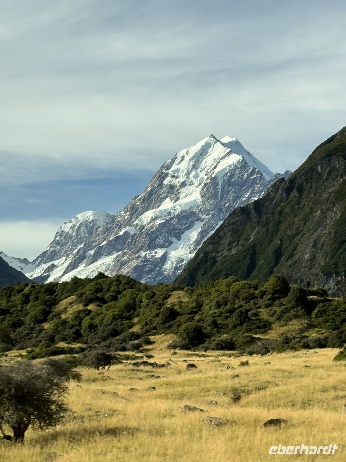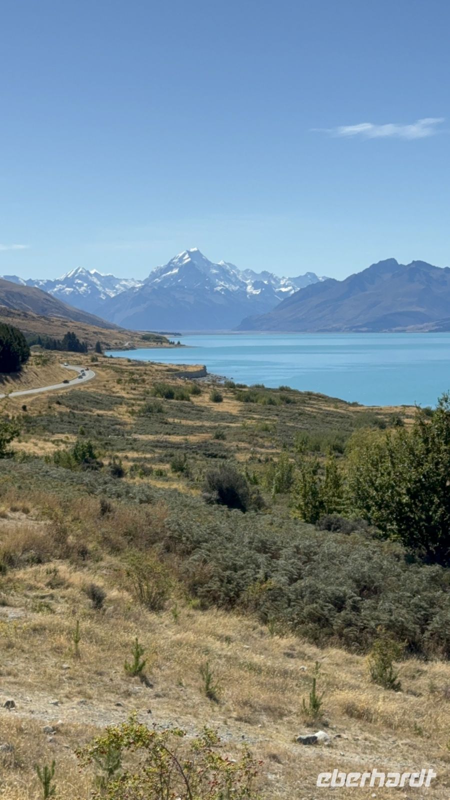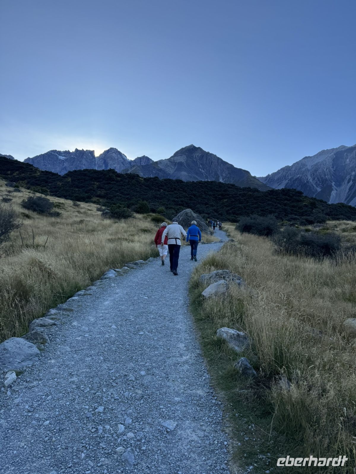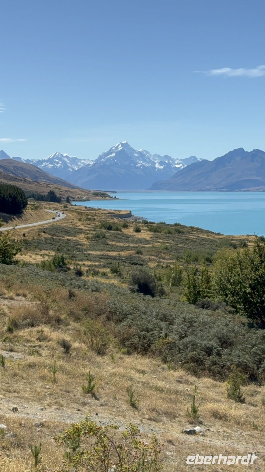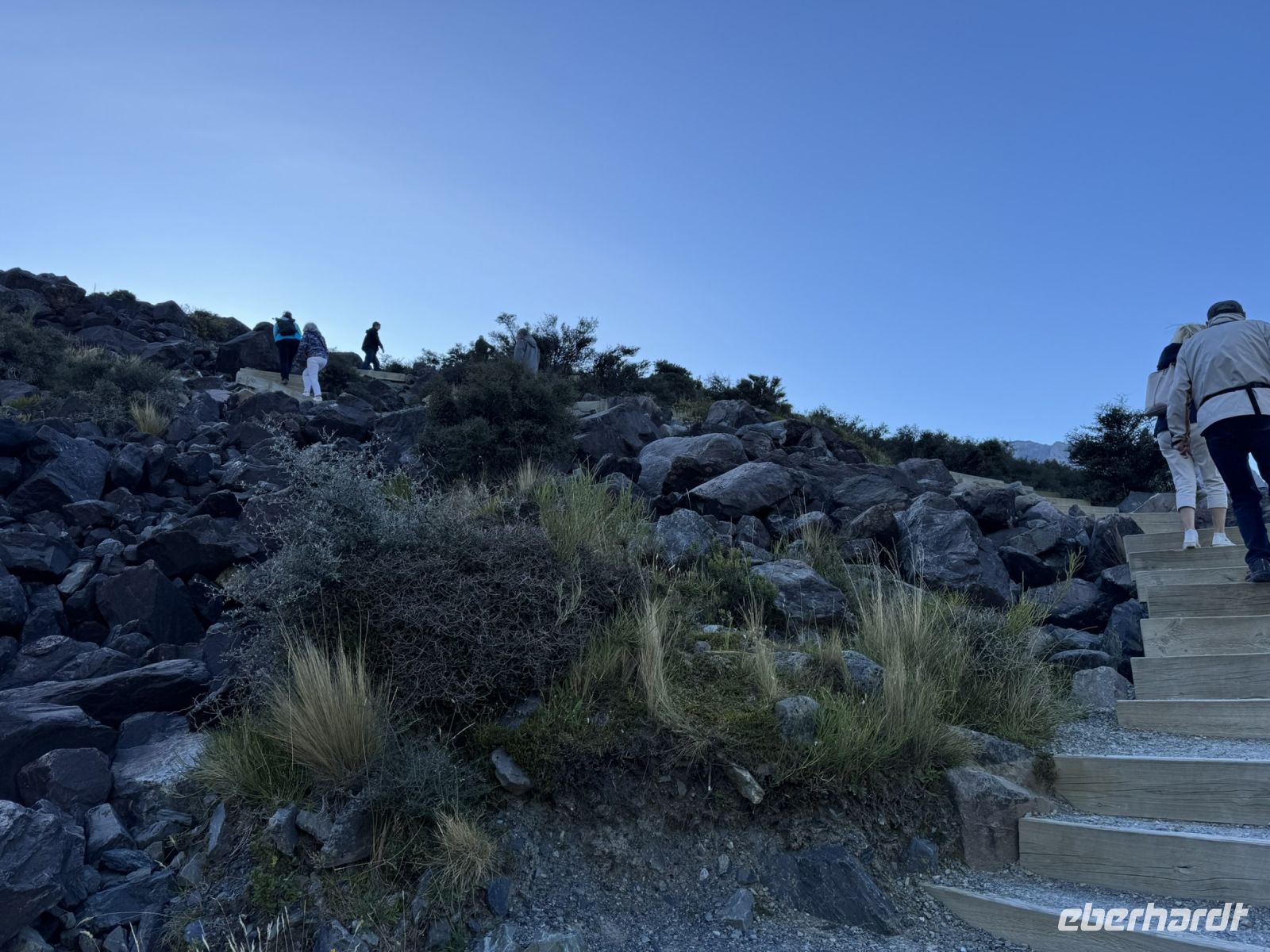 In Kurow machten wir Mittagspause und besuchten das Denkmal für Richie McCaw, die Rugby-Legende und Ikone der All Blacks. Nur wenige Schritte entfernt sahen wir den Lake Waitaki und das dazugehörige Wasserkraftwerk. Anschließend erreichten wir den Lake Pukaki im Nationalpark, von dem aus wir bei traumhaftem Wetter einen spektakulären Blick auf den Mount Cook genießen konnten. Hier standen uns zwei verschiedene Optionen offen: Entweder eine kleine Wanderung entlang des Tasman-River oder ein Helikopterflug, bei dem wir den Fluss, den Lake Pukaki, die Moränen und die majestätische Schönheit des Mount Cook aus der Luft betrachten konnten. Ein besonderes Erlebnis für alle! Wir genossen das atemberaubende Panorama von unseren Zimmern aus sowohl am Nachmittag als auch während des Abendessens, begleitet von einem reichhaltigen Buffet. Die Romantiker unter uns verweilten bis zum Sonnenuntergang, um den rot gefärbten Berg zu bewundern, und genossen später in der Dunkelheit den Anblick des Kreuzes des Südens und der Milchstraße.