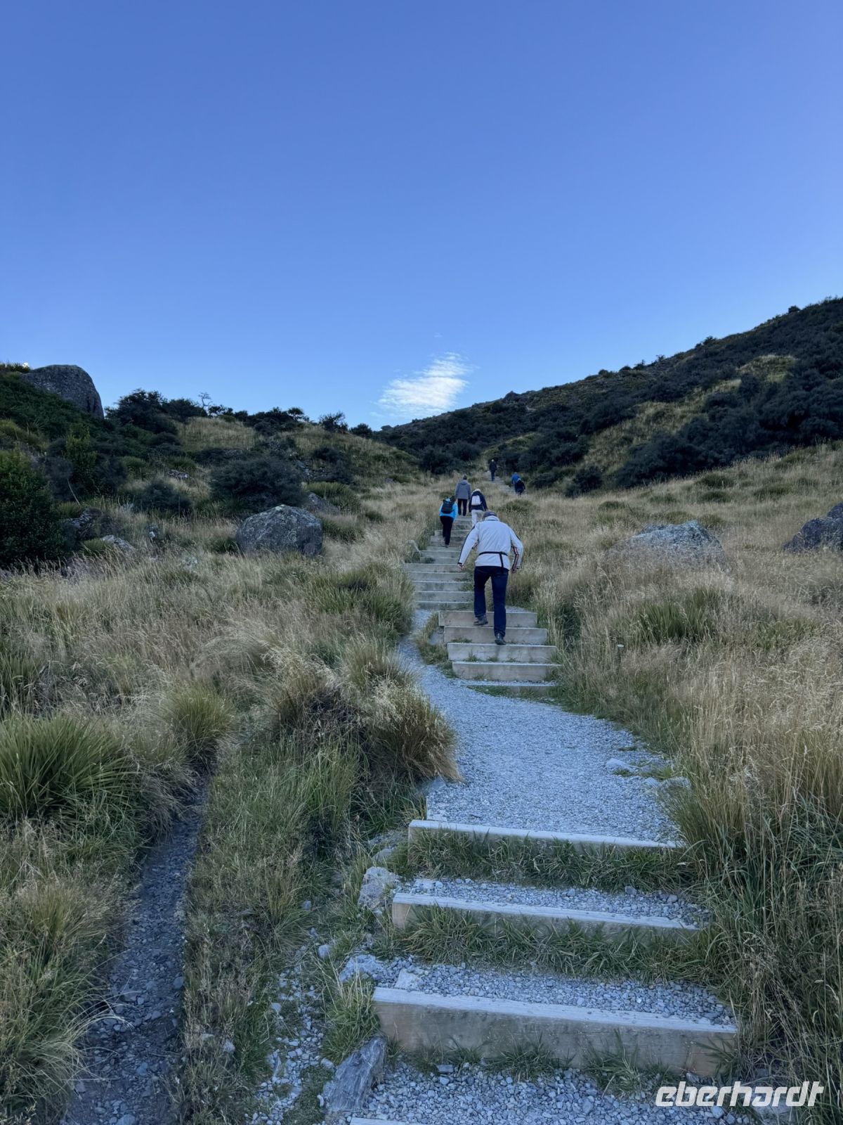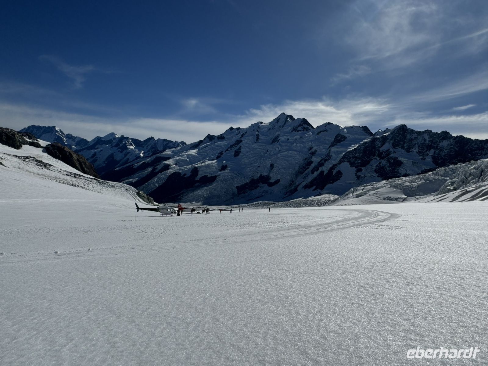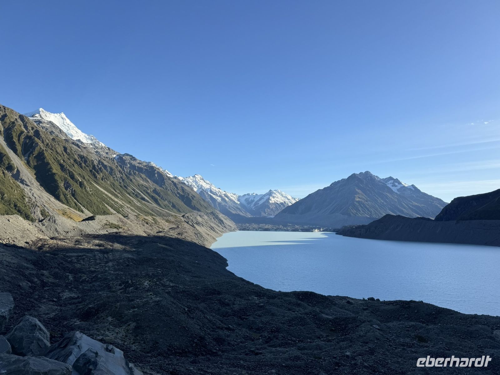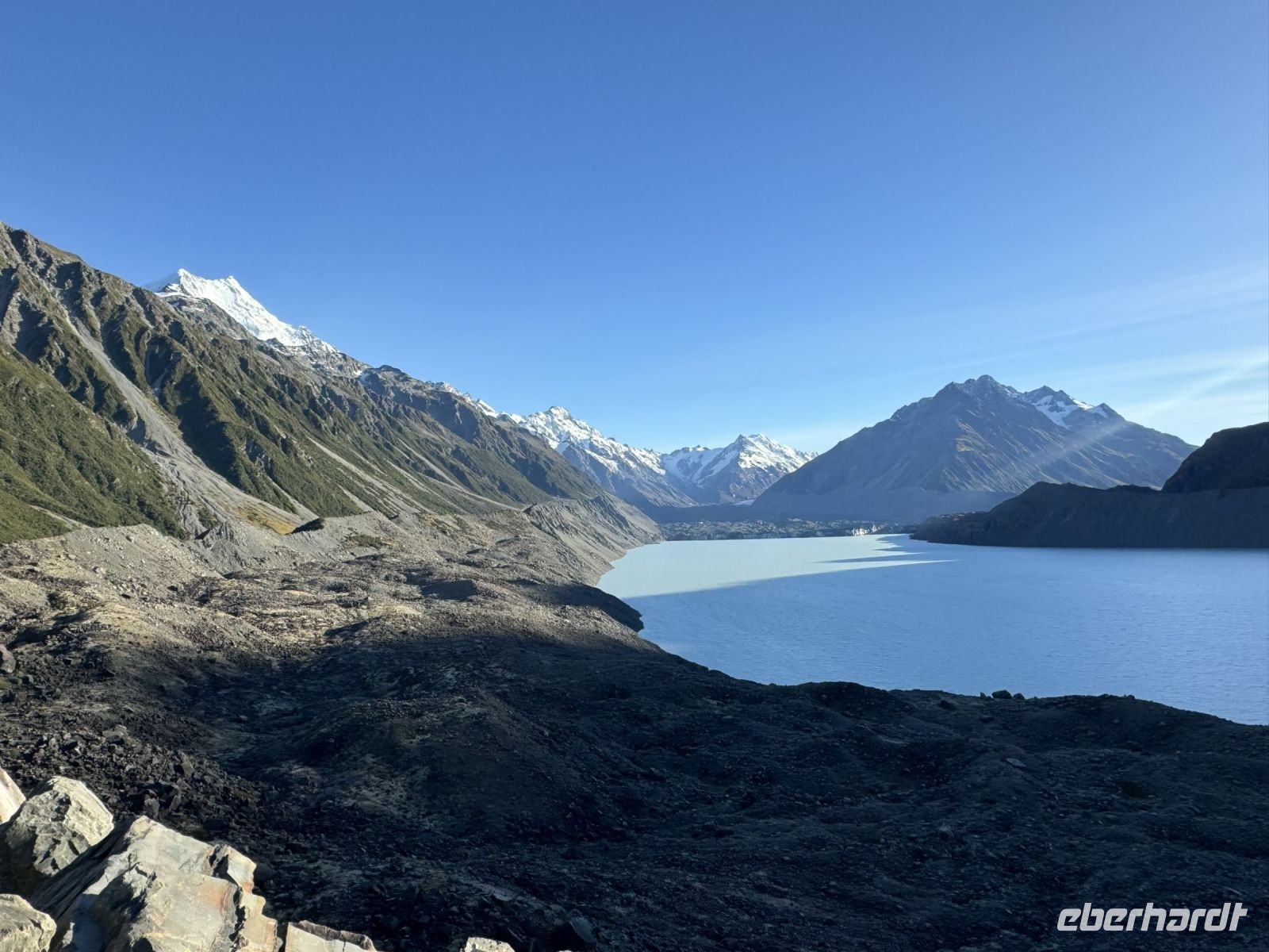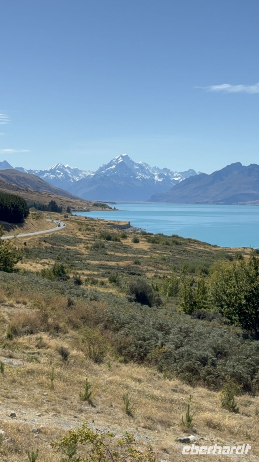 In Kurow machten wir Mittagspause und besuchten das Denkmal für Richie McCaw, die Rugby-Legende und Ikone der All Blacks. Nur wenige Schritte entfernt sahen wir den Lake Waitaki und das dazugehörige Wasserkraftwerk. Anschließend erreichten wir den Lake Pukaki im Nationalpark, von dem aus wir bei traumhaftem Wetter einen spektakulären Blick auf den Mount Cook genießen konnten. Hier standen uns zwei verschiedene Optionen offen: Entweder eine kleine Wanderung entlang des Tasman-River oder ein Helikopterflug, bei dem wir den Fluss, den Lake Pukaki, die Moränen und die majestätische Schönheit des Mount Cook aus der Luft betrachten konnten. Ein besonderes Erlebnis für alle! Wir genossen das atemberaubende Panorama von unseren Zimmern aus sowohl am Nachmittag als auch während des Abendessens, begleitet von einem reichhaltigen Buffet. Die Romantiker unter uns verweilten bis zum Sonnenuntergang, um den rot gefärbten Berg zu bewundern, und genossen später in der Dunkelheit den Anblick des Kreuzes des Südens und der Milchstraße.