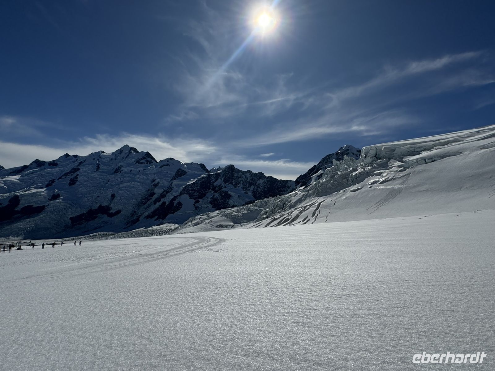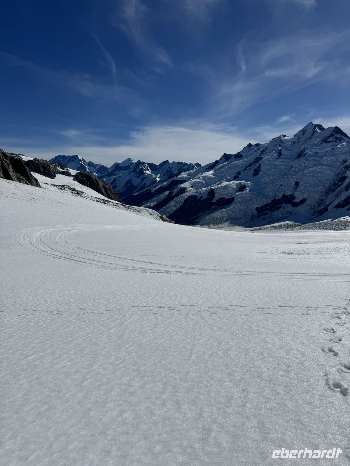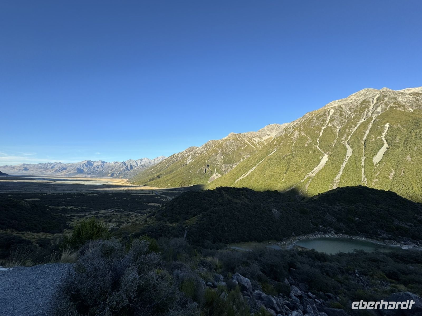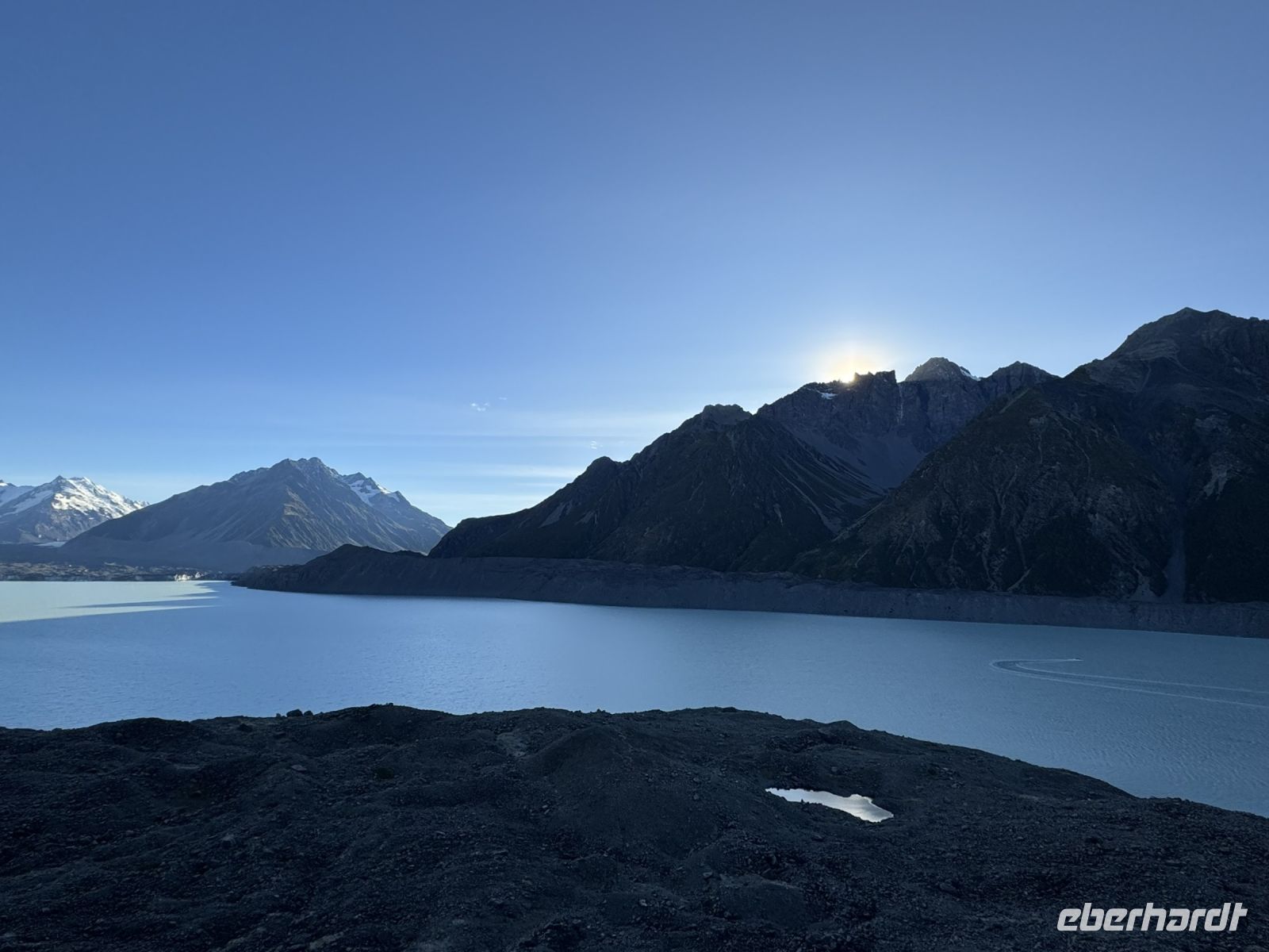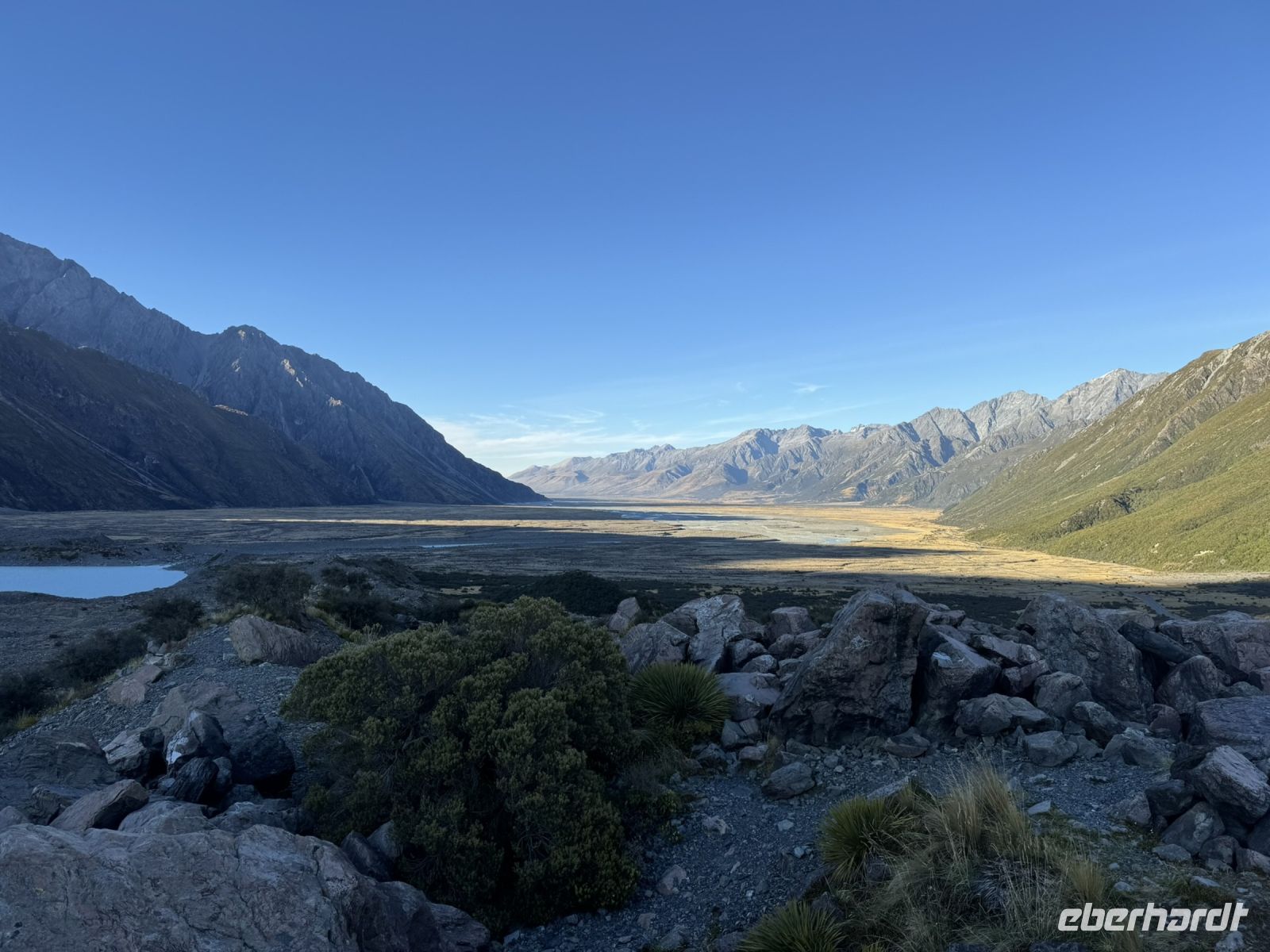 In Kurow machten wir Mittagspause und besuchten das Denkmal für Richie McCaw, die Rugby-Legende und Ikone der All Blacks. Nur wenige Schritte entfernt sahen wir den Lake Waitaki und das dazugehörige Wasserkraftwerk. Anschließend erreichten wir den Lake Pukaki im Nationalpark, von dem aus wir bei traumhaftem Wetter einen spektakulären Blick auf den Mount Cook genießen konnten. Hier standen uns zwei verschiedene Optionen offen: Entweder eine kleine Wanderung entlang des Tasman-River oder ein Helikopterflug, bei dem wir den Fluss, den Lake Pukaki, die Moränen und die majestätische Schönheit des Mount Cook aus der Luft betrachten konnten. Ein besonderes Erlebnis für alle! Wir genossen das atemberaubende Panorama von unseren Zimmern aus sowohl am Nachmittag als auch während des Abendessens, begleitet von einem reichhaltigen Buffet. Die Romantiker unter uns verweilten bis zum Sonnenuntergang, um den rot gefärbten Berg zu bewundern, und genossen später in der Dunkelheit den Anblick des Kreuzes des Südens und der Milchstraße.