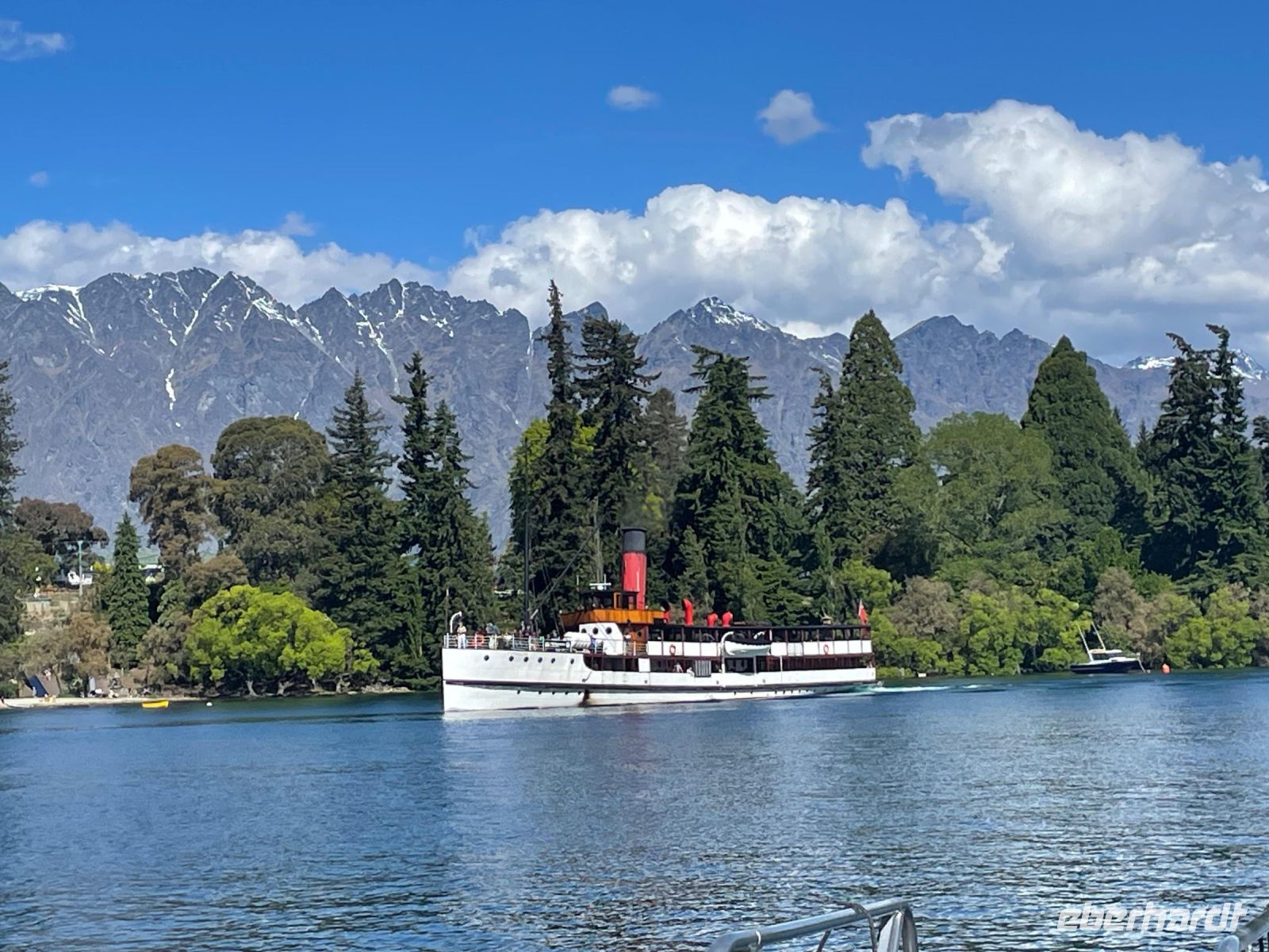 Gegen 16:30 Uhr fuhren wir an die Anlegestelle der TSS Earnslaw - seit 1912 existiert das besondere Dampfschiff Queenstown‘s. An Board bestand die Möglichkeit, den Maschinenraum zu besichtigen oder die schöne Aussicht entlang des Lake Wakatipu auszunutzen. Nach 40 Minuten erreichten wir Walter Peak - dort genossen wir ein köstliches Buffet und durften an einer Farmshow teilnehmen.