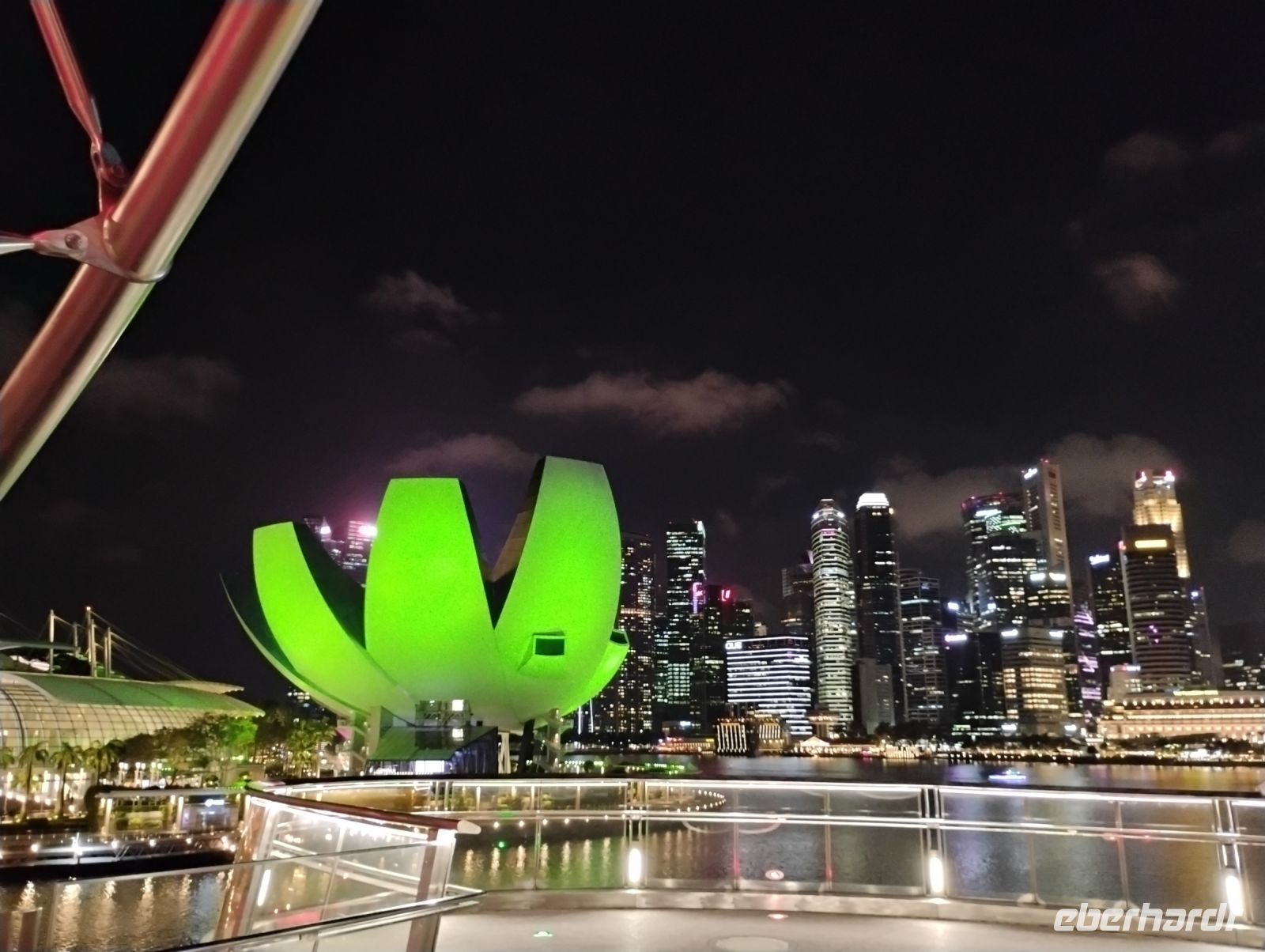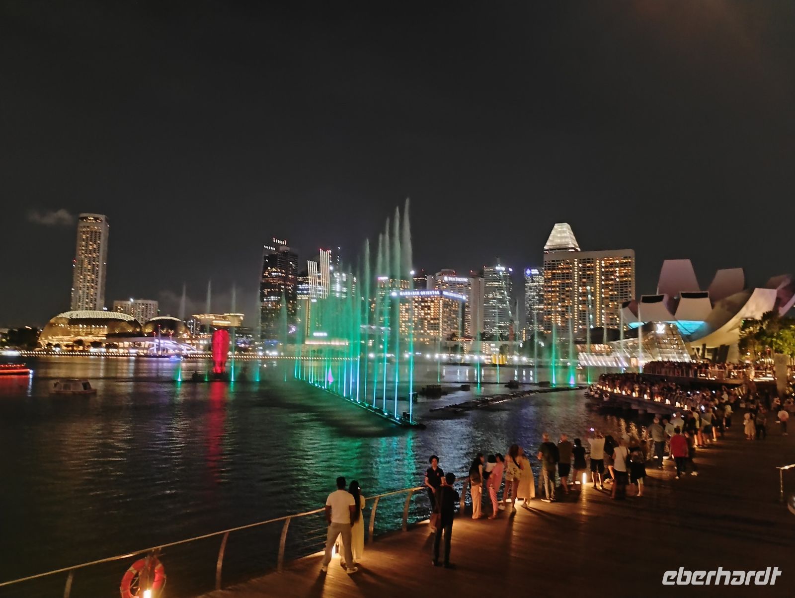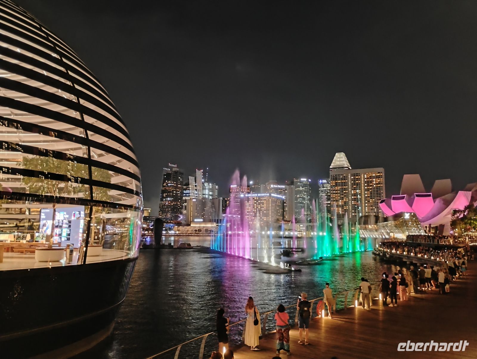 In der Hotellobby trafen wir uns wieder und starteten bei angenehm warmen Temperaturen zu einem Spaziergang durch die abendliche Stadt. Vom Regen war längst nichts mehr zu spüren, und unter klarem Himmel führte unser Weg – begleitet vom fast vollen Mond und der beeindruckenden Skyline – zunächst am prachtvollen Fullerton Hotel vorbei zur spektakulären Wasser- und Lichtshow Spectra.