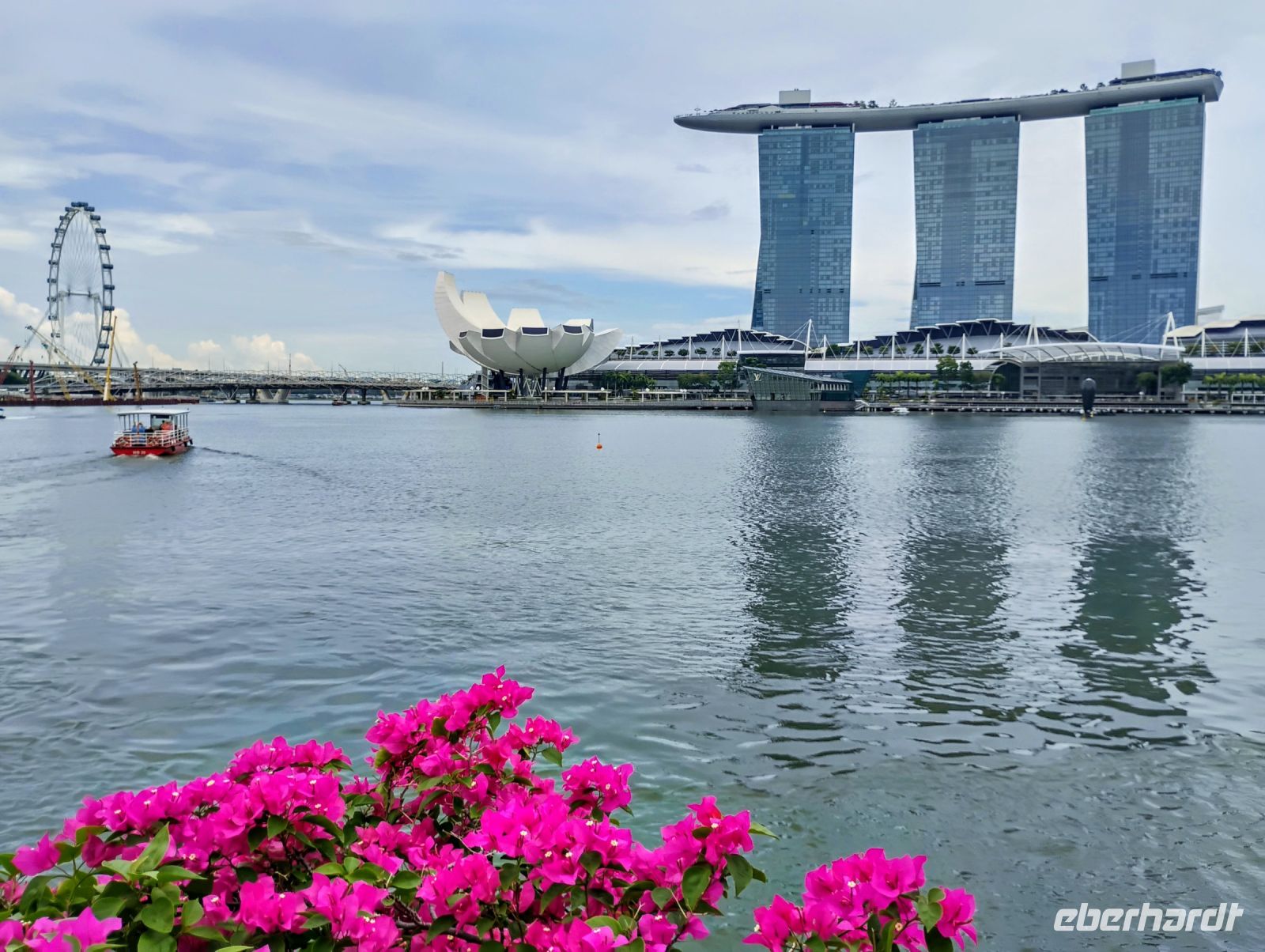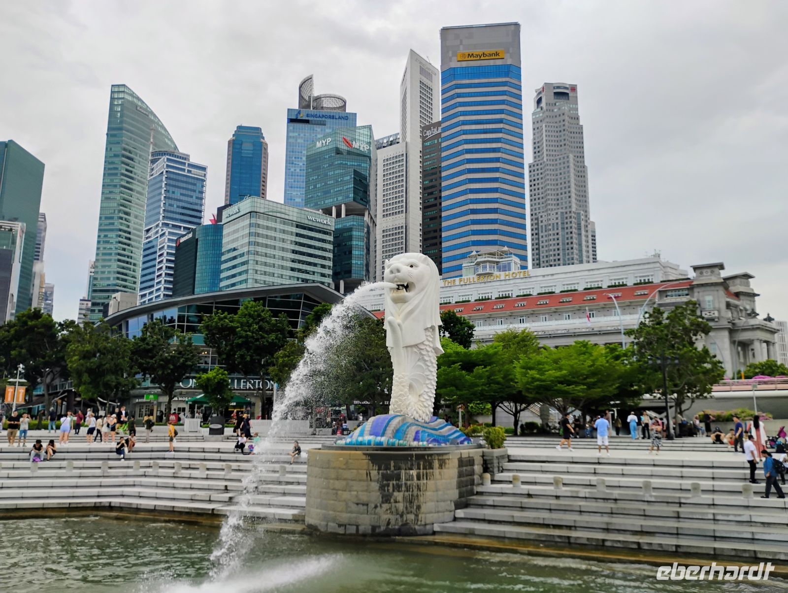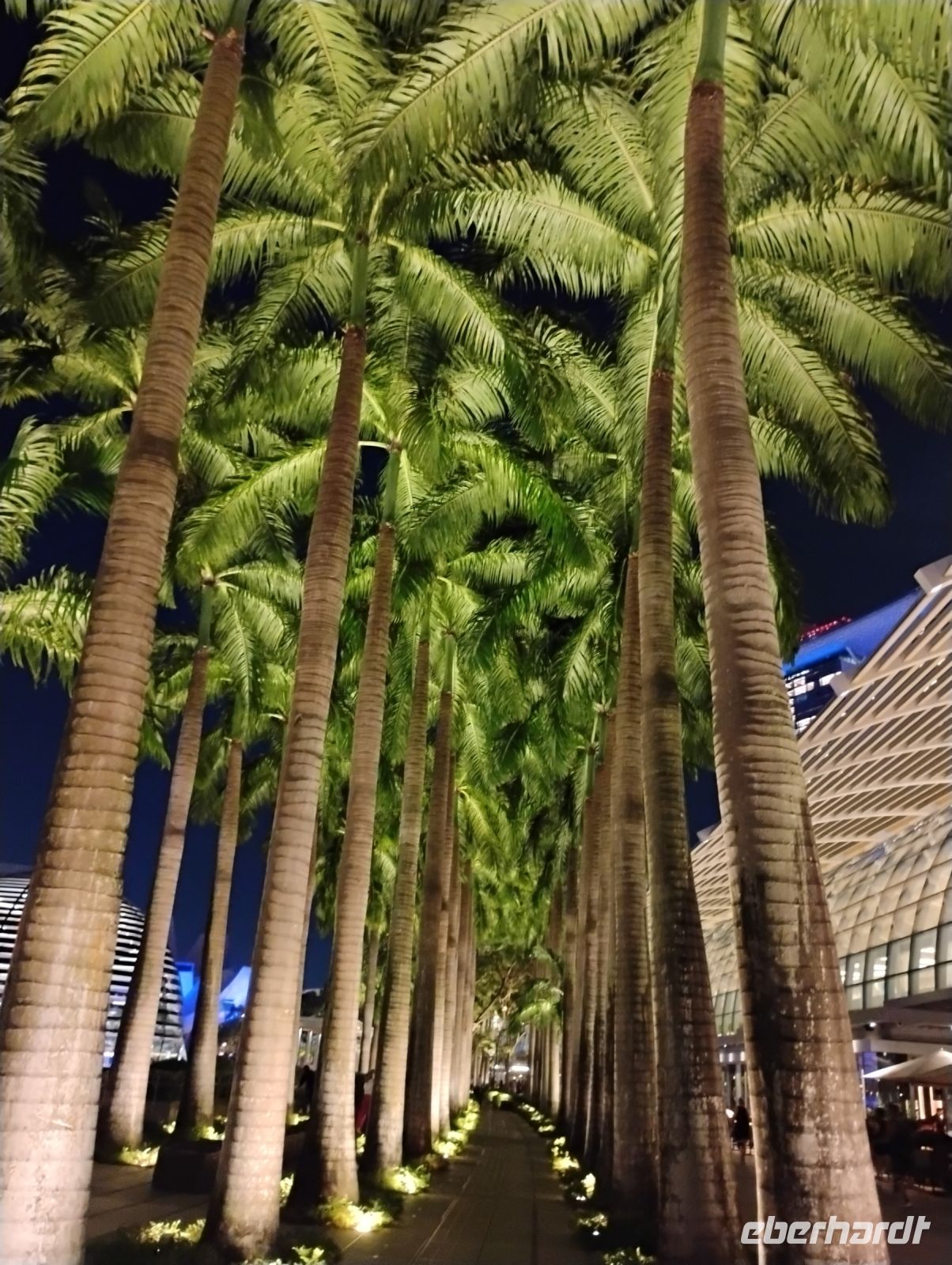In der Hotellobby trafen wir uns wieder und starteten bei angenehm warmen Temperaturen zu einem Spaziergang durch die abendliche Stadt. Vom Regen war längst nichts mehr zu spüren, und unter klarem Himmel führte unser Weg – begleitet vom fast vollen Mond und der beeindruckenden Skyline – zunächst am prachtvollen Fullerton Hotel vorbei zur spektakulären Wasser- und Lichtshow Spectra.