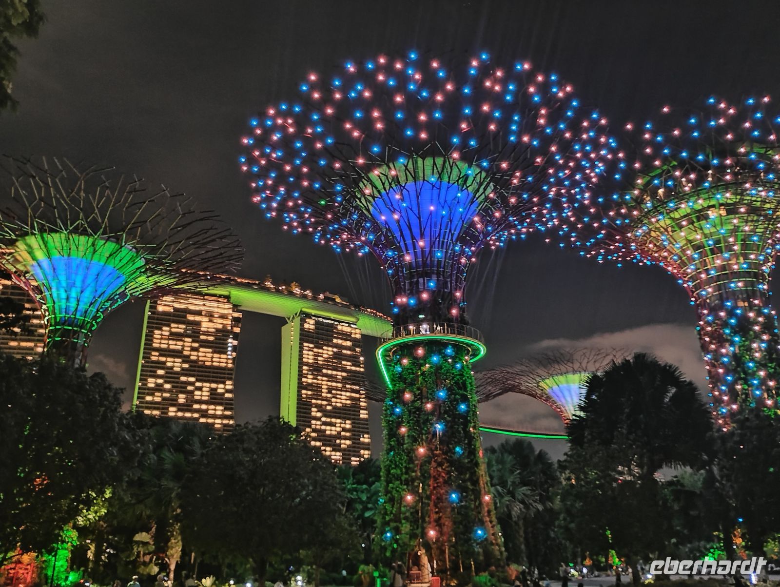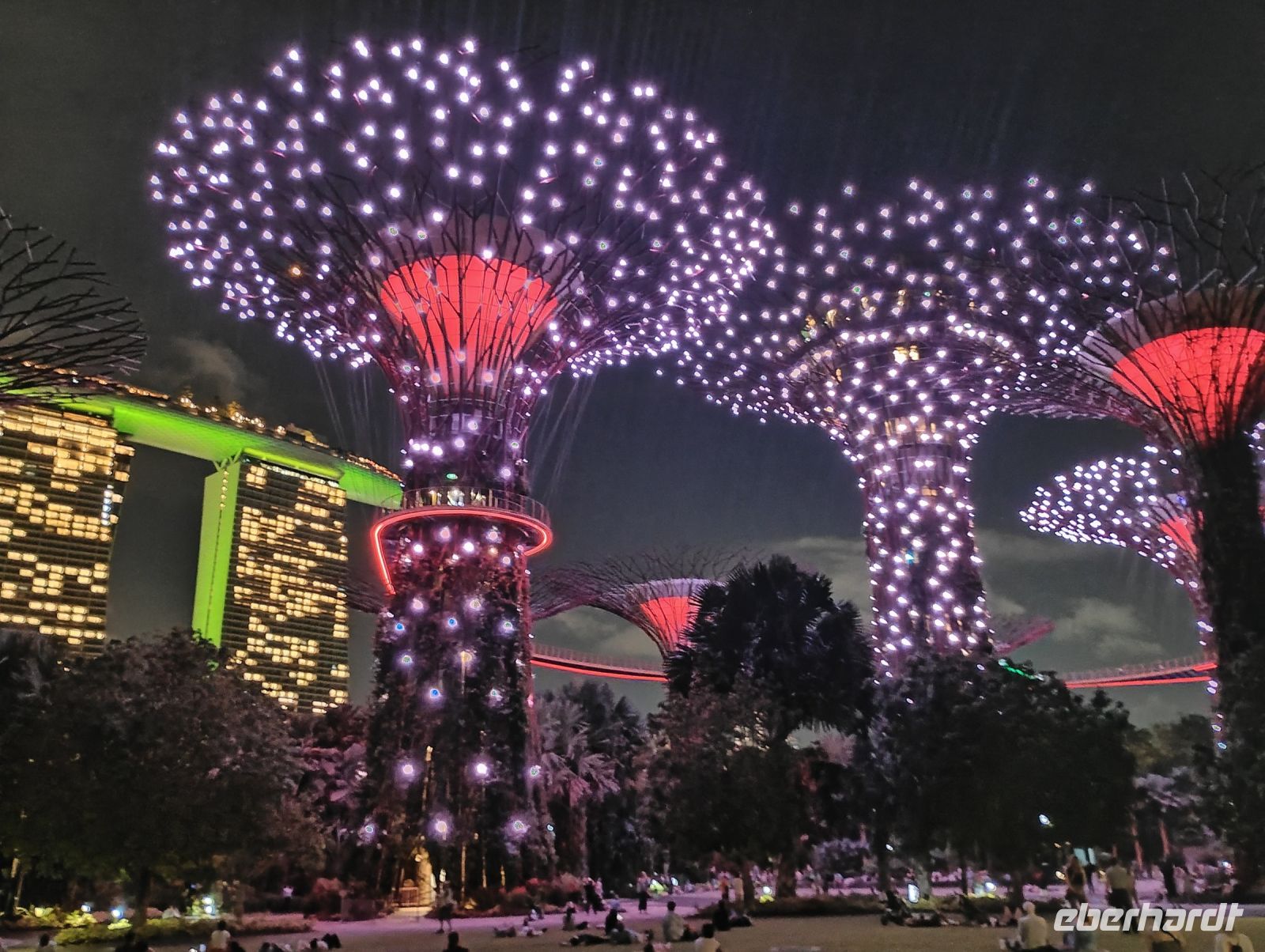 Um auch die nächste Inszenierung nicht zu verpassen, setzten wir unseren Weg zügig fort und erreichten die Gardens by the Bay, wo die berühmten Supertrees in einer faszinierenden Licht- und Musikshow zum Leben erwachten – ein wahrhaft magisches Erlebnis.