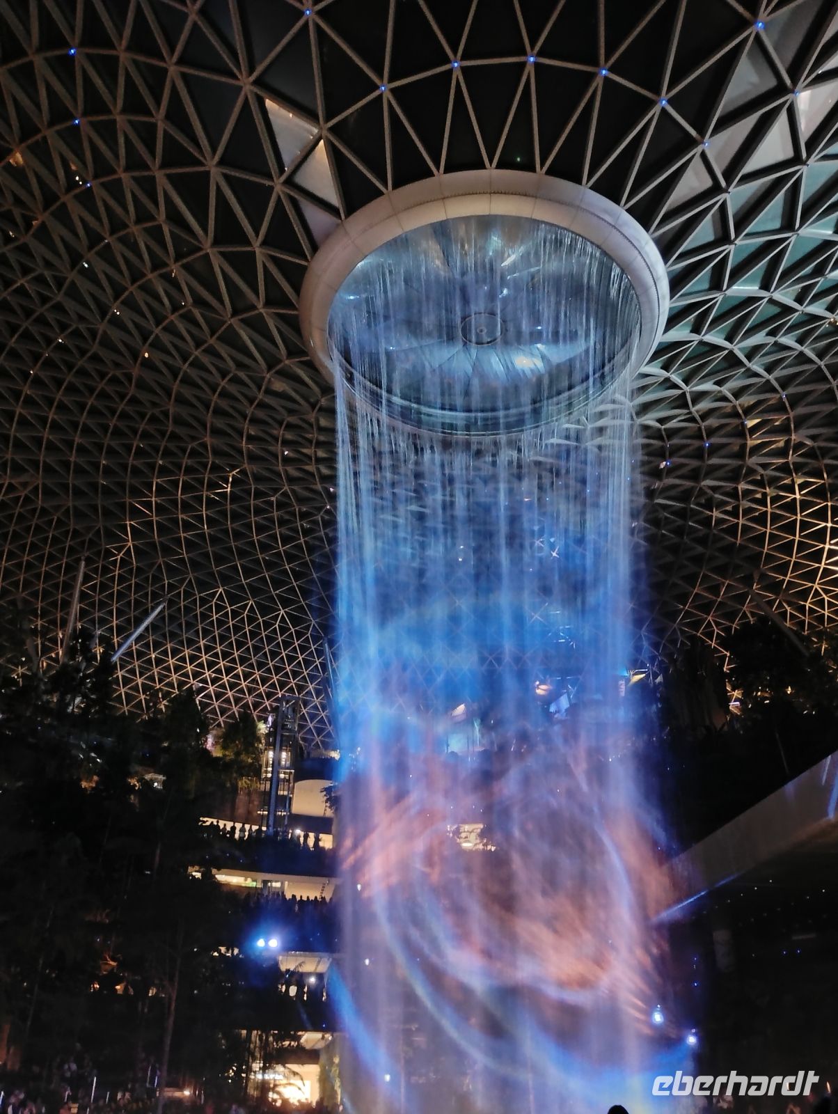 Am Abend erreichten wir den Changi Airport. Bevor unser Flug nach Neuseeland startete, nutzten wir die Gelegenheit, den spektakulären Indoor-Wasserfall „The Jewel“ zu bestaunen. Mit seinen 40 Metern Höhe und der atemberaubenden Lichtshow bildet er das Herzstück eines riesigen Einkaufs- und Freizeitkomplexes innerhalb des Flughafens.