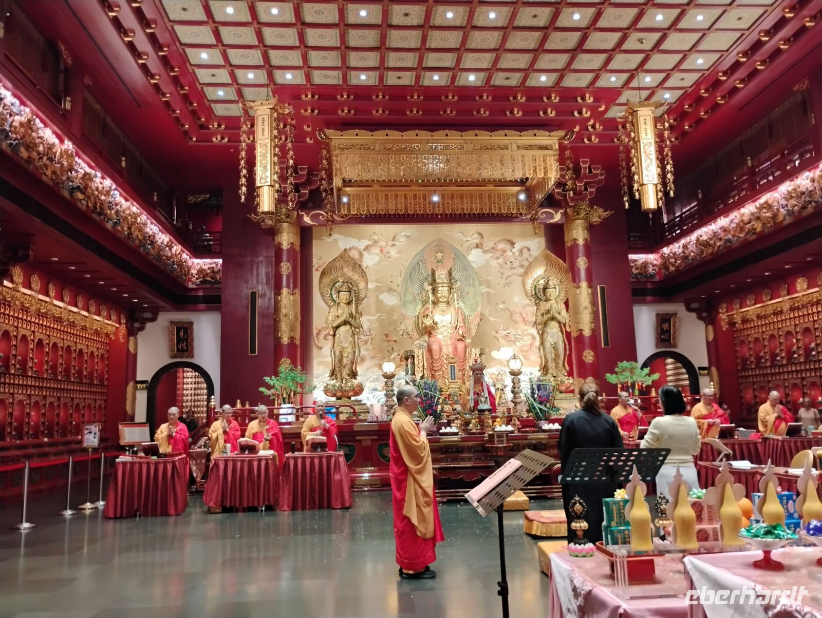 Unser nächstes Ziel war Chinatown, ein Viertel voller Leben, in dem sich kleine Garküchen, traditionelle Tempel und nette Geschäfte aneinanderreihen. Malcolm, unser lokaler Stadtführer, ließ uns dort einen typischen Snack kosten und gleich darauf besuchten wir den prächtigen Buddha Tooth Relic Tempel, in dem angeblich ein Zahn Buddhas aufbewahrt wird. Hier konnten wir einen Einblick in den buddhistischen Glauben gewinnen und beobachteten die Gläubigen bei ihren Gebeten und der Darlegung von Opfergaben.