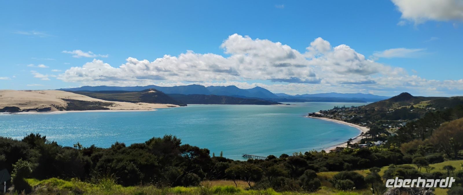 Dann ging es weiter Richtung Paihia, das Herz der Bay of Islands. Unterwegs hielten wir kurz am Pakia Hill, um die beeindruckenden Sanddünen auf der gegenüberliegenden Seite der Bucht zu bestaunen. Genau dort überraschte ich die Gruppe mit einer Flasche Sekt und ANZAC-Biskuits – eine kleine Geste, um gemeinsam mit Blick auf die Dünen auf den Reisebeginn anzustoßen. Diese traditionellen Kekse gehen auf den Ersten Weltkrieg zurück, als sie von den Angehörigen für die Soldaten der Australian and New Zealand Army Corps (ANZAC) gebacken wurden, weil sie lange haltbar waren. (Passend, da uns Alec am Tag zuvor am Kriegerdenkmal in Auckland etwas über den wichtigen ANZAC-Day erzählt hatte).
