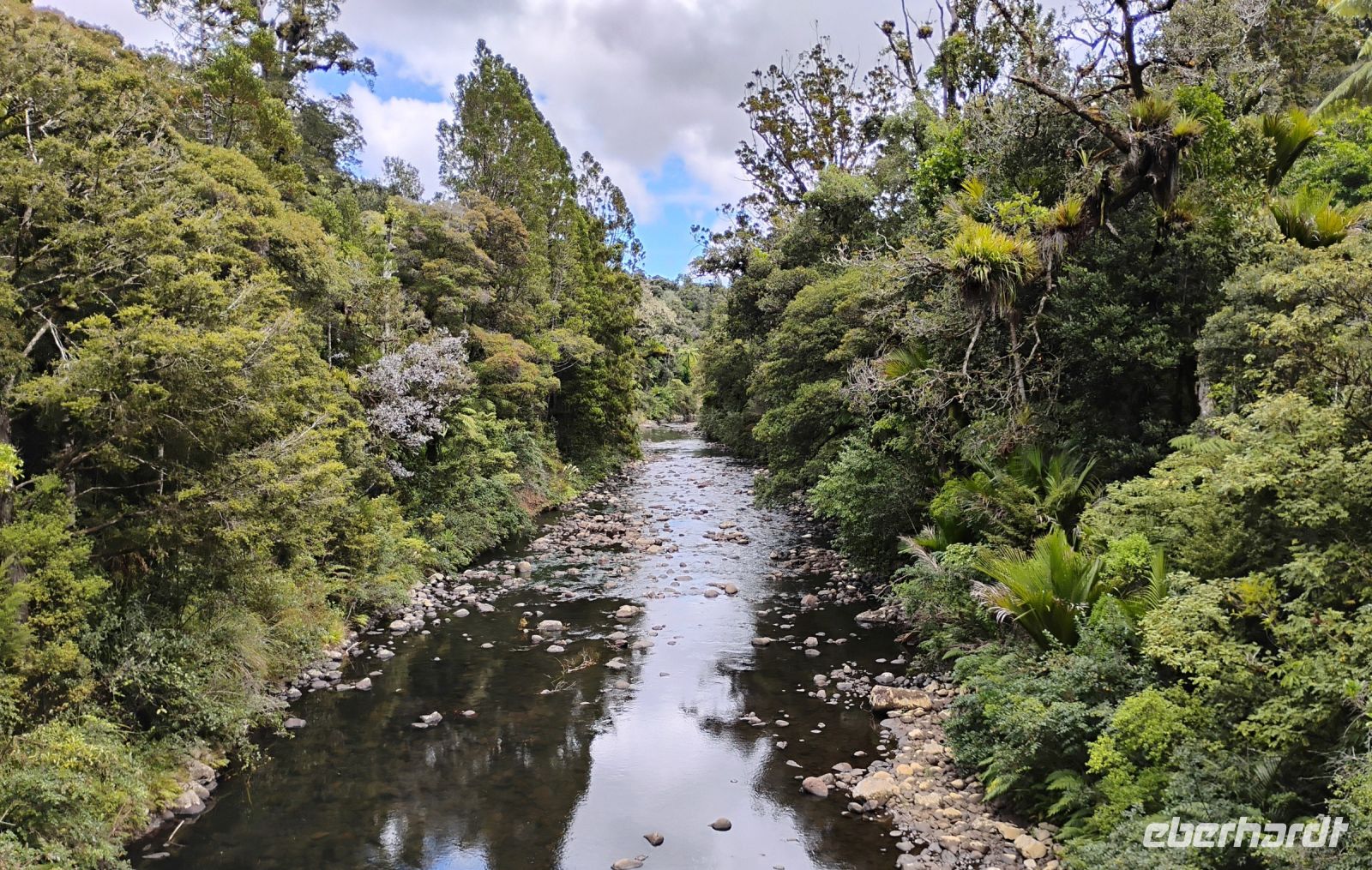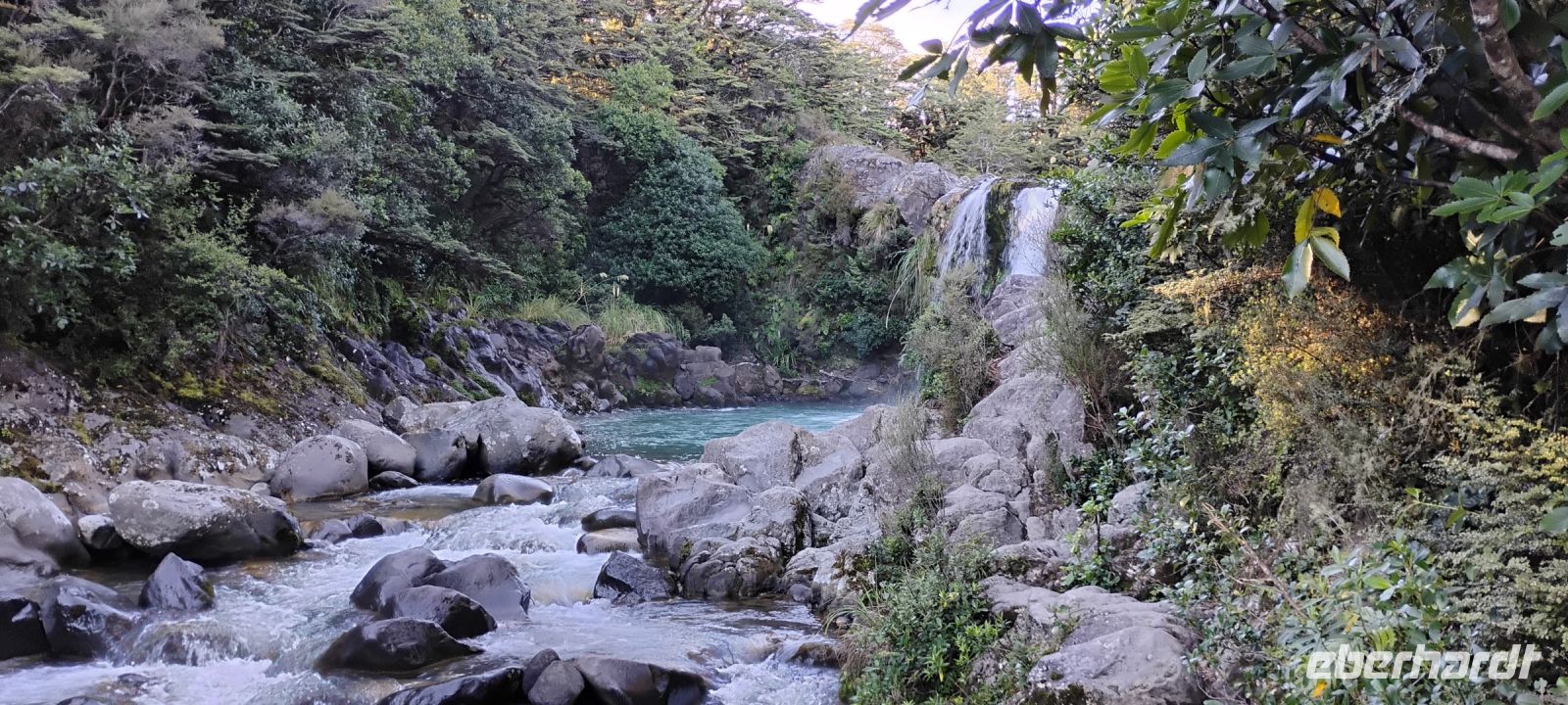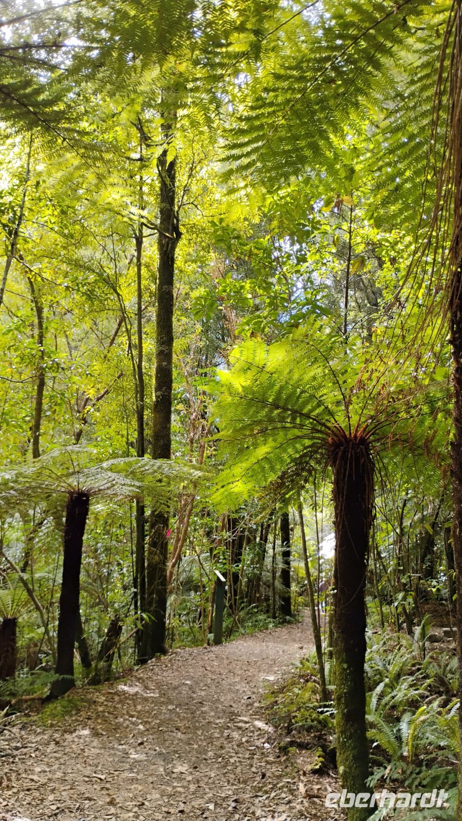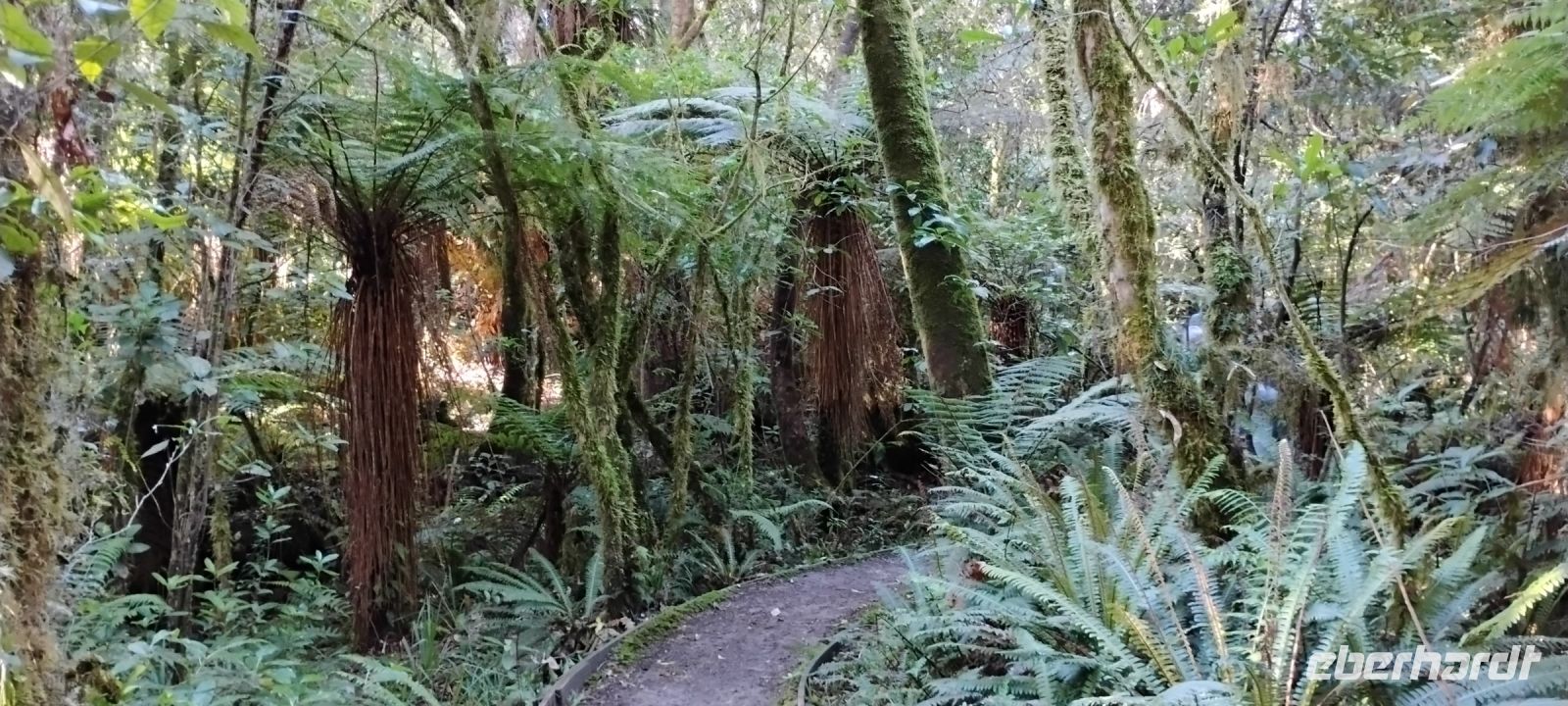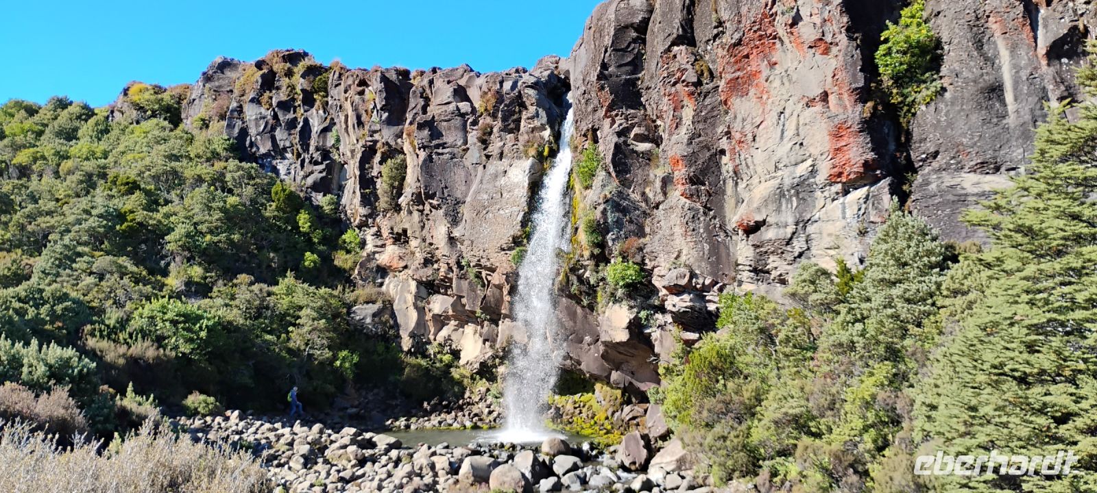 Die ersten drei Kilometer liefen wir gemeinsam auf einem wunderschönen Wanderweg, der uns durch einen dichten Wald und entlang eines plätschernden Baches führte. Unser erster Höhepunkt war der malerische Taranaki-Wasserfall, dessen Wassermassen sich spektakulär über eine Felskante in die Tiefe stürzen.