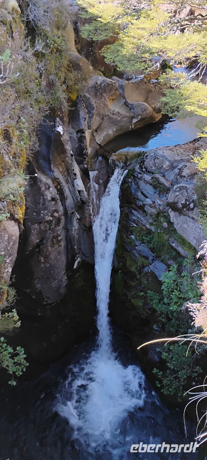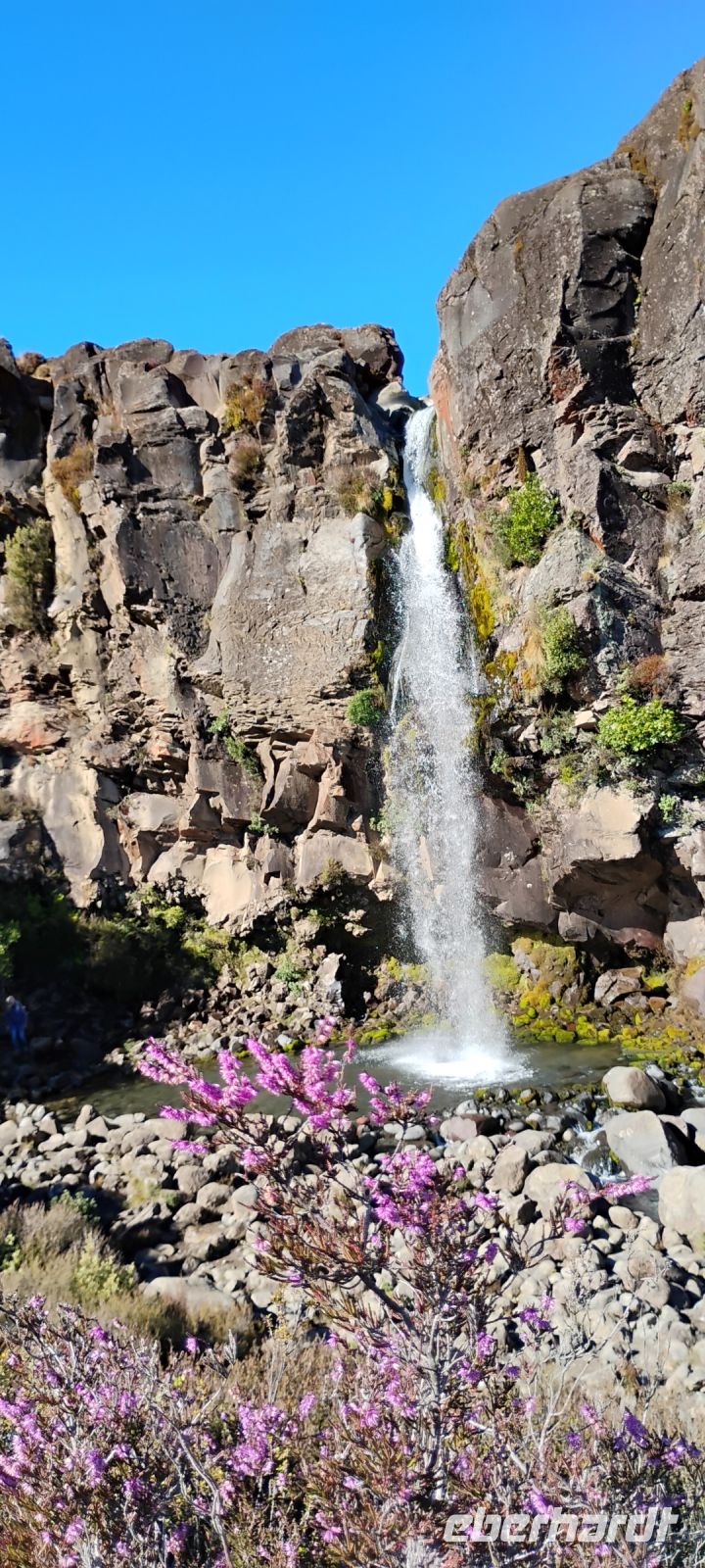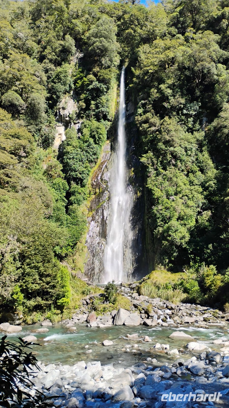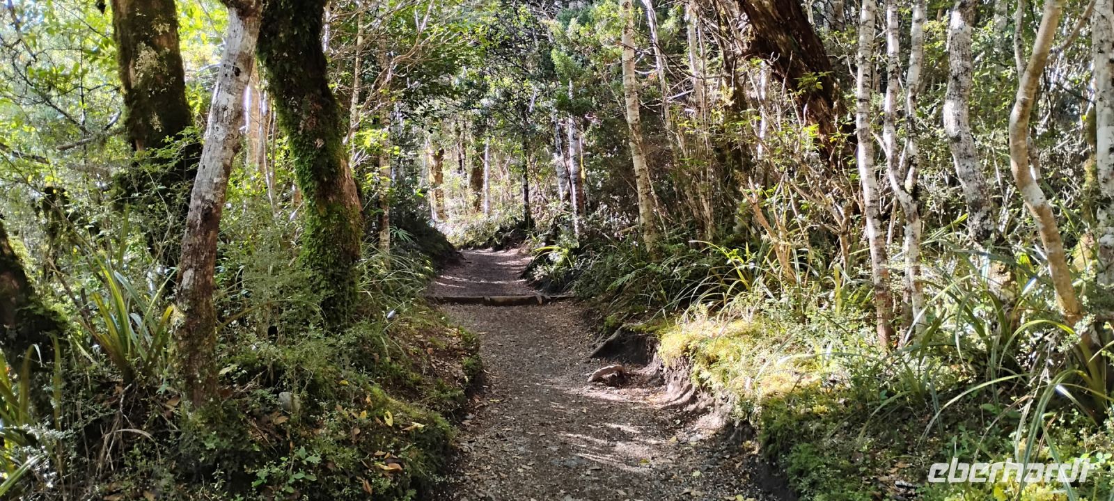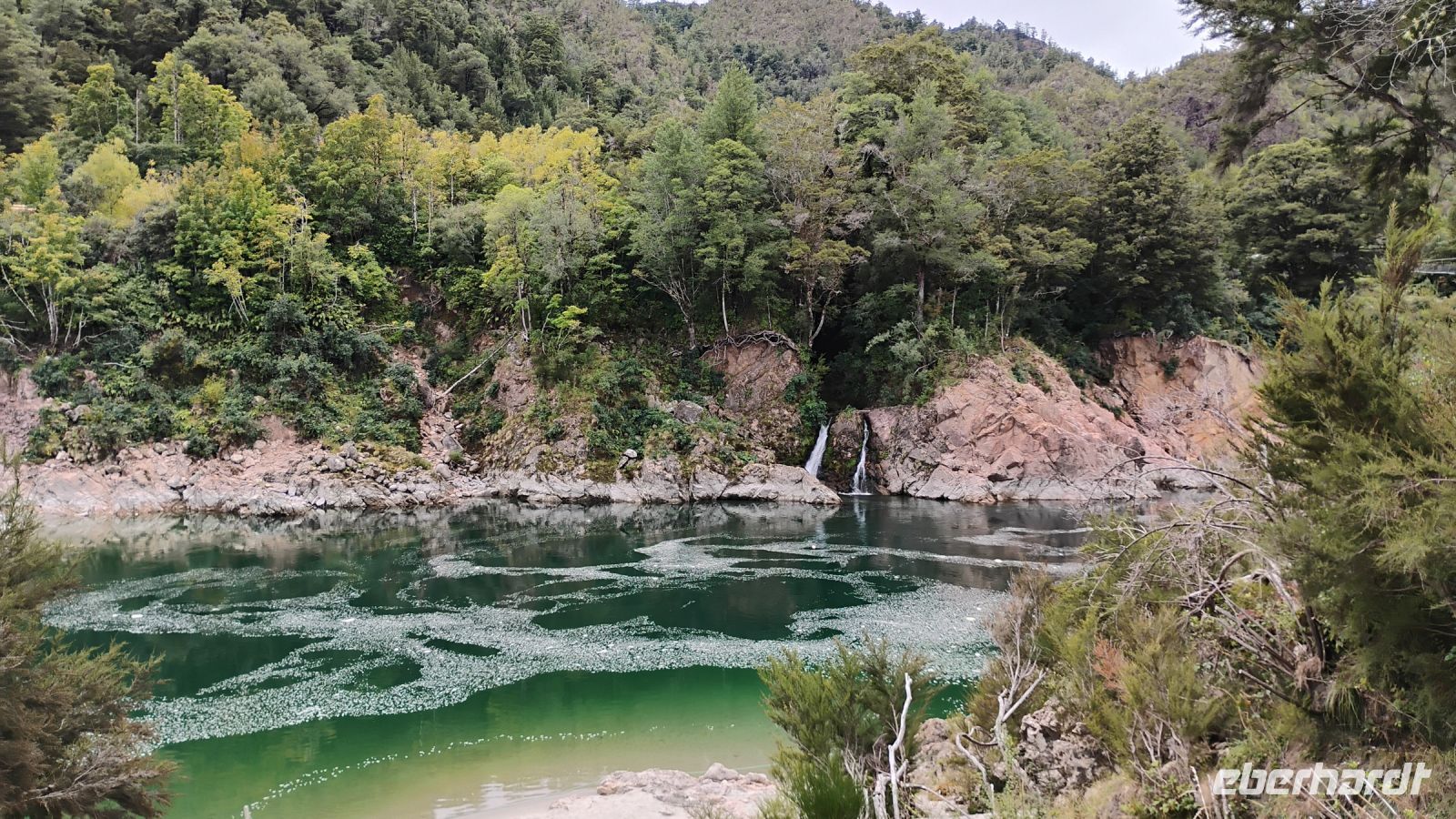 Die ersten drei Kilometer liefen wir gemeinsam auf einem wunderschönen Wanderweg, der uns durch einen dichten Wald und entlang eines plätschernden Baches führte. Unser erster Höhepunkt war der malerische Taranaki-Wasserfall, dessen Wassermassen sich spektakulär über eine Felskante in die Tiefe stürzen.