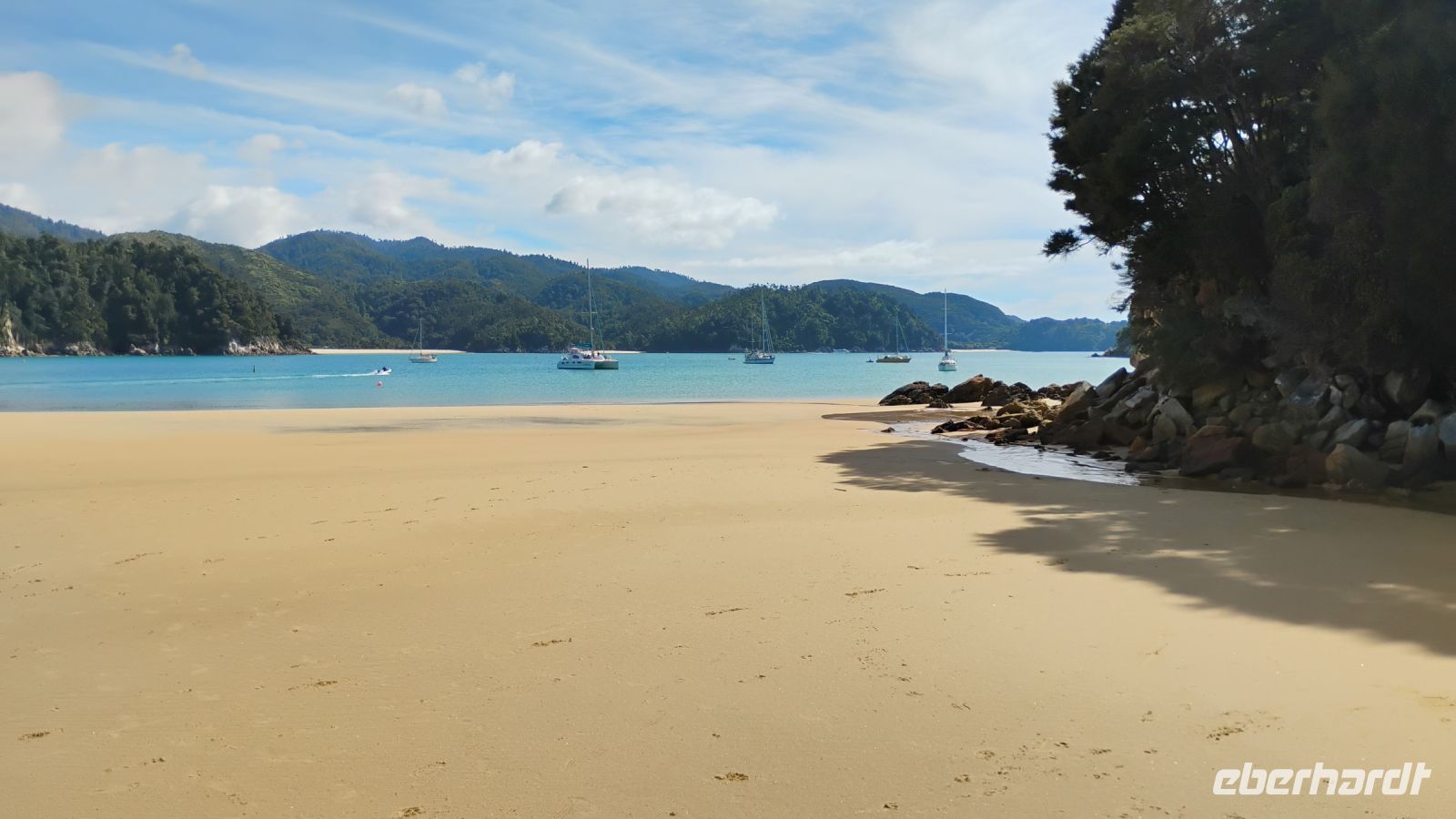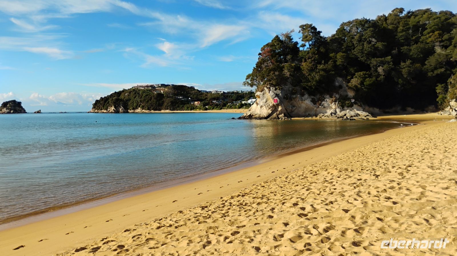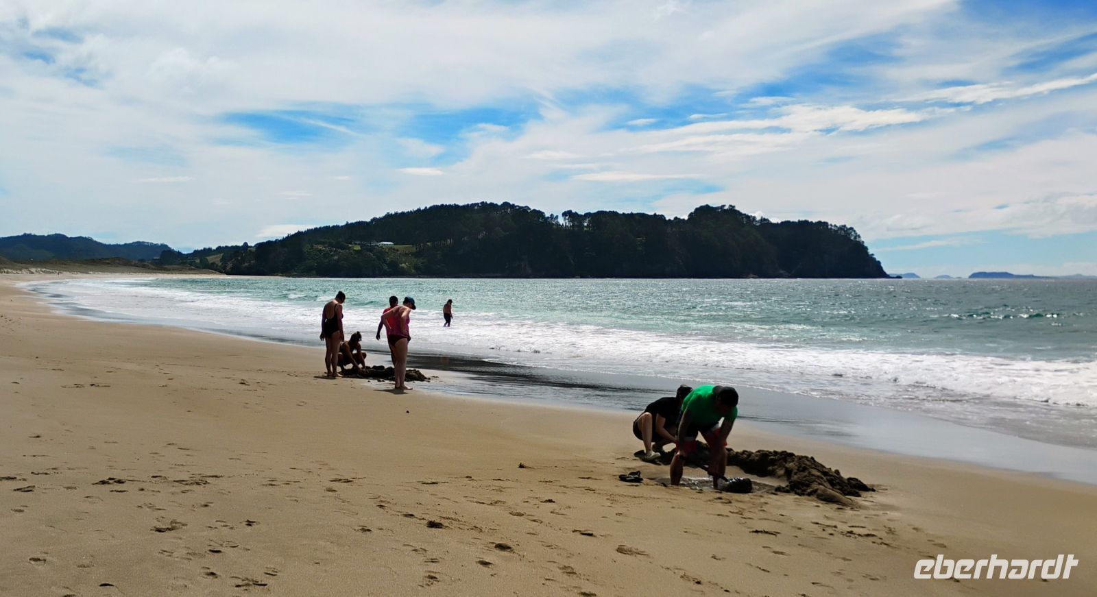Zur Mittagspause hielten wir in einem Café in Hahei, bevor wir zu den berühmten Hot Water Springs weiterfuhren. Hier sprudelt heißes Thermalwasser direkt von unten aus dem Sand. Andere Besucher hatten bereits kleine Becken gegraben. Es war faszinierend, die Füße in den warmen Sand zu stecken – allerdings war es an manchen Stellen so heiß, dass wir sofort wieder herausmussten!
