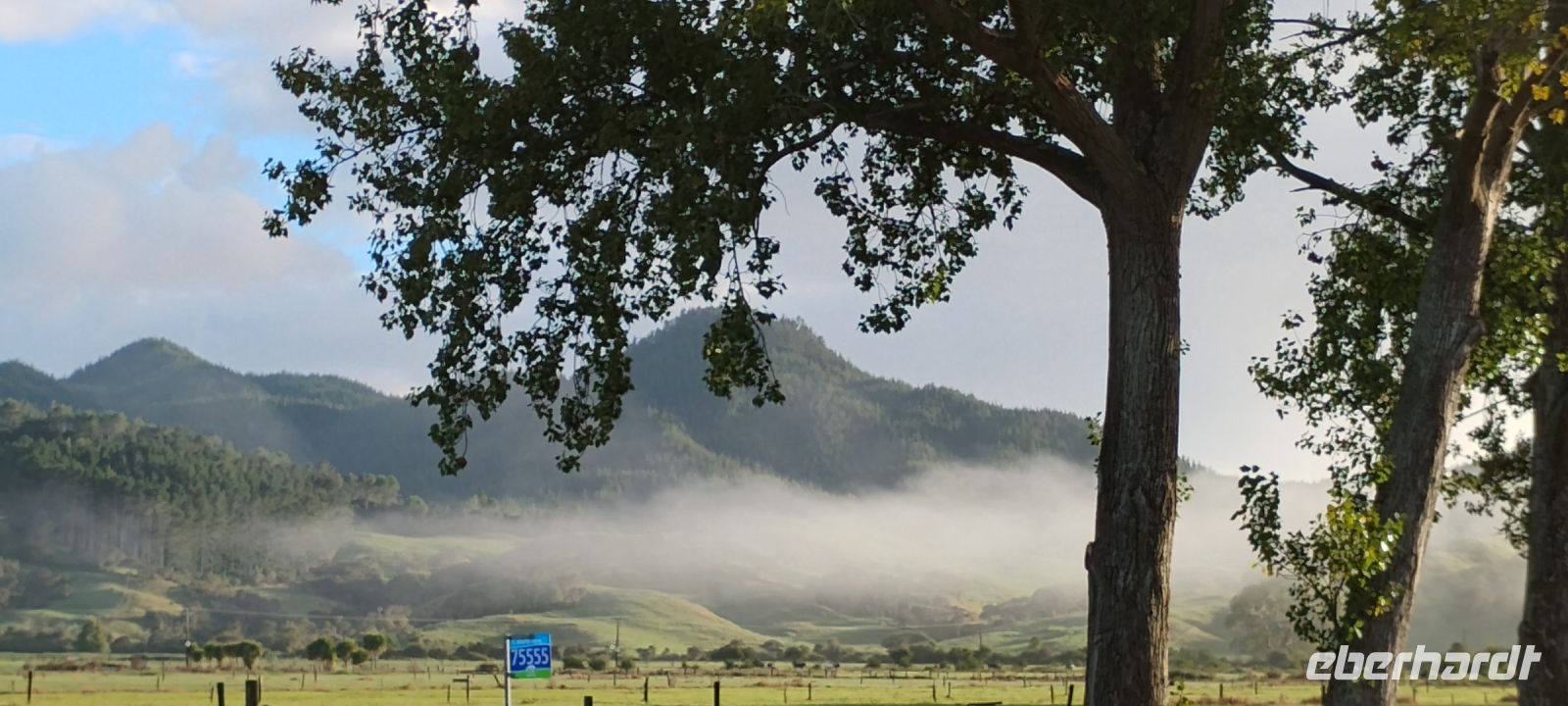 Die Mehrheit entschied sich für das Abenteuer nach Cape Reinga und den legendären Strand. Pünktlich um 7:20 Uhr wurden wir von unserem Reisebus abgeholt. Zusammen mit internationalen Mitreisenden begaben wir uns auf die Fahrt durch eine atemberaubende Landschaft. Die aufgehende Sonne tauchte die hügelige Umgebung in ein magisches Licht – saftige Wiesen mit Kühen und Schafen wechselten sich ab mit nebelverhangenen Tälern und dichten Wäldern. Manchmal fühlte man sich an die sanften Hügel der Toskana erinnert, dann wieder an die Schweiz, Irland oder Deutschland – die Landschaft wandelte sich ständig und zeigte sich in immer neuen Facetten.