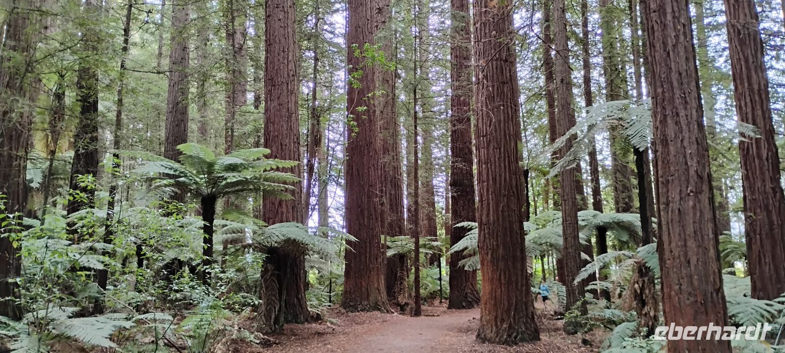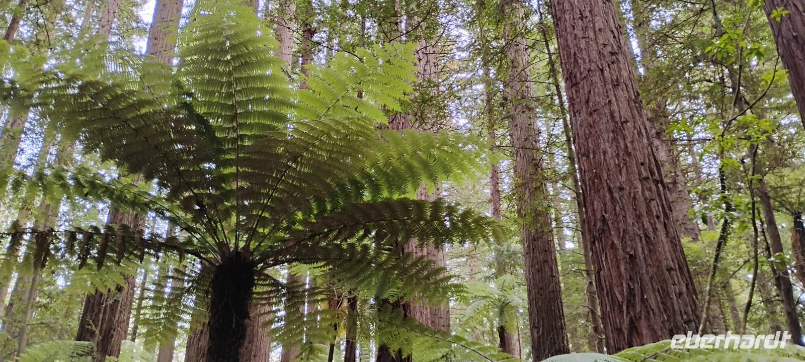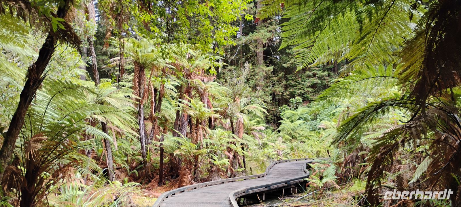 Am Nachmittags erreichten wir schließlich Rotorua, eine Stadt, die seit den 1880er-Jahren als Kur- und Erholungsort bekannt ist. Schon beim ersten Spaziergang durch die Parkanlage bemerkten wir den typischen Schwefelgeruch, der durch die geothermische Aktivität der Region entsteht. Danach besuchten wir einen nahegelegenen Wald mit beeindruckenden Sequoia-Bäumen und riesigen Farnen. Obwohl das Wetter ab Mittag etwas umgeschlagen hatte und es gelegentlich nieselte, hatten wir Glück – immer dann, wenn es wichtig war, hielt es trocken.
