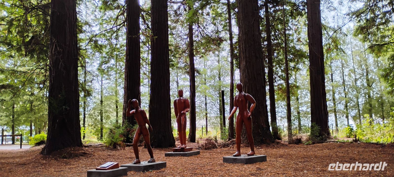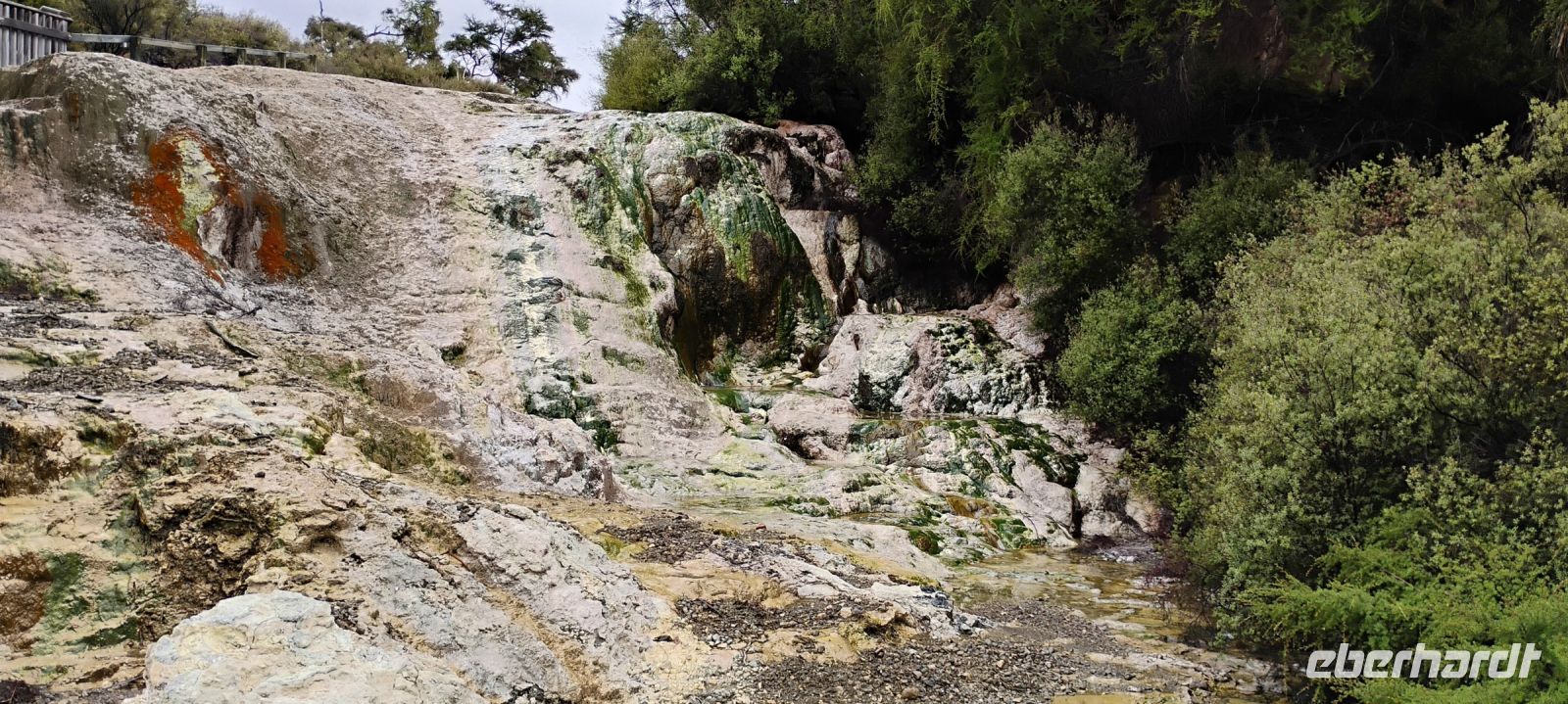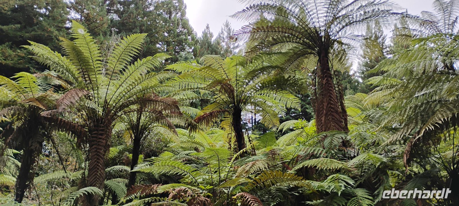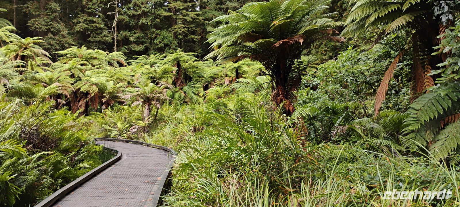 Am Nachmittags erreichten wir schließlich Rotorua, eine Stadt, die seit den 1880er-Jahren als Kur- und Erholungsort bekannt ist. Schon beim ersten Spaziergang durch die Parkanlage bemerkten wir den typischen Schwefelgeruch, der durch die geothermische Aktivität der Region entsteht. Danach besuchten wir einen nahegelegenen Wald mit beeindruckenden Sequoia-Bäumen und riesigen Farnen. Obwohl das Wetter ab Mittag etwas umgeschlagen hatte und es gelegentlich nieselte, hatten wir Glück – immer dann, wenn es wichtig war, hielt es trocken.