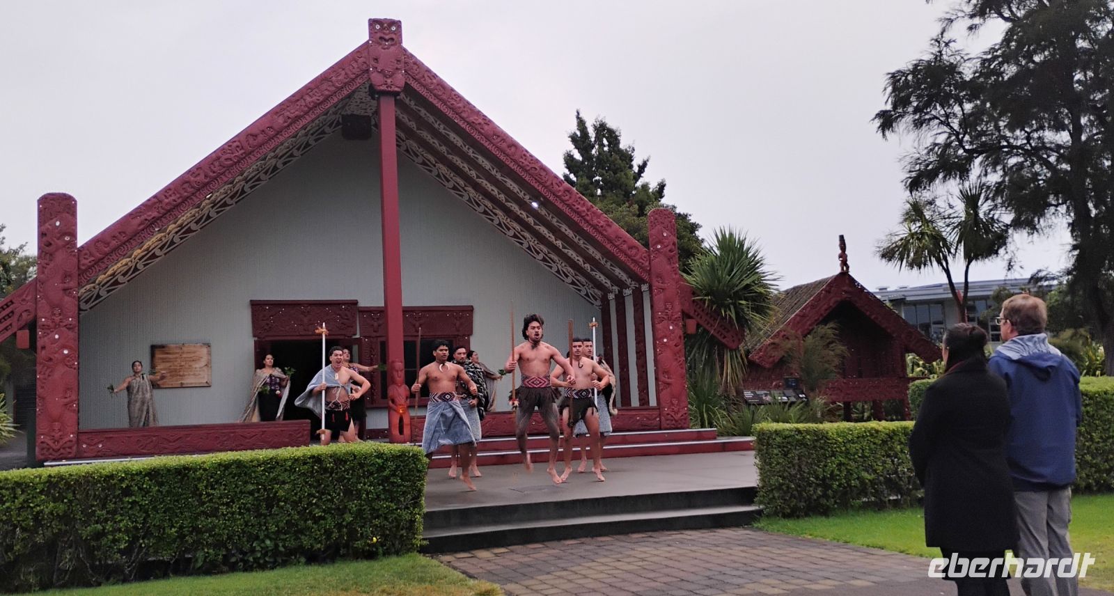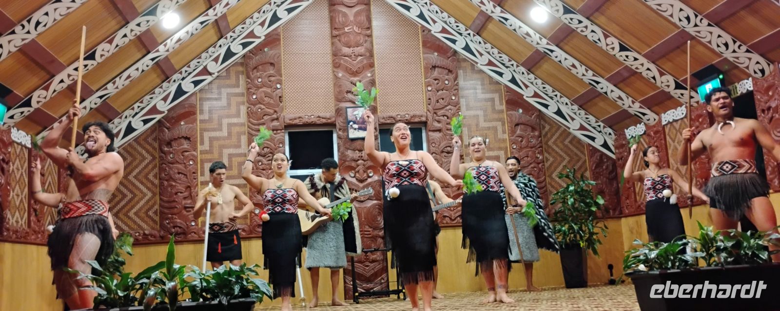 Danach hatten wir die Gelegenheit, die Maori-Kultur näher kennenzulernen. Wir wurden traditionell begrüßt – mit einer Wero, der Herausforderung durch einen Maori-Krieger. Er führte einen beeindruckenden Tanz mit schnellen, kraftvollen Bewegungen auf und legte als Zeichen des Friedens ein Blatt nieder. Unser Gruppenvertreter durfte es aufheben, womit er zeigte, dass wir in friedlicher Absicht kamen. Danach sangen die Maori-Frauen ein Lied – denn am Ende sind es die Frauen, die mit ihrem Gesang entscheiden, ob Gäste willkommen sind oder nicht.