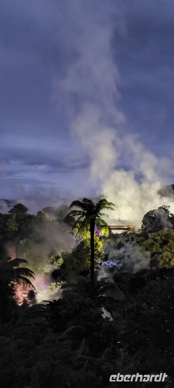 Nach dem Check-in in unserem Hotel stand am Abend ein besonderes Erlebnis auf dem Programm: der Besuch von Te Puia, einem kulturellen Zentrum der Maori. Zuerst genossen wir ein traditionelles Hangi-Buffet, bei dem die Speisen nach alter Maori-Tradition in Erdöfen gegart werden. Vor Ort konnten wir das Erdloch mit den heißen Steinen sehen, in dem Fleisch und Gemüse zubereitet wurden – (allerdings gab es beim Buffet natürlich auch viele andere Speisen, die nicht auf diese Weise gegart wurden.)