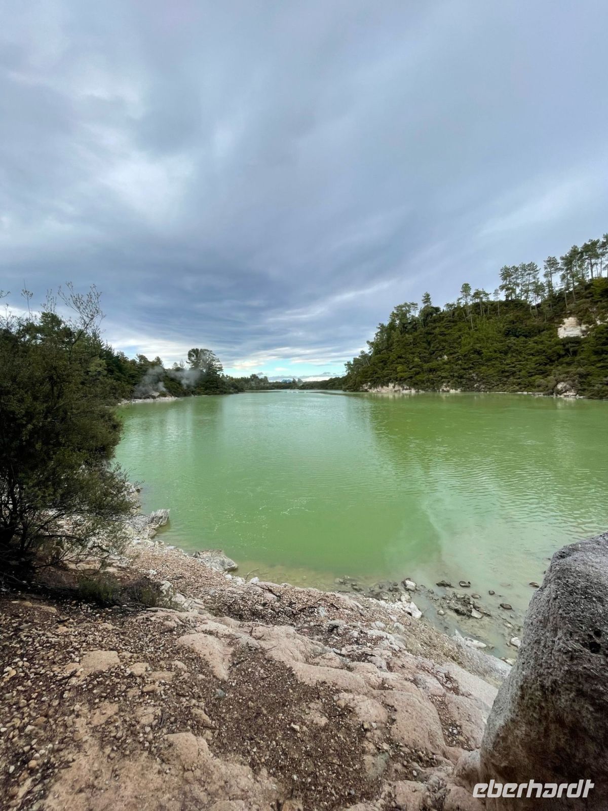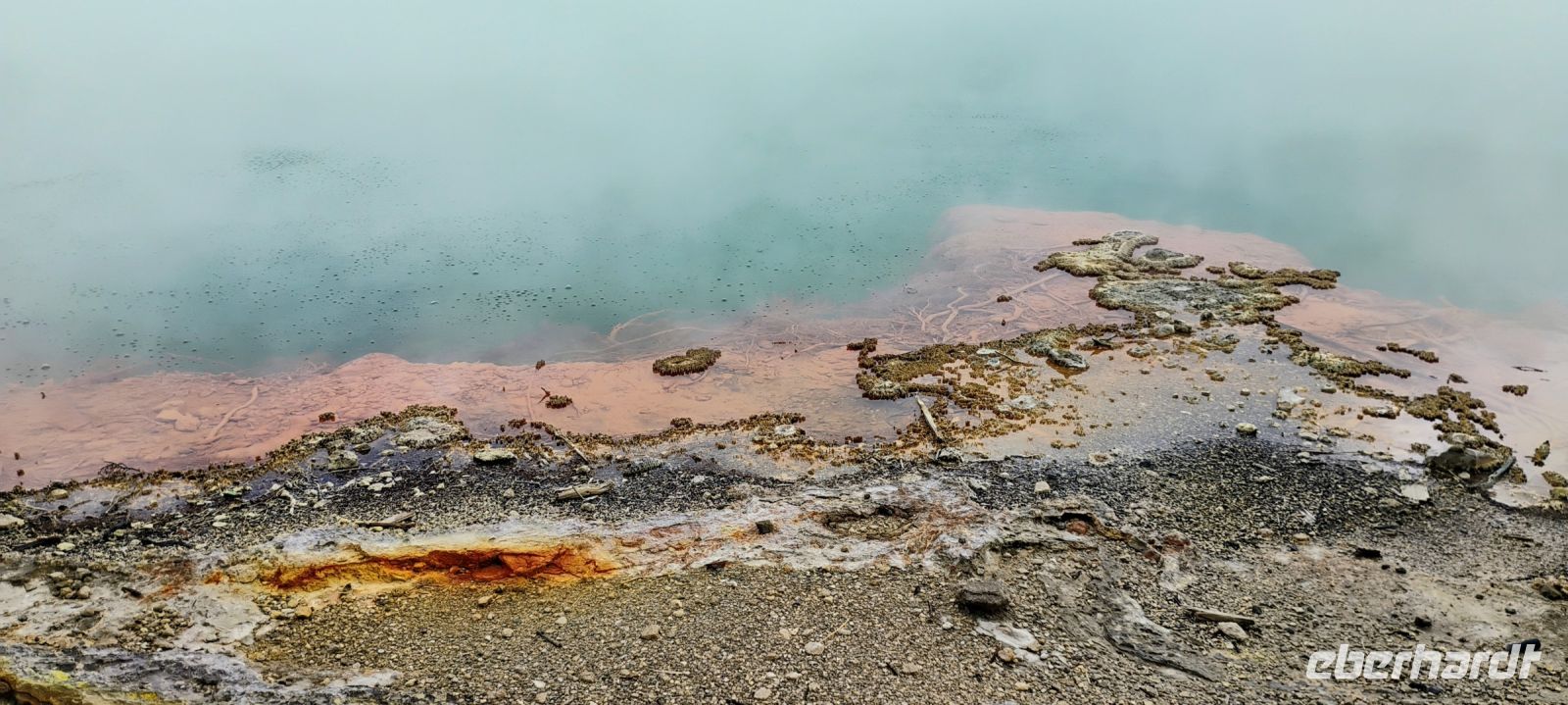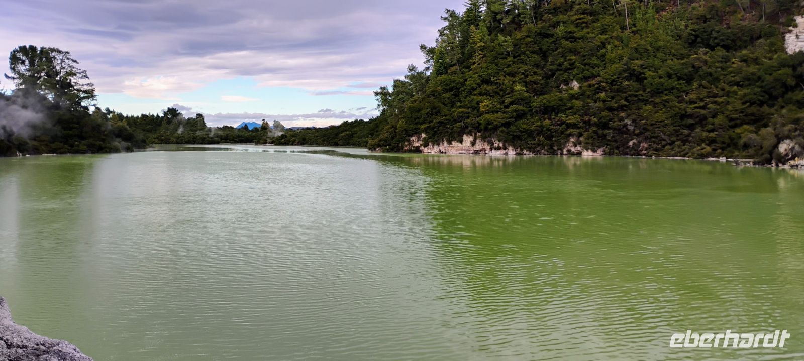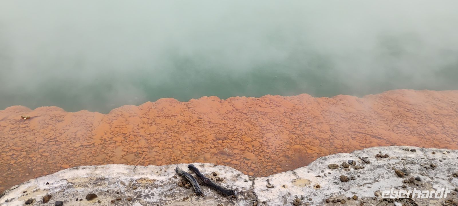 Auf dem Weg zu unserem ersten Stopp, dem Thermalgebiet von Wai-O-Tapu, ließen wir den Lady-Knox-Geysir bewusst links liegen. Da sein Ausbruch durch das Hinzufügen von Seife künstlich herbeigeführt wird und zahlreiche Touristen das Spektakel beobachten, erschien es uns wenig authentisch, weshalb wir uns entschieden, darauf zu verzichten. Stattdessen fuhren wir direkt zum Gebiet von Wai-O-Tapu, was in der Sprache der Maori „heiliges Wasser“ bedeutet. Die Landschaft hier beeindruckte mit intensiven Farben, die durch verschiedene Mineralien entstanden: Schwefel schimmerte in leuchtendem Gelb, Orpiment in Grün, während Eisenoxid kräftige Rottöne hinterließ. Wir nahmen uns ausreichend Zeit, das natürliche Farbenspiel der brodelnden Thermalquellen zu bestaunen.
