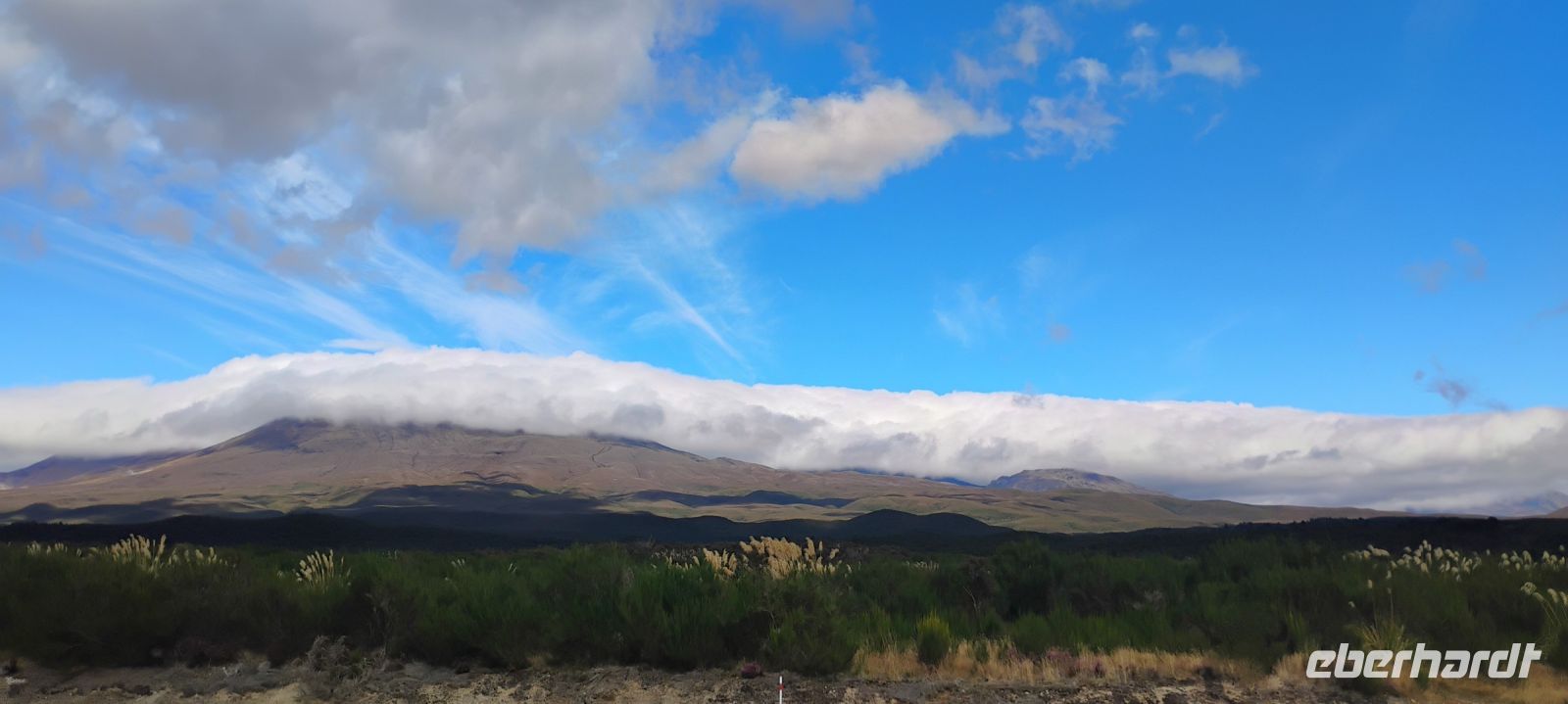Nach einer Mittagspause am Ufer des Taupo-Sees und mehreren Fotostopps entlang der Strecke setzten wir unsere Fahrt in Richtung Tongariro-Nationalpark fort. Immer wieder bot sich uns ein spektakulärer Blick auf den Mount Tongariro und die umliegenden Vulkane. Besonders beeindruckend war die lange weiße Wolke, die sich über dem Vulkan erstreckte – ein Anblick, den wir alle auf Fotos festhielten. Sie erinnerte uns an den Maori-Namen für Neuseeland: Aotearoa – das „Land der langen weißen Wolke.“
