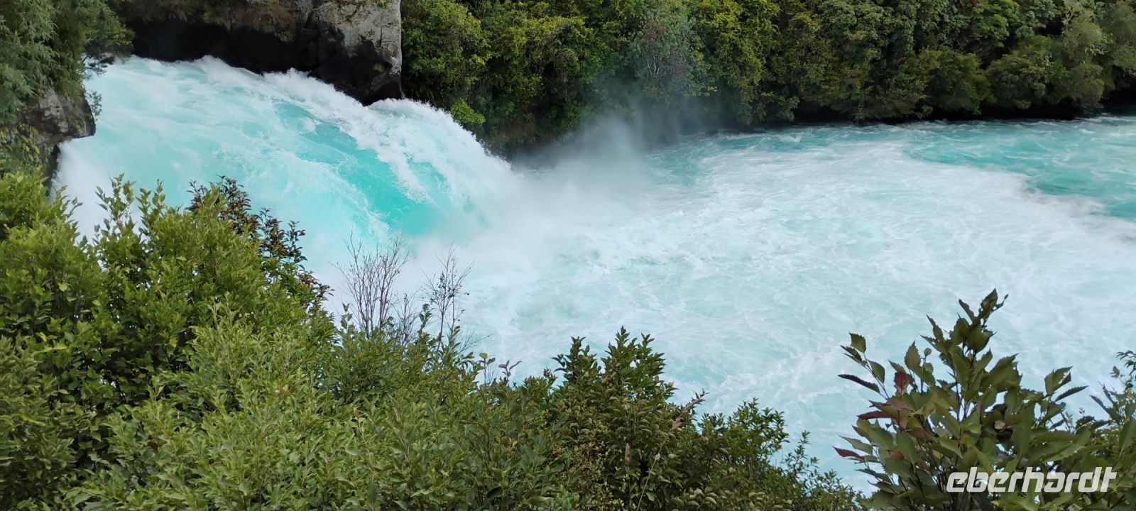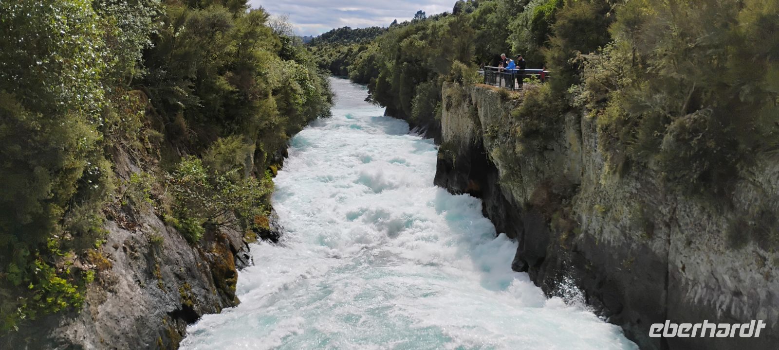 Als nächstes erreichten wir den Huka-Wasserfall in Taupo. Hier stürzen pro Sekunde etwa 220.000 Liter Wasser über eine neun Meter hohe Felswand in die Tiefe. Besonders beeindruckend war die Kraft, mit der das Wasser durch die enge Schlucht gepresst wurde, wodurch zahllose Luftblasen entstanden, die dem Wasser seine leuchtend türkisfarbene Schattierung verliehen. Die Maori nannten den Wasserfall deshalb „Huka“, was „Schaum“ bedeutet.